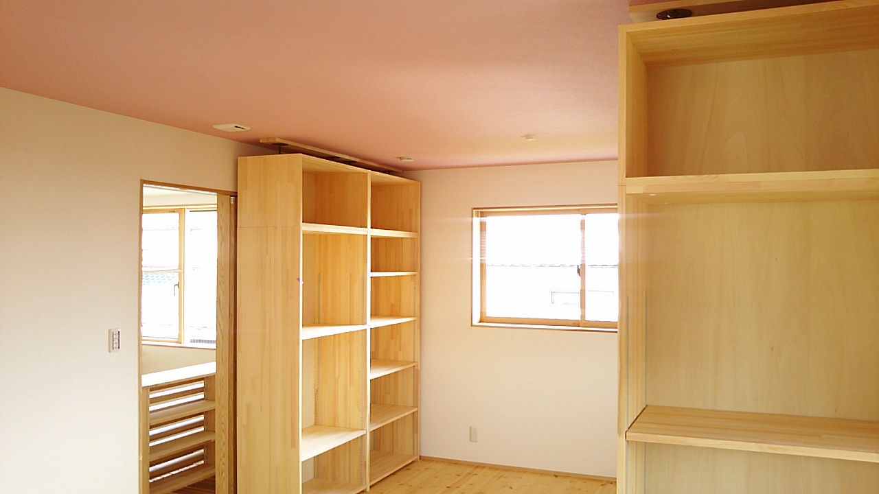 収納上部と天井の間にあるわずかな隙間を金具で突っ張っていますが、それを緩めることによって収納棚を移動できます。お子様が大きくなったらこの棚で2室に仕切り、独立して家を出たあと、再び1室にして使用することも可能。