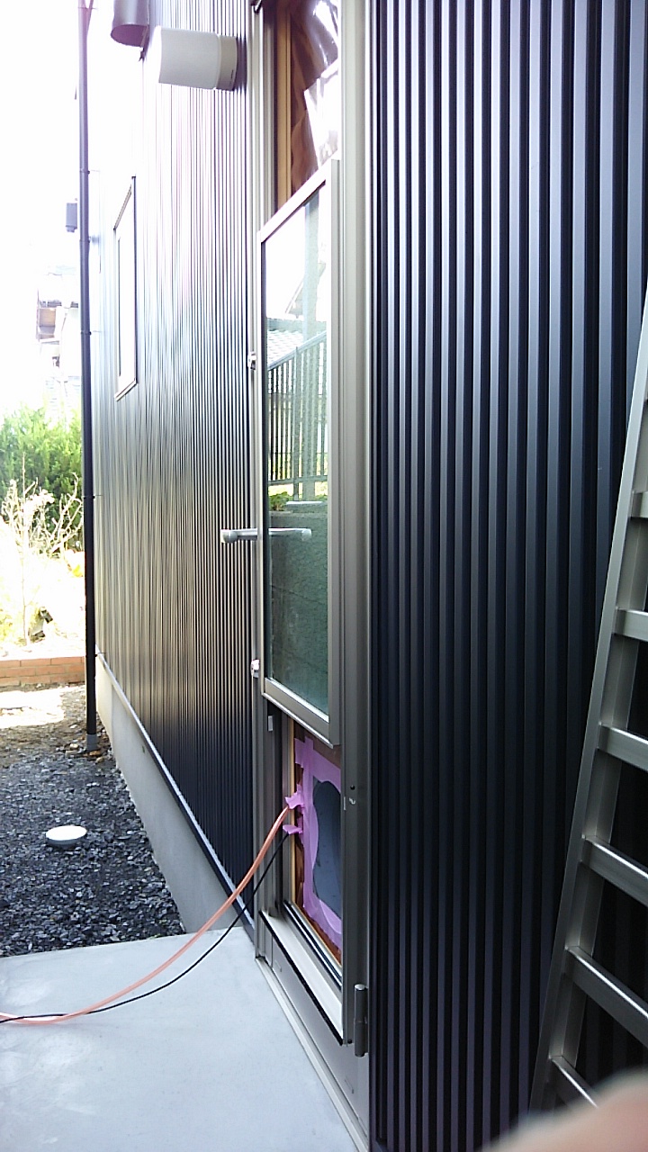 外壁工事開始。北面のガルバリウム鋼板が張られていっています。