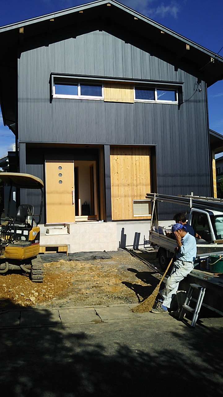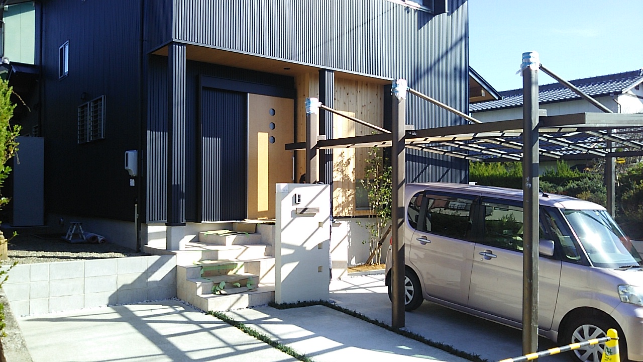 外壁が前面張り終わりました。落ち着いたブラックの外観に軒の木目調外装材や化粧母屋がアクセントです。