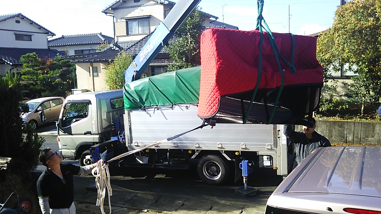 完成した住宅に、プラン時から計画されていたアップライトピアノが搬入されていきます。重そうです。