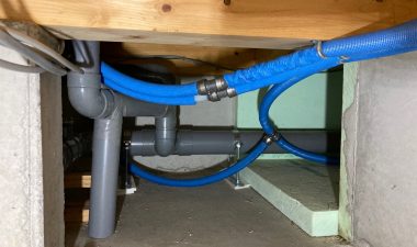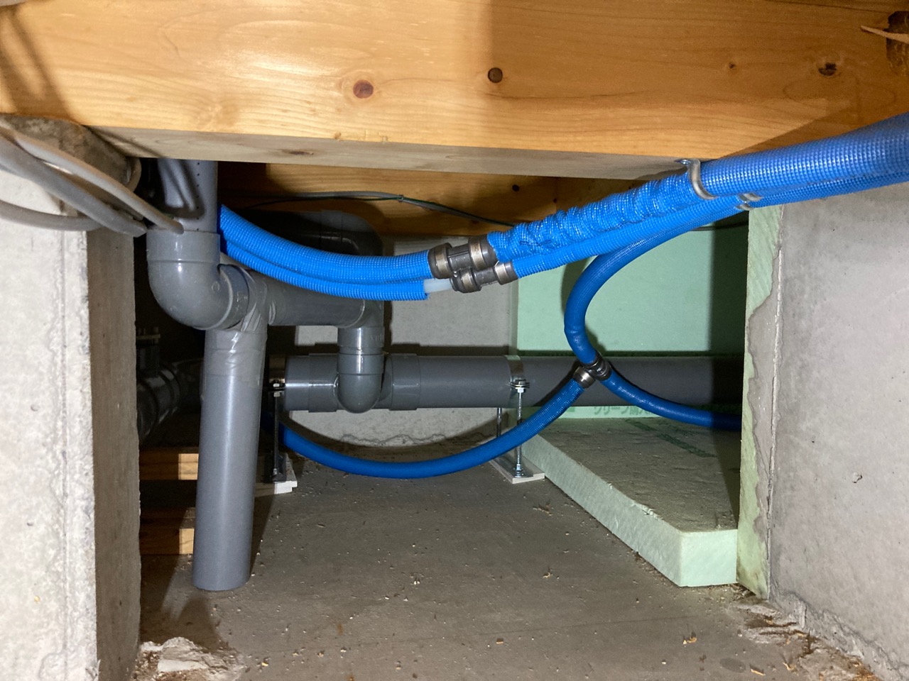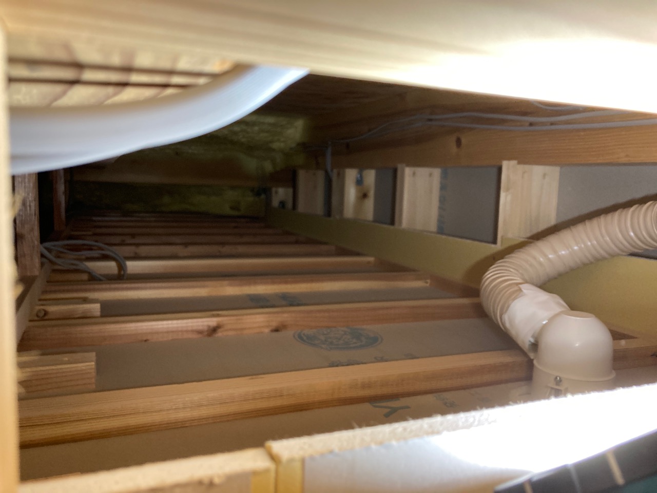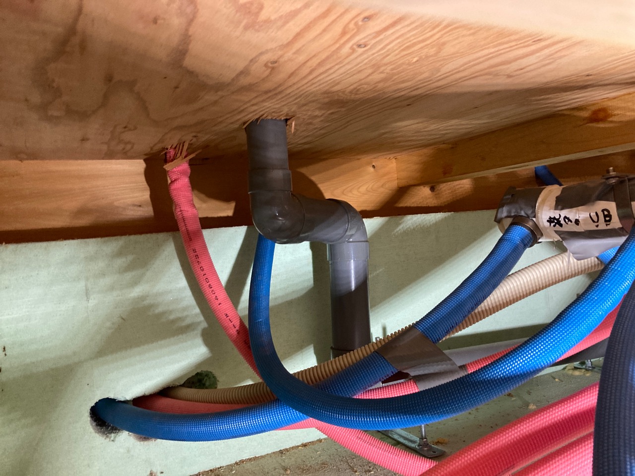 早速床下の点検に入りました。特に漏水などなくキレイな状態です。床下点検の際には車輪の付いた台車にうつぶせになって床下を進みますが、当時配管した給水、給湯配管が比較的低い部分を横断しているため、それらをかいくぐって進まなければなりません。こんなところで5年前の反省点が見つかりました。