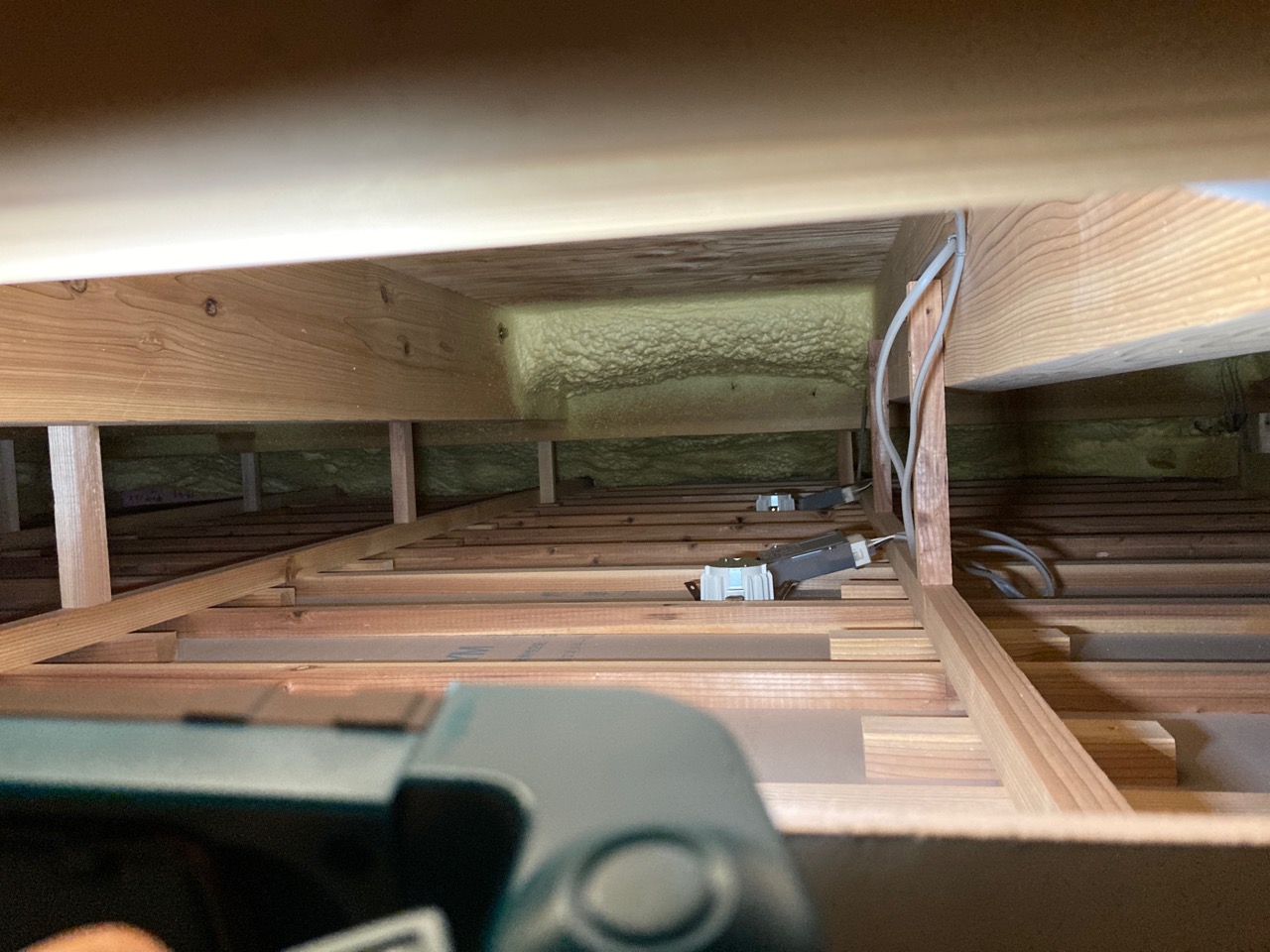 人が歩く音など、下階への音を吸音する目的で、2階床下地に石膏ボードを貼っています。
