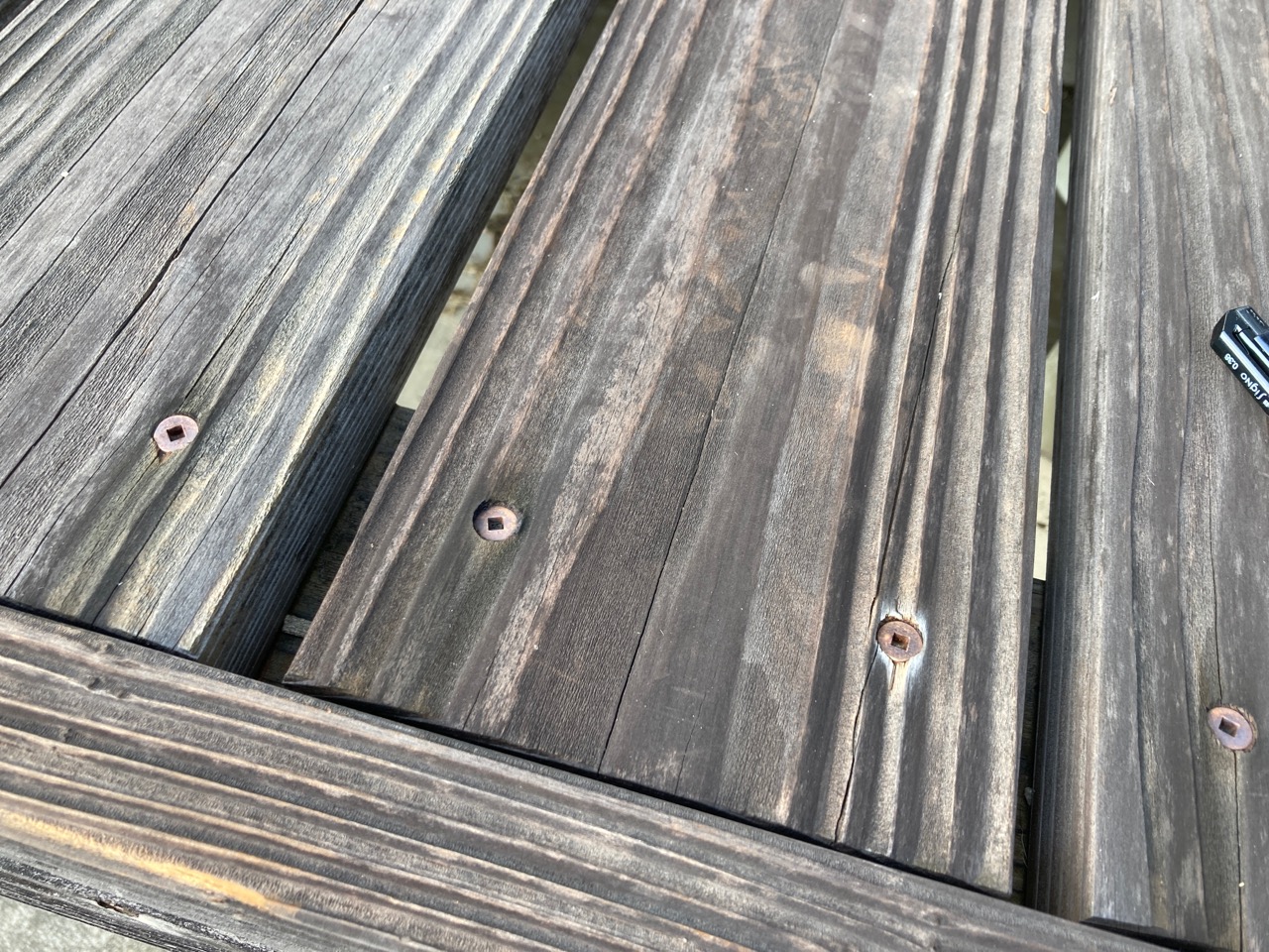 外部のウッドデッキは日に当たり、柔らかい目が痩せてすっかり浮造り状になりました。