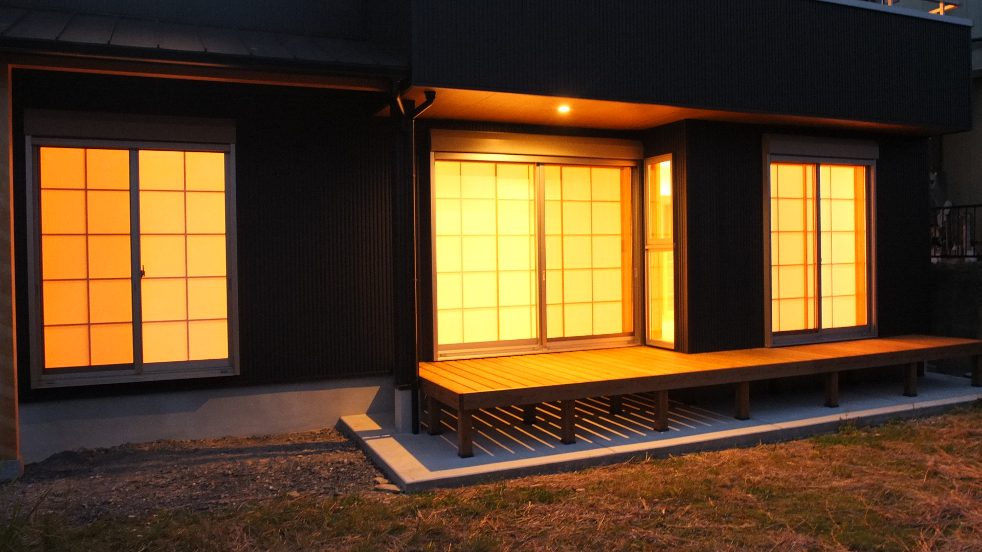 吉村障子から漏れる電球色の灯りが暖かみを感じさせます。