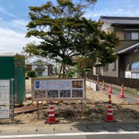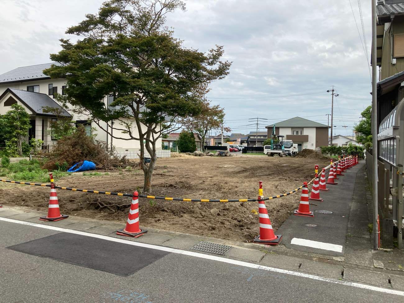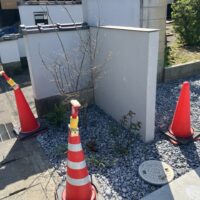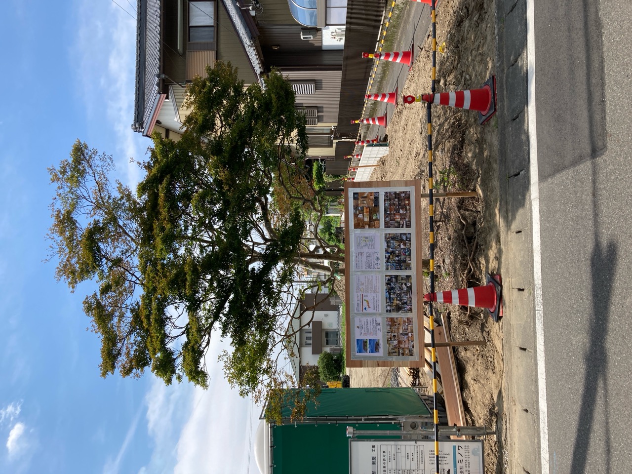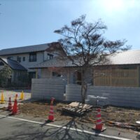 f様手配の造園業者さんによって道路沿いの旧ブロックが解体され、残った樹木等も伐採されました。敷地の北東に残る1本だけは新たな外構植栽のためにそのまま残しておこうという計画のようです。