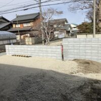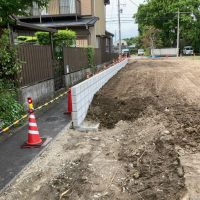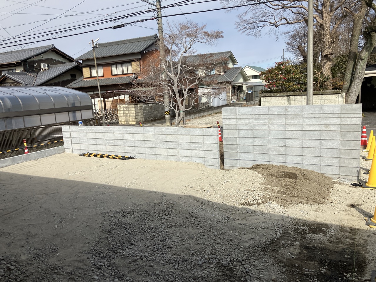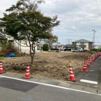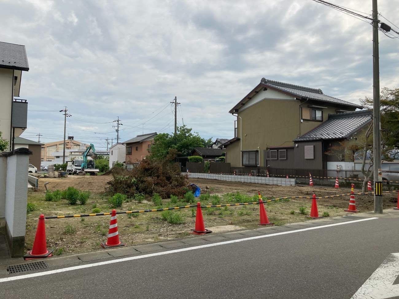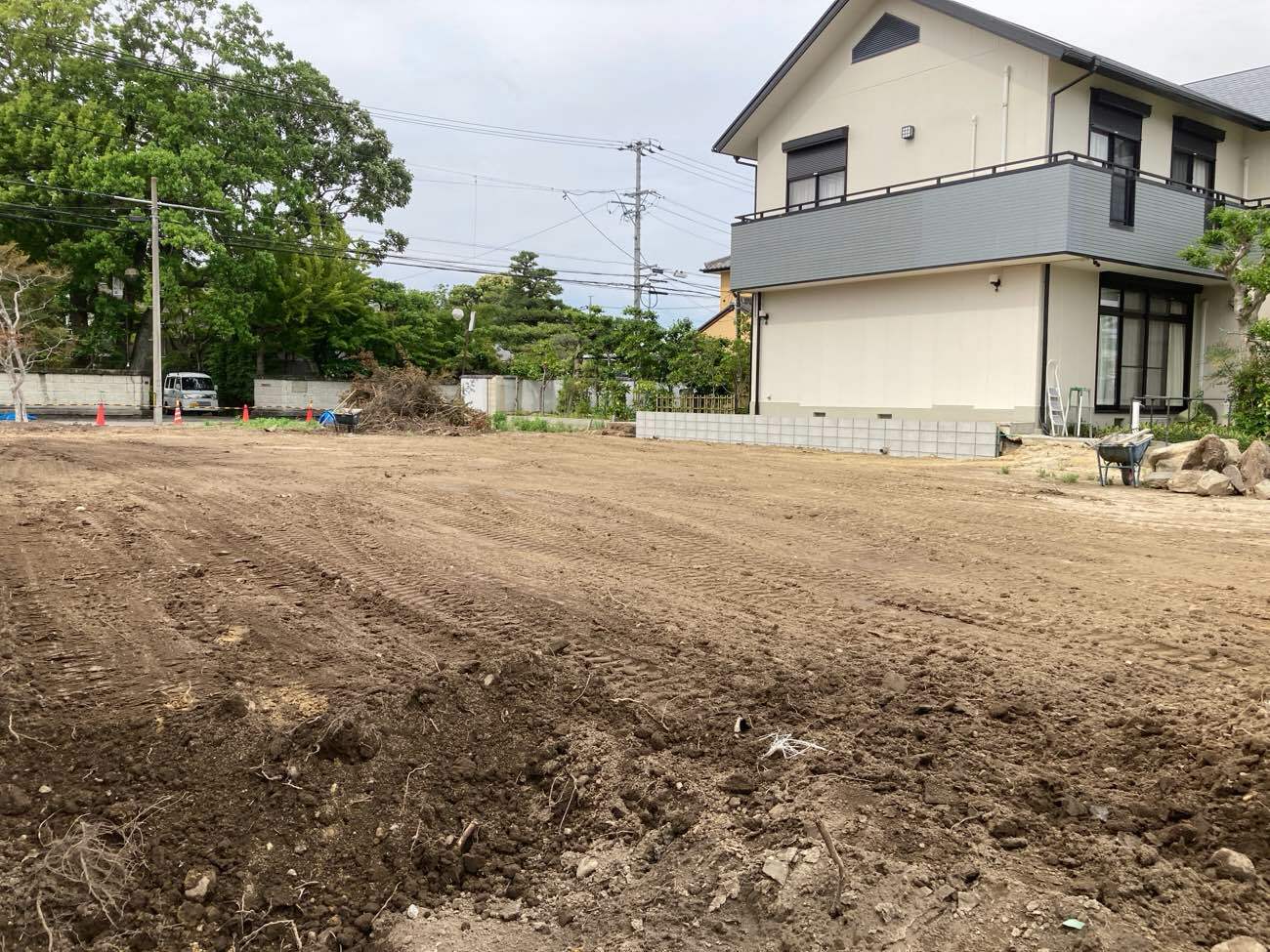 f様手配の造園業者さんによって道路沿いの旧ブロックが解体され、残った樹木等も伐採されました。敷地の北東に残る1本だけは新たな外構植栽のためにそのまま残しておこうという計画のようです。