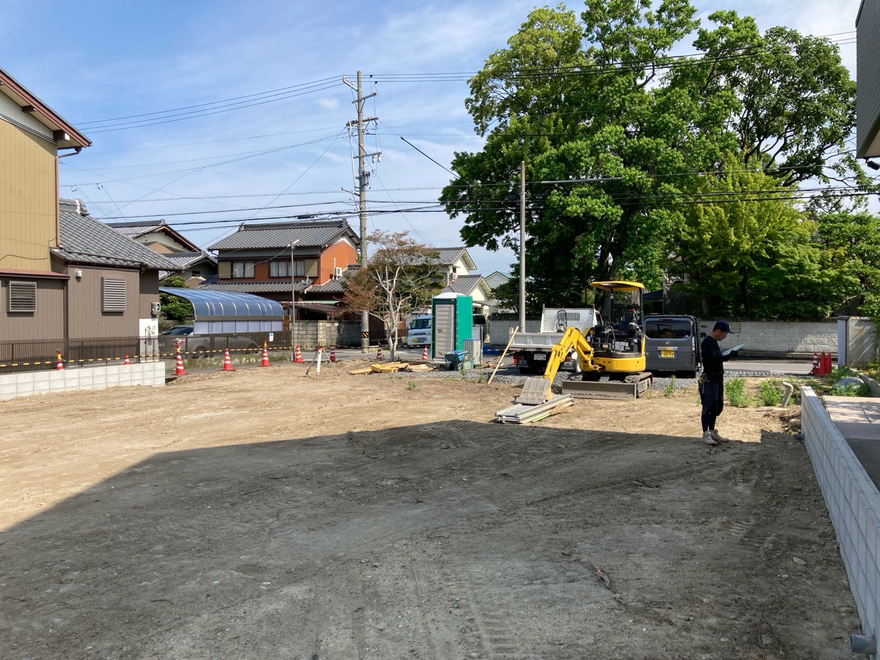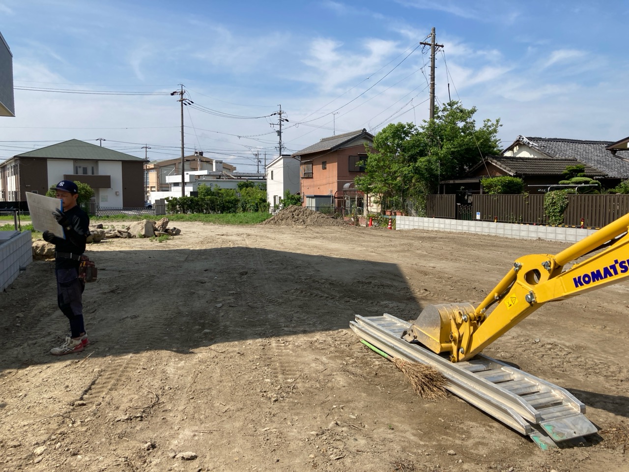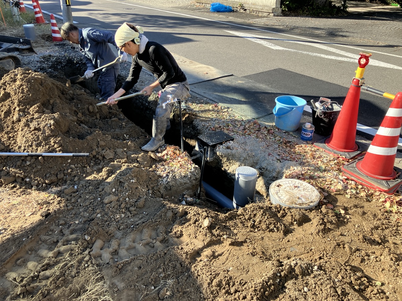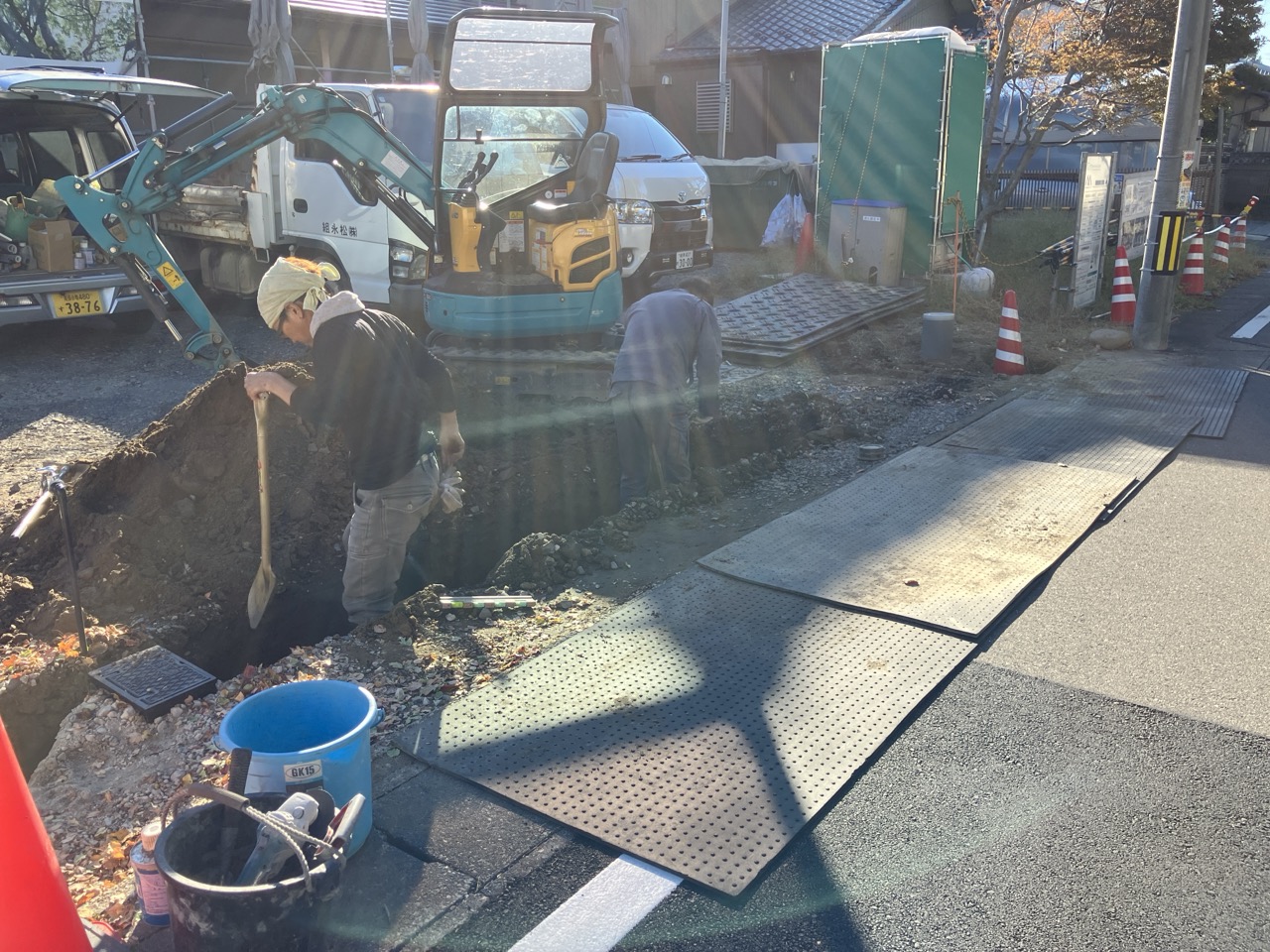 道路際では敷地内の給排水配管埋設が行われています。足場が解体されたら建物周りも一気に配管工事。今日あたりから寒くなってきましたが外で働くにはちょうど良い気温です。