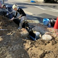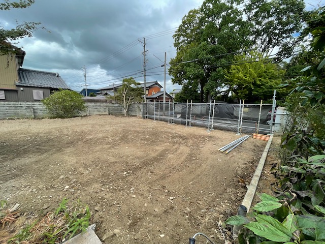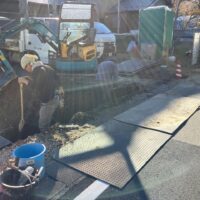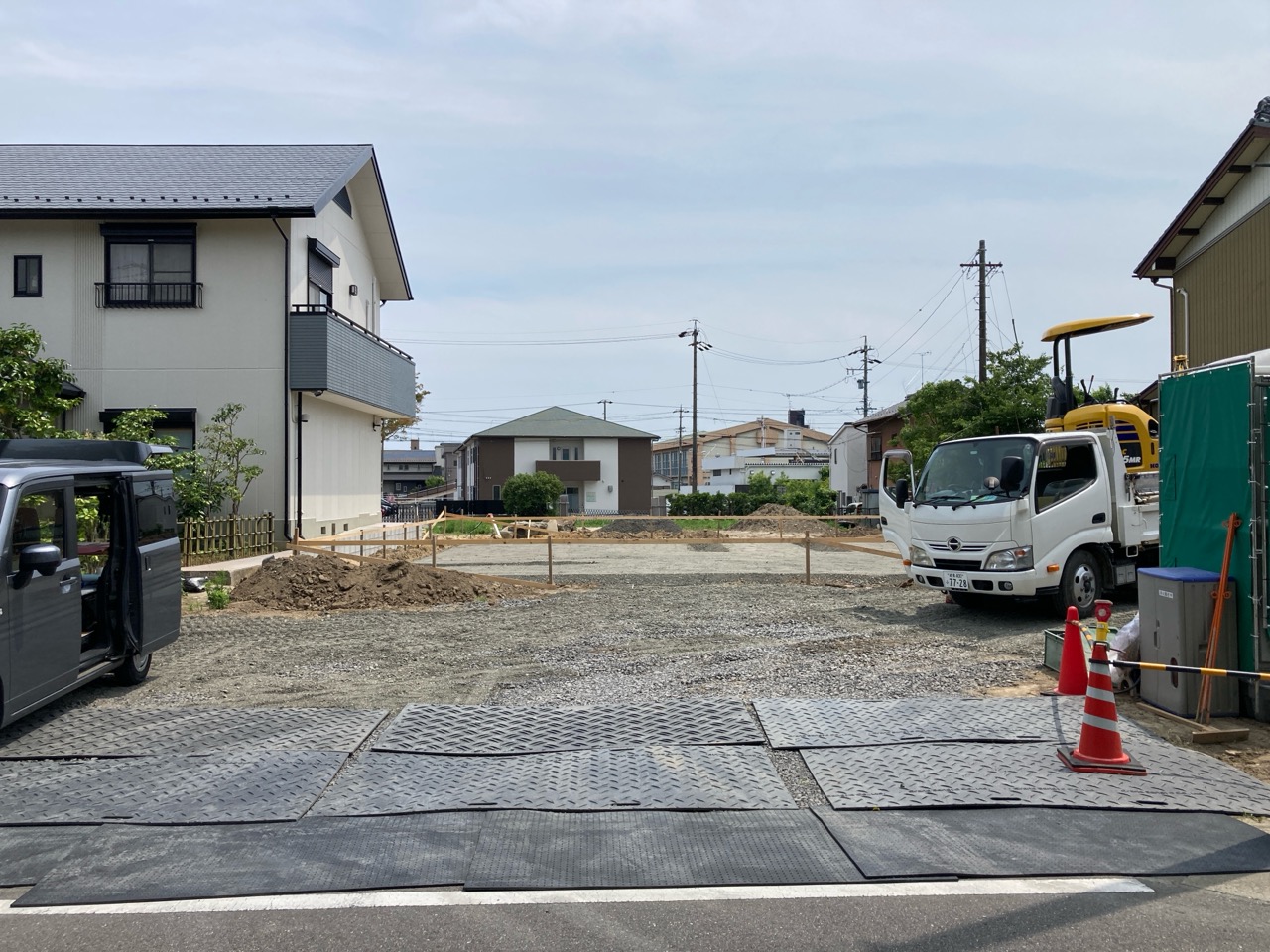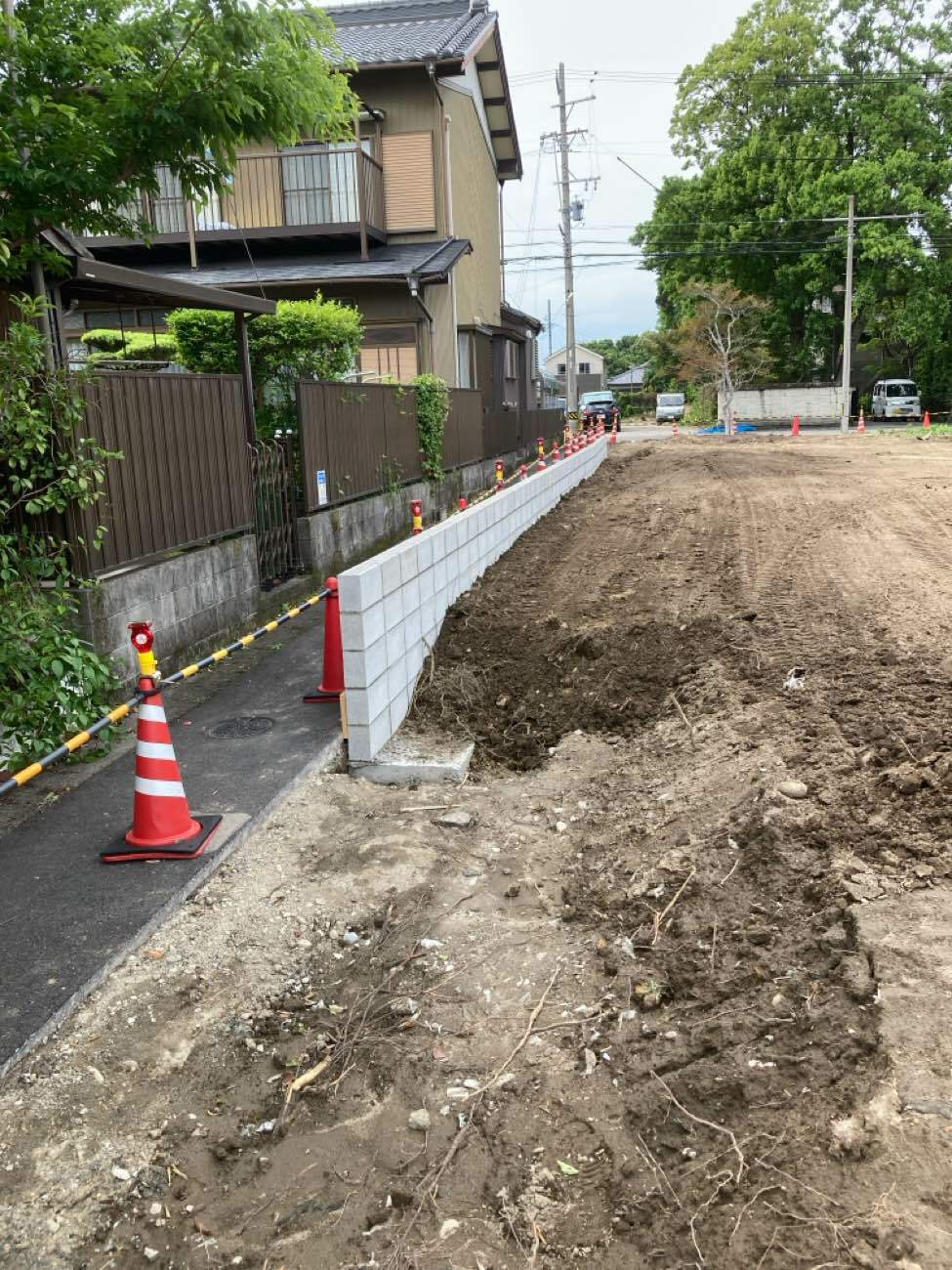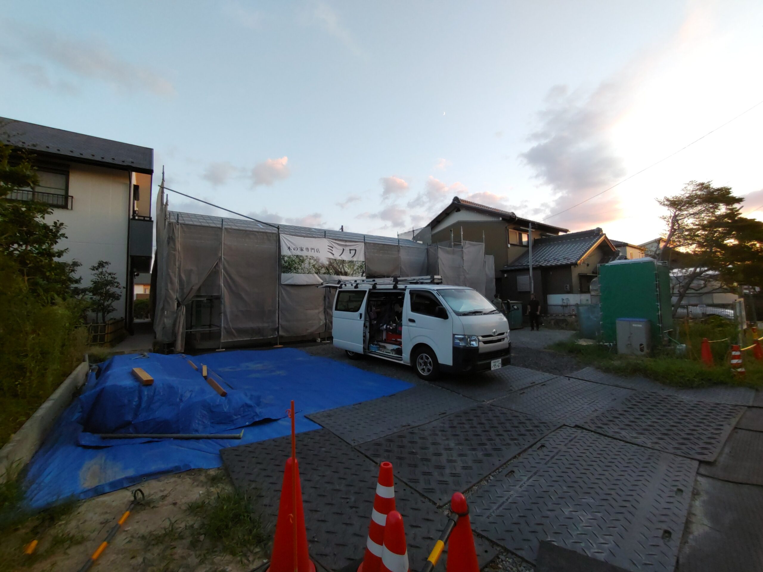 道路際では敷地内の給排水配管埋設が行われています。足場が解体されたら建物周りも一気に配管工事。今日あたりから寒くなってきましたが外で働くにはちょうど良い気温です。