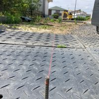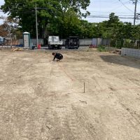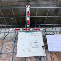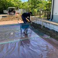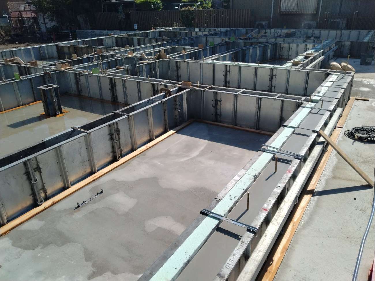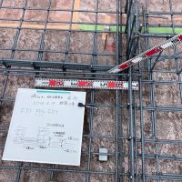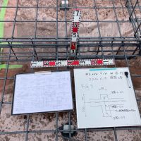 ・捨てコンクリート:配筋工事を行う際に、図面の寸法を縮尺1/1で地面に写す必要があります。とは言え地面には直線など引けませんので、コンクリートを打設して上面を平滑に均し、そこに墨壺で直線が引けるようにするための工事です。
