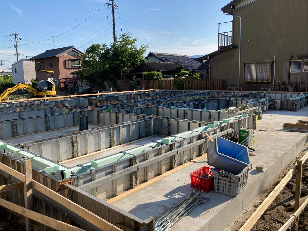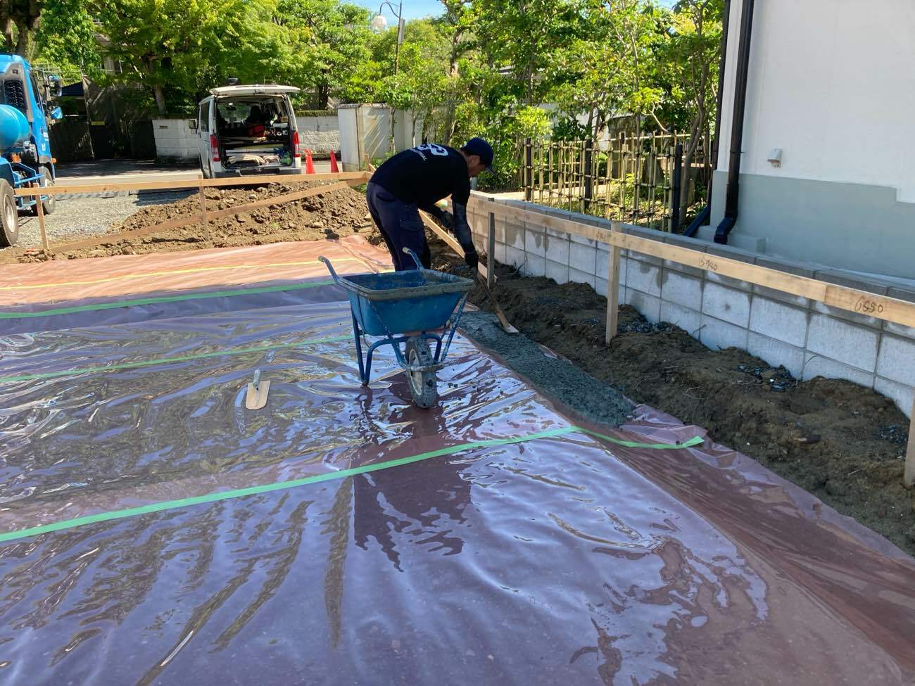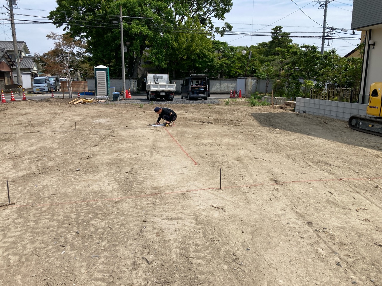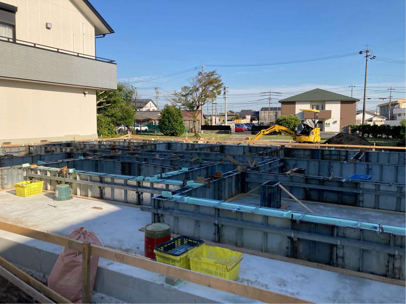 配筋工事の前に防湿シート敷設と捨てコンクリート打設が行われました。f様もお仕事終わりなどに現場に立ち寄って見ていかれ、この材料は何?と質問をされました。住宅新築工事に伴って建築に興味を持ってもらえるのは良い事です。