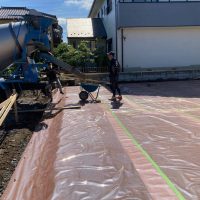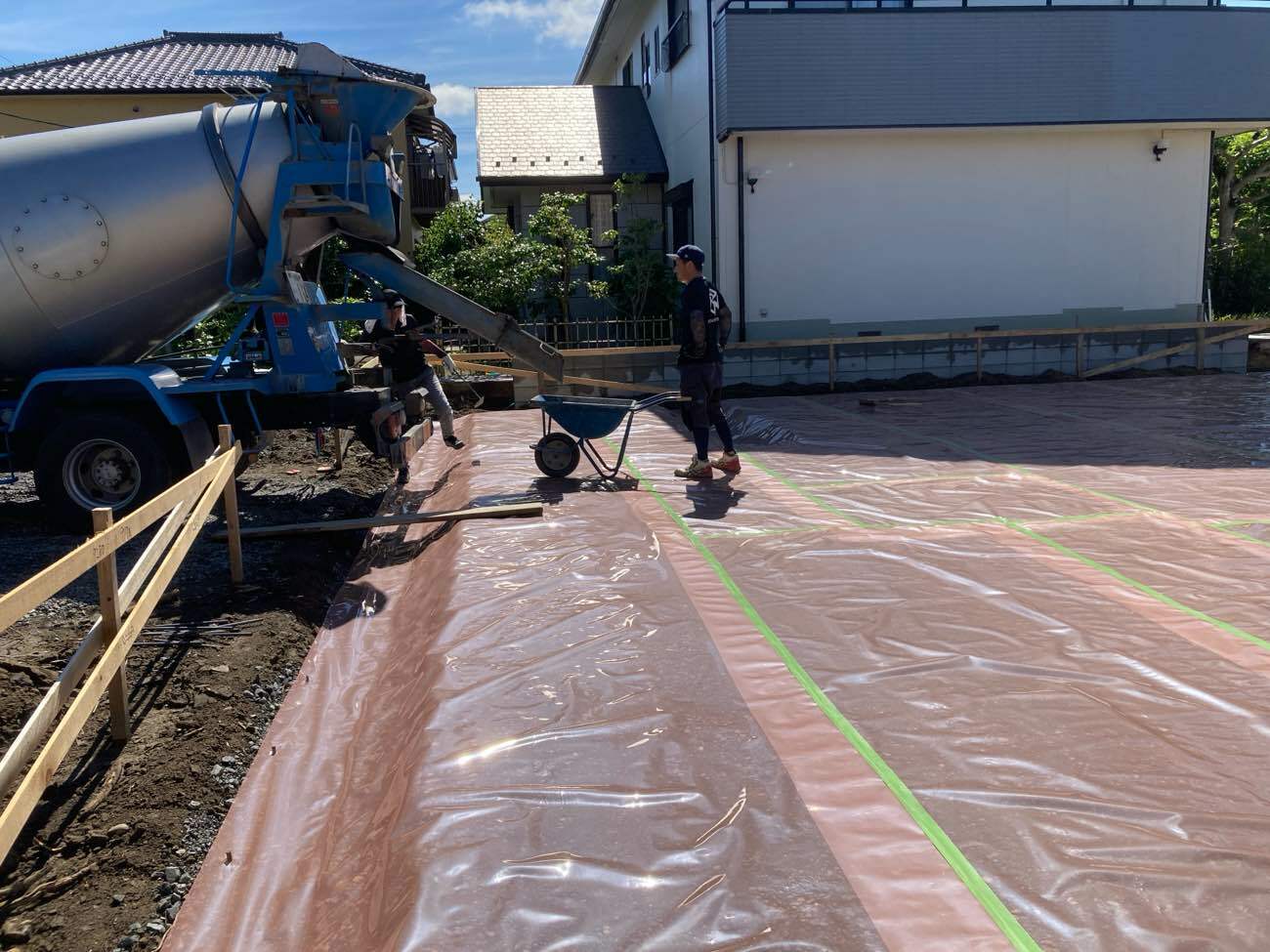 スラブのコンクリート打設が完了しました。平屋建てで40坪以上の面積、コンクリートの量も圧倒的に多いので、打設するのも一苦労です。