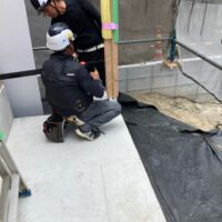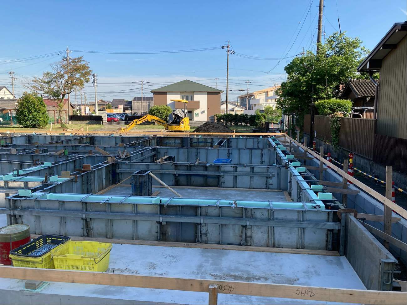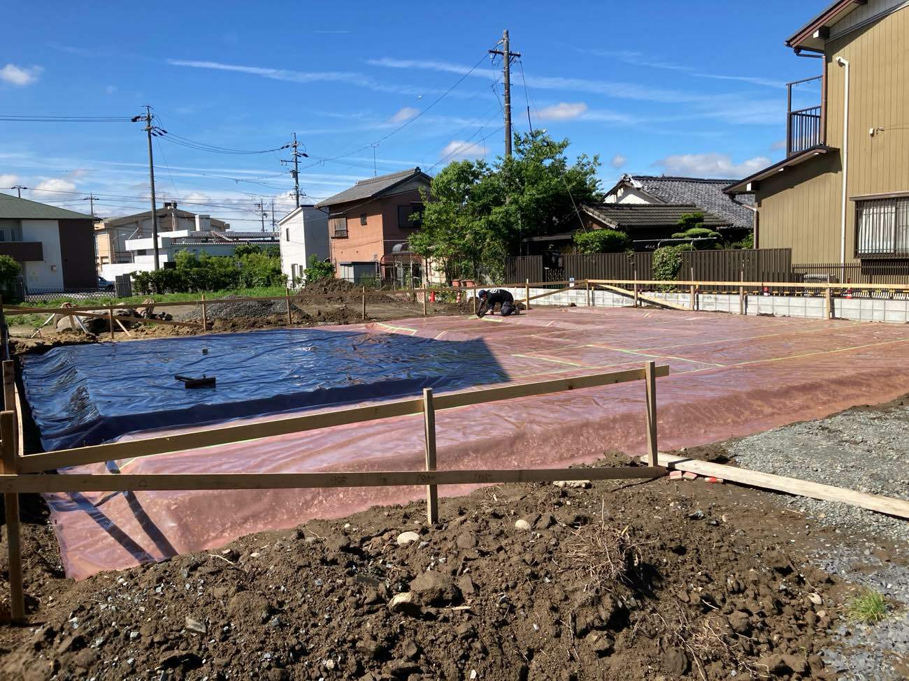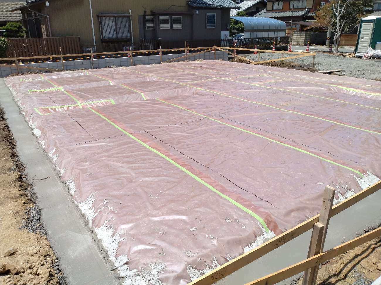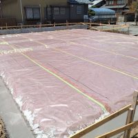 ・防湿シート:地面から上がってくる湿気が直接コンクリートにあたらないよう敷設するシートです。基礎の垂直面や上面は完成後は外気に接しますが、下面は常に地面と接する事になります。コンクリートの中にある鉄筋に対して外部から水分が侵入しないように『コンクリートの被り厚さ』というものが定められていますが、下面に関しては被り厚さを確保していても経年によるクラックなどから極力湿気が入っていかないように防湿シートで遮断するという方法をとります。