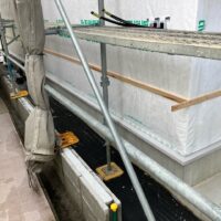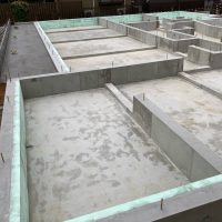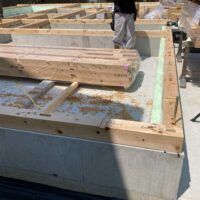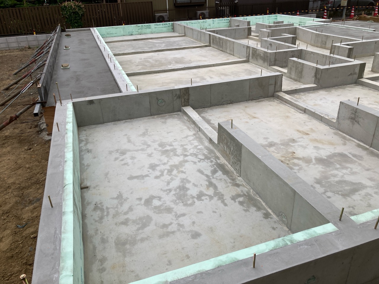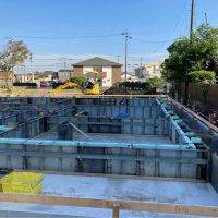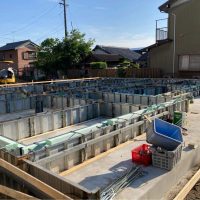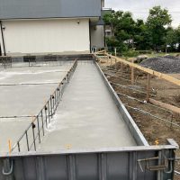 鋼製型枠が外され、基礎コンクリートの全容があらわになりました。これから土台伏作業を行うまではしばらく養生期間として置いておきますが、その間にも梅雨間の雨が降り込みます。コンクリートはある程度の期間は急激に乾燥しないように散水養生をする事もありますので、ちょうど良い(?)とも言えます。その後排水するのに結構大変ですが‥。