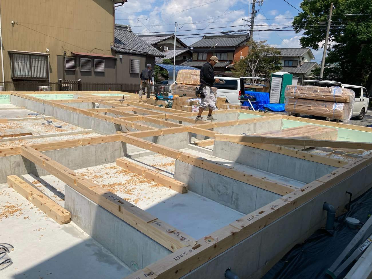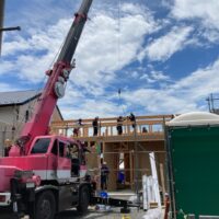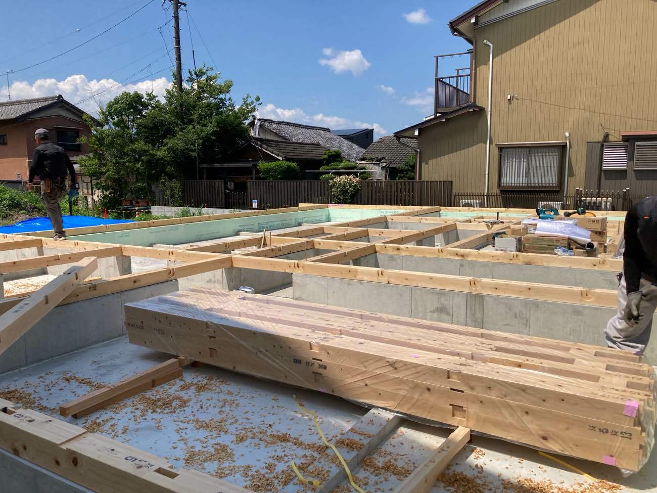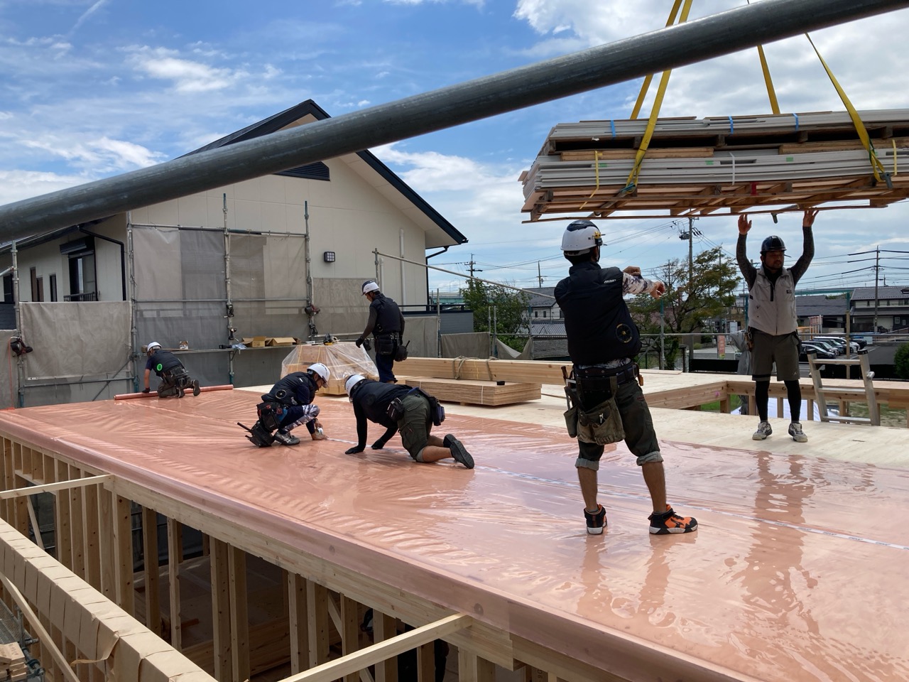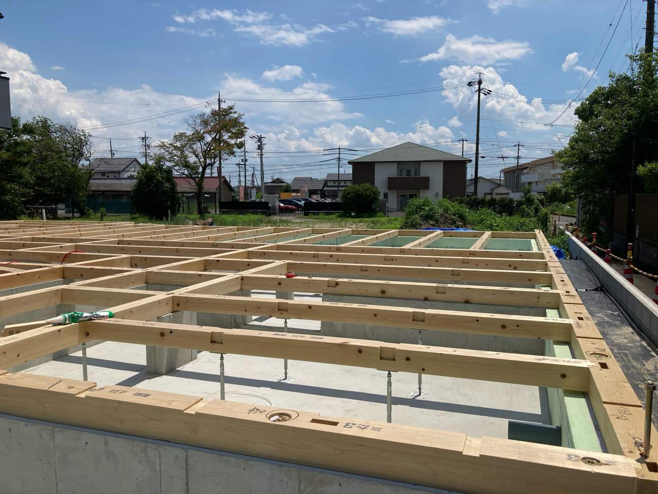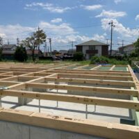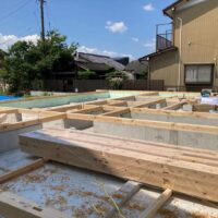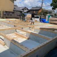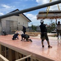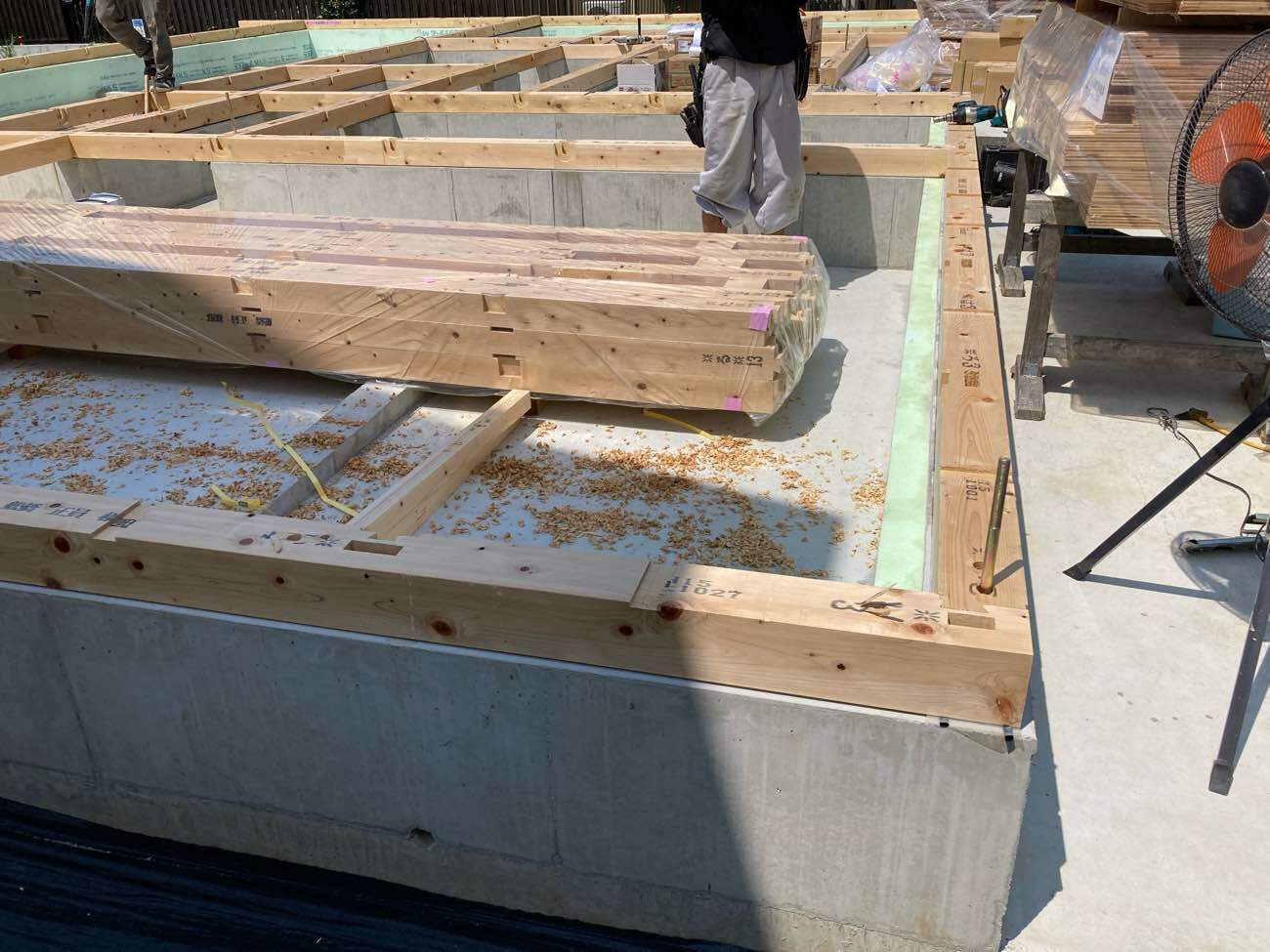 究極に暑かったこの一週間、日差しを遮るものの無い現場で土台伏せ作業が行われました。常に熱中症の危険と隣り合わせの中ですが、作業は着々と進んでいきます。こまめに水分補給をして十分にお気を付けください。