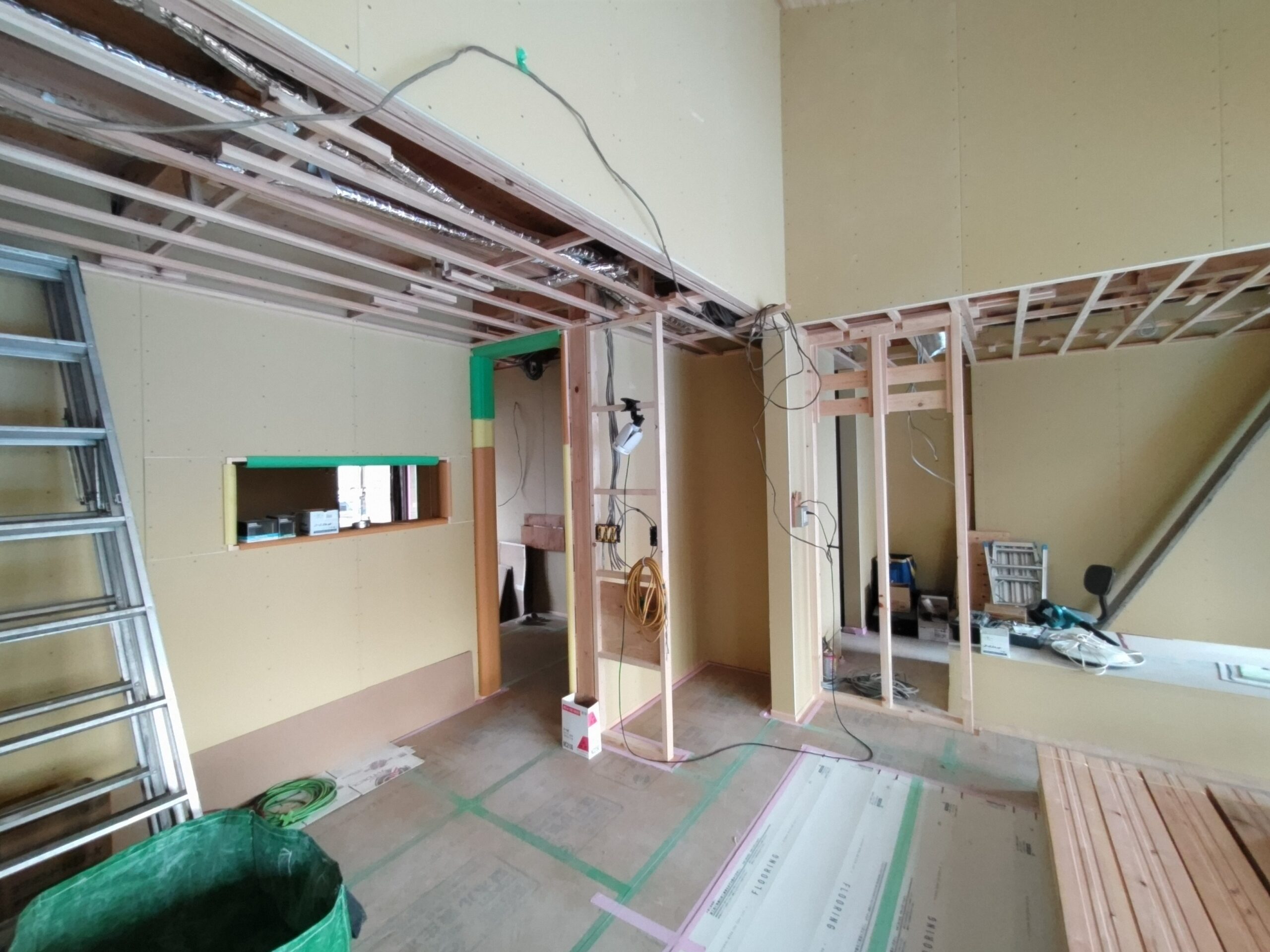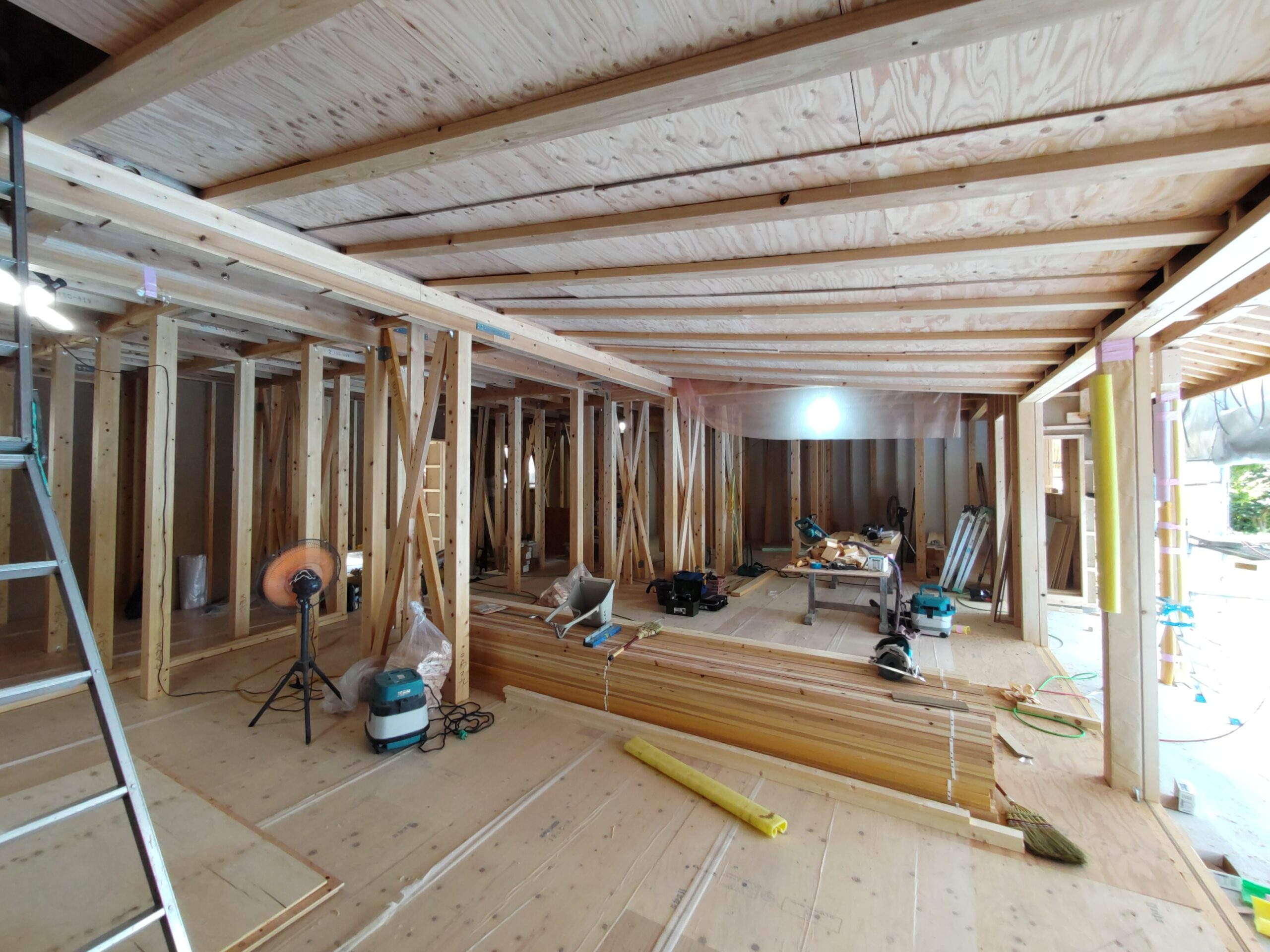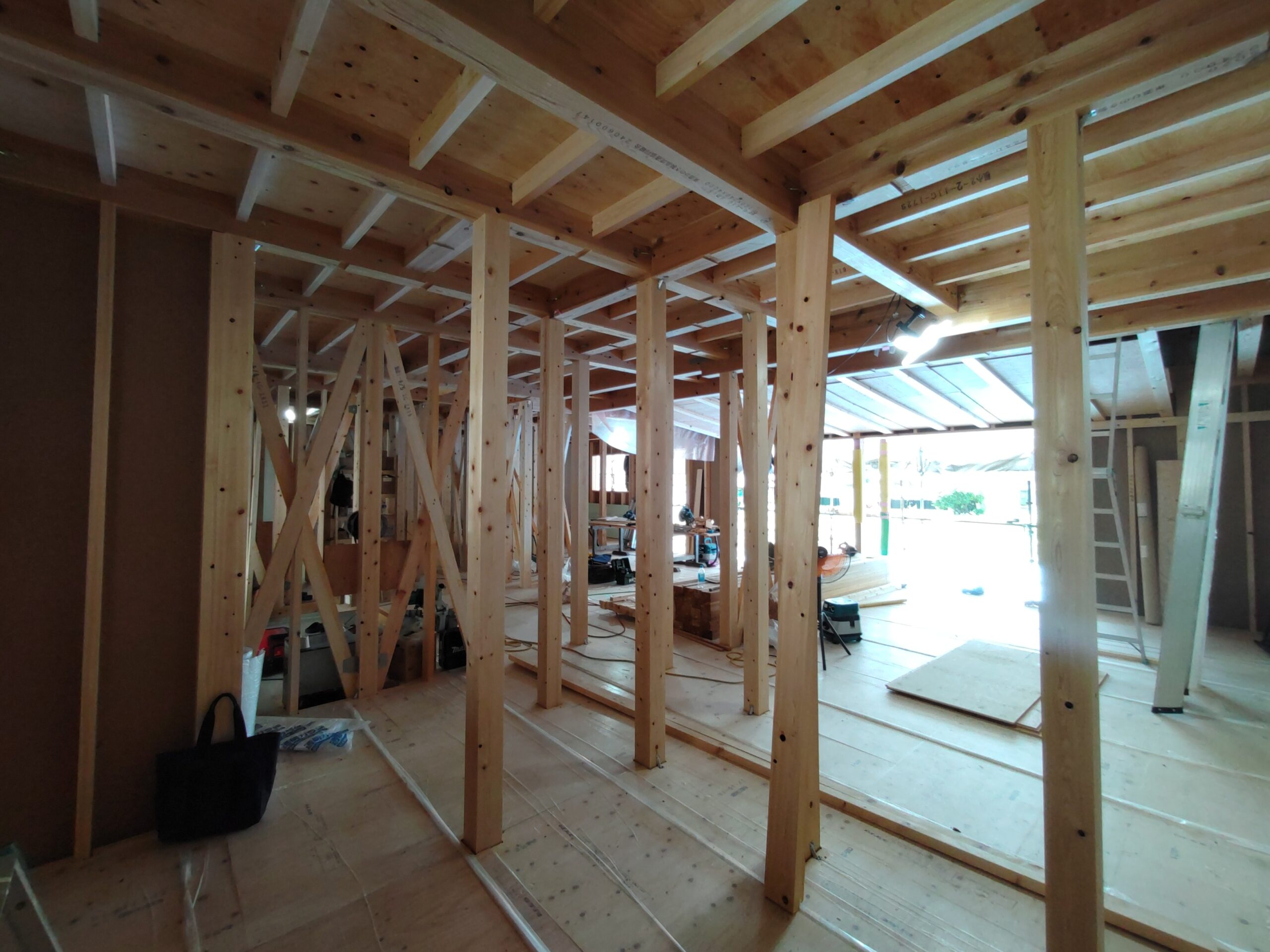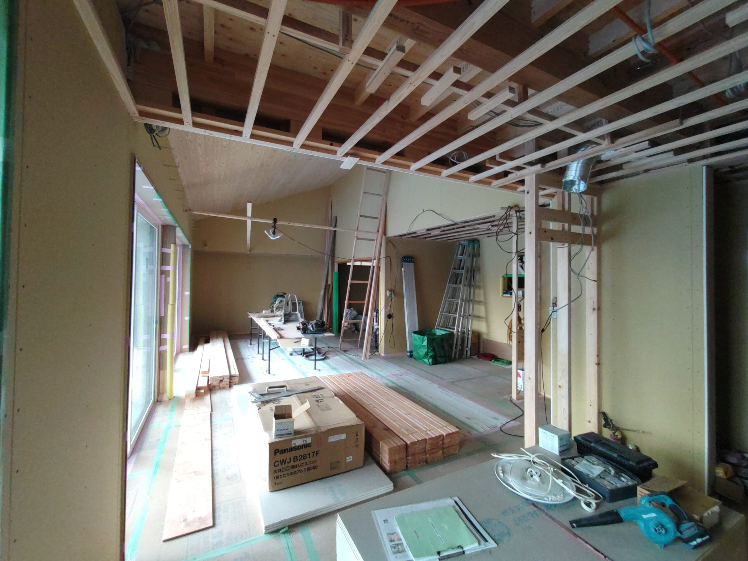 屋内では間仕切壁下地工事が着々と進んでいます。下地のせっこうボードが張られる前は視線が抜けるため広々と感じますが、壁下地ができてくると一気に部屋の感じがしてきます。リビングは仮設足場が外され、屋根なりの勾配天井が現れました。高々とした空間になっています。