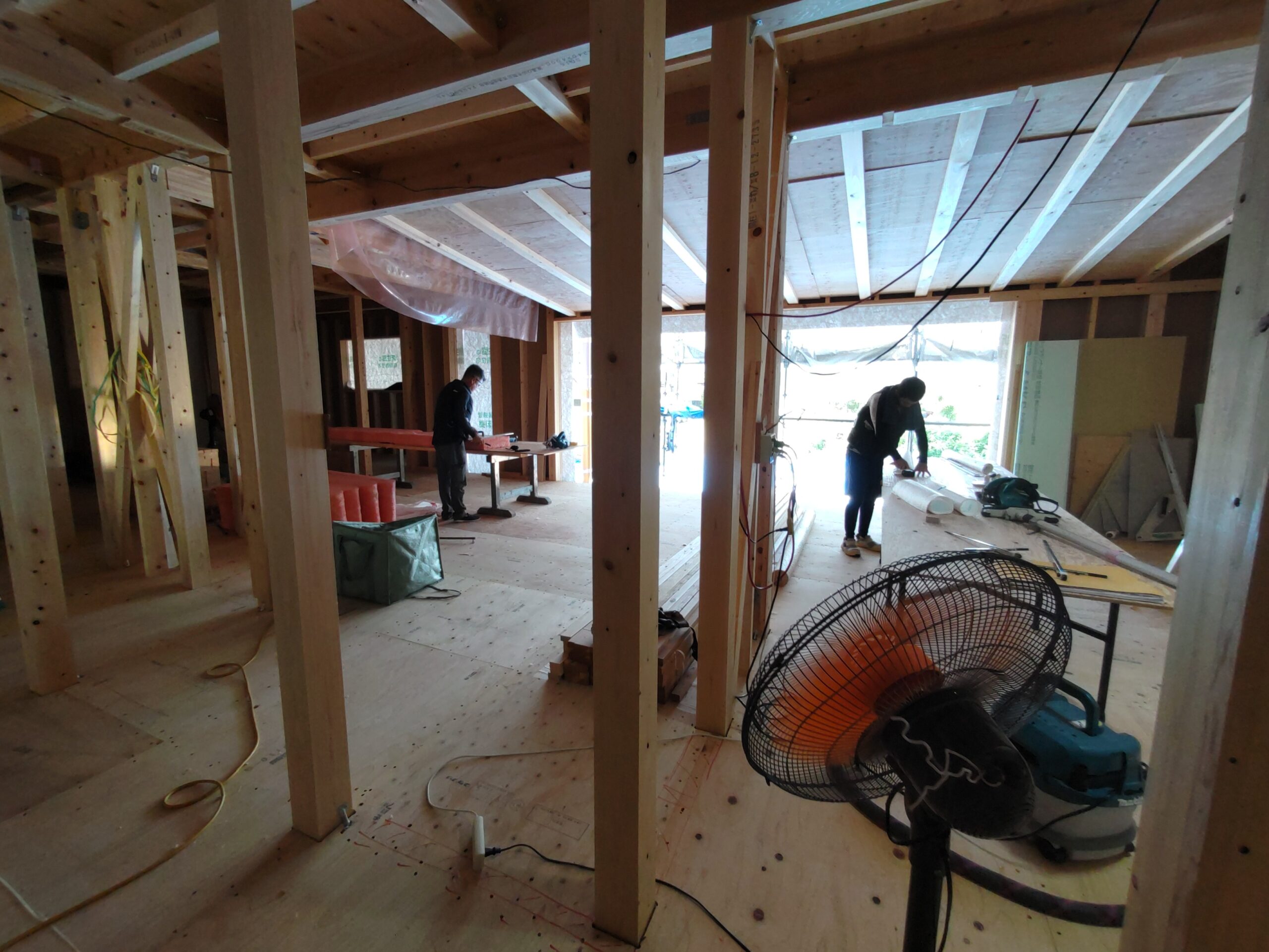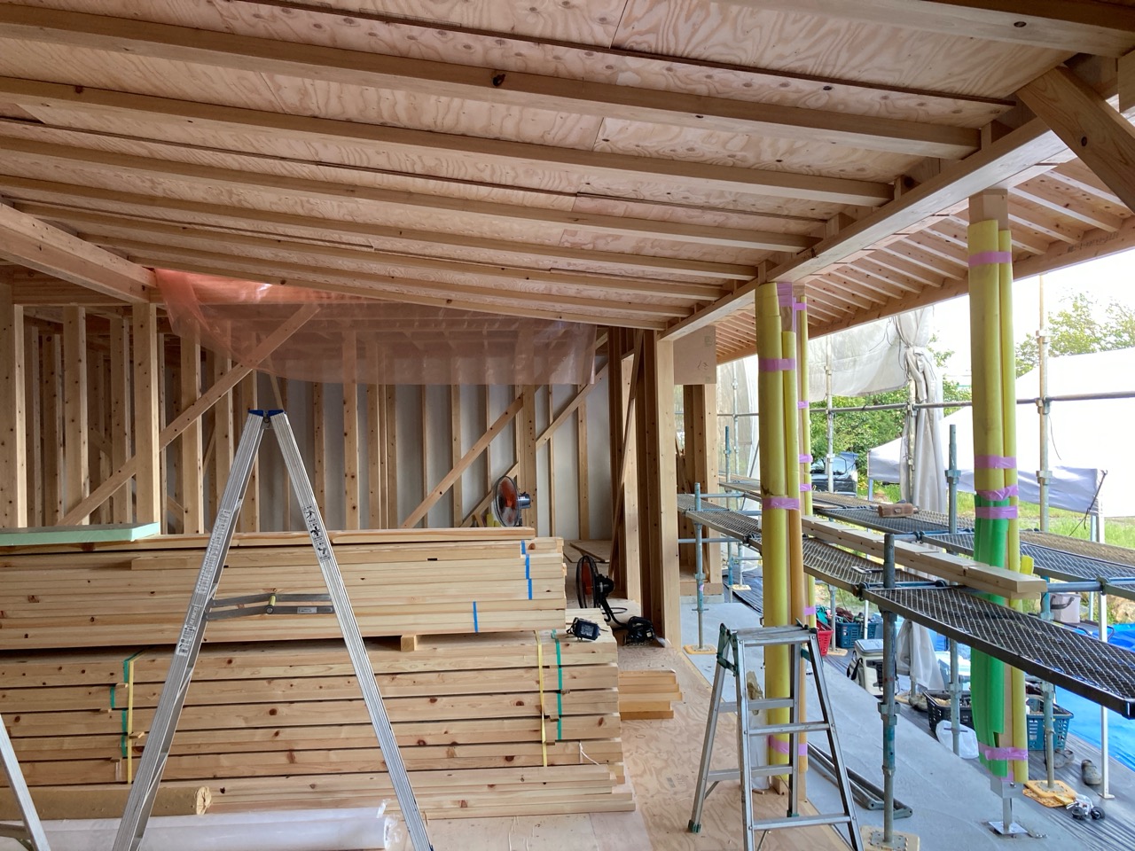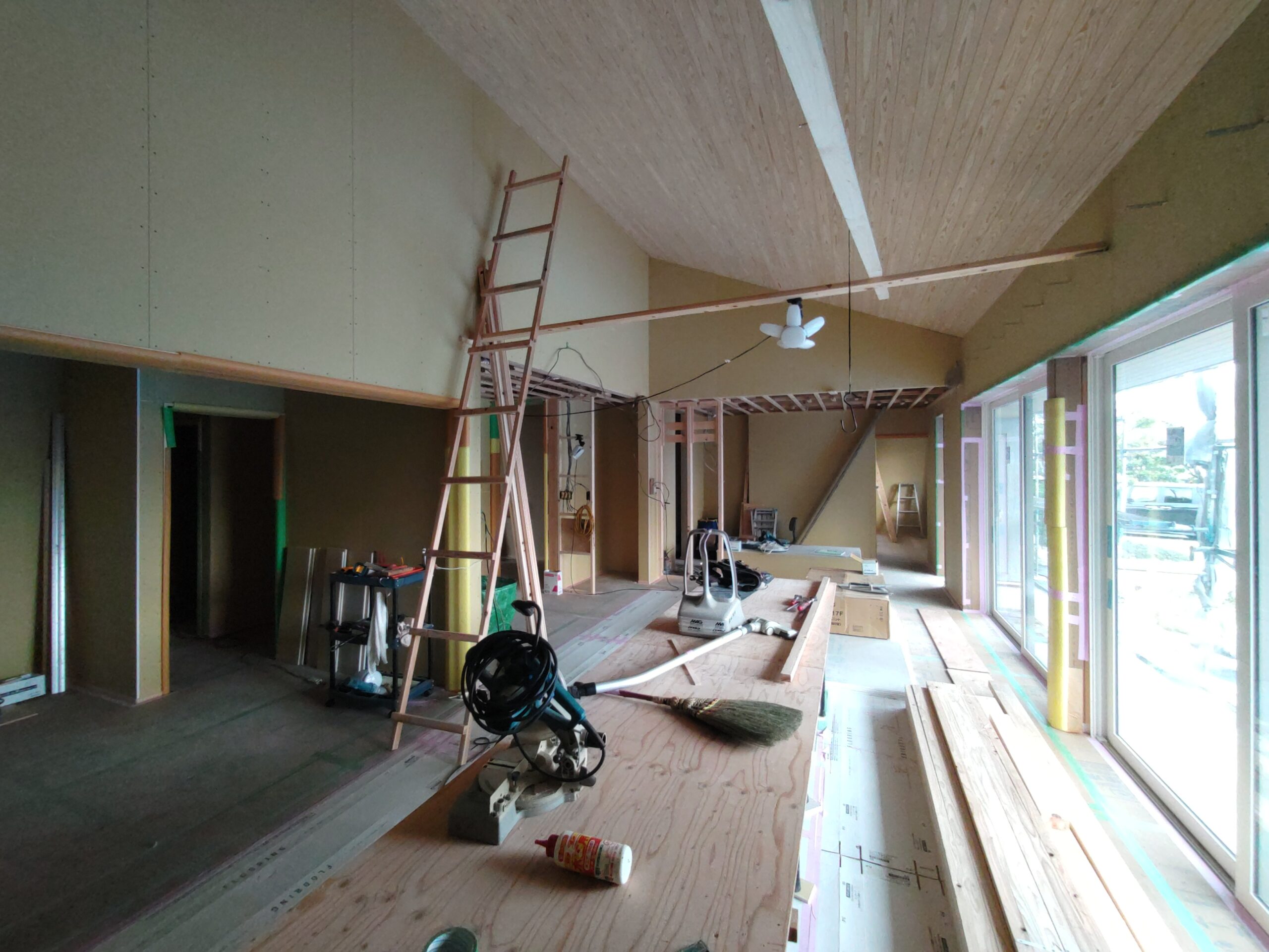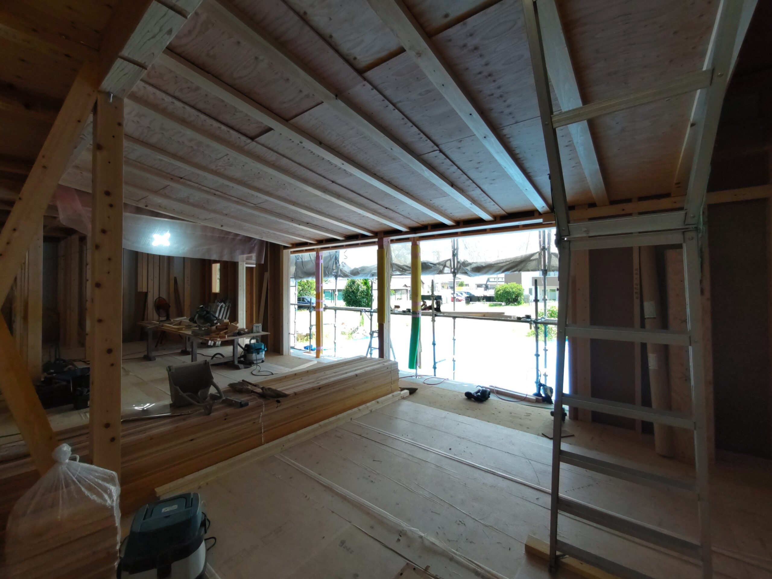 屋内では間仕切壁下地工事が着々と進んでいます。下地のせっこうボードが張られる前は視線が抜けるため広々と感じますが、壁下地ができてくると一気に部屋の感じがしてきます。リビングは仮設足場が外され、屋根なりの勾配天井が現れました。高々とした空間になっています。