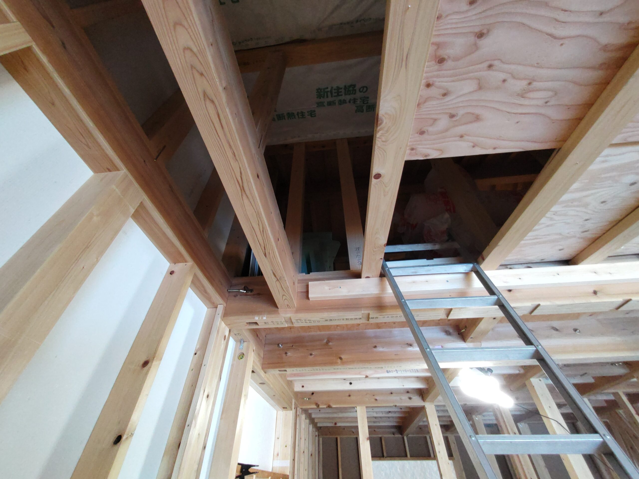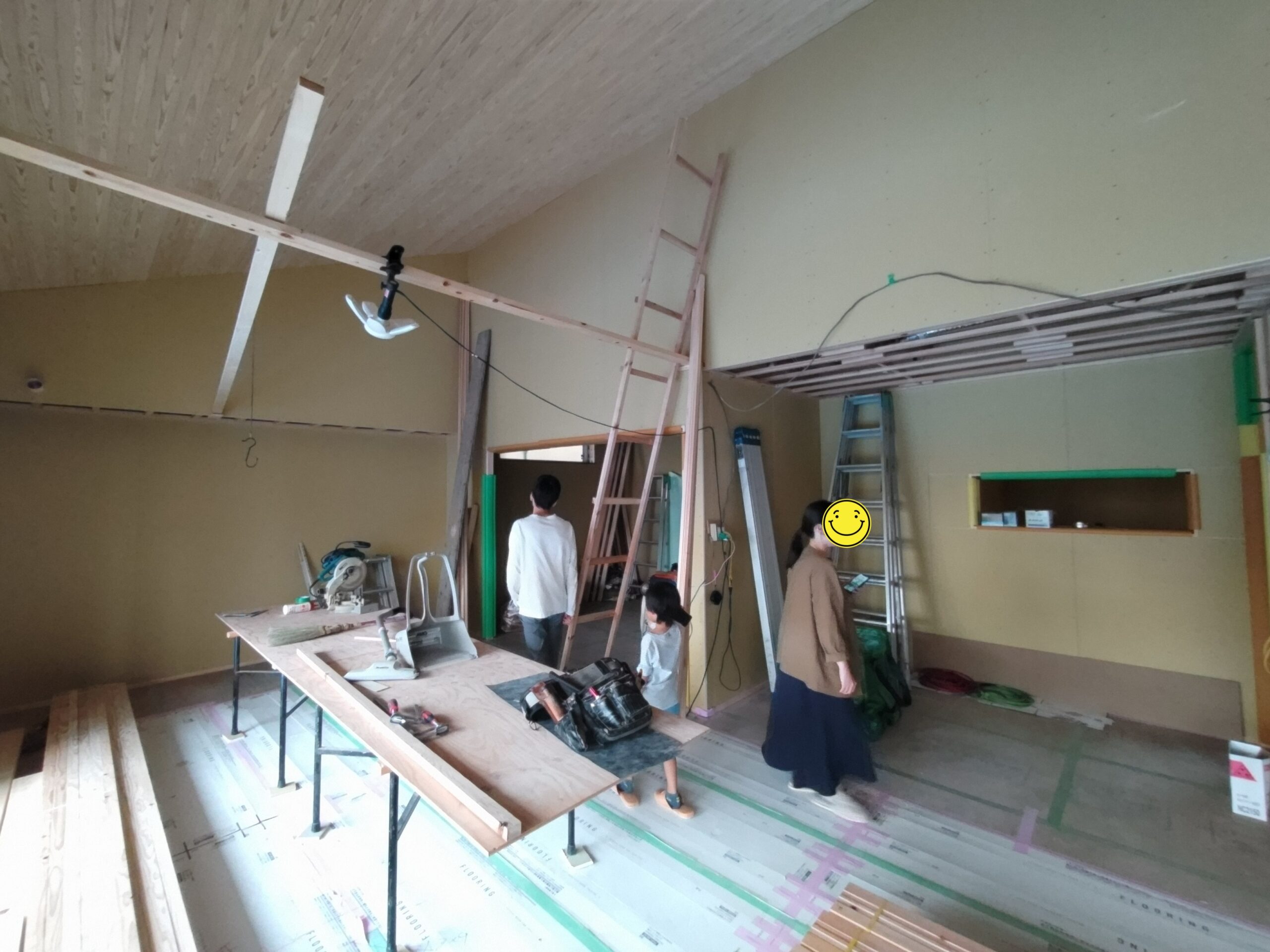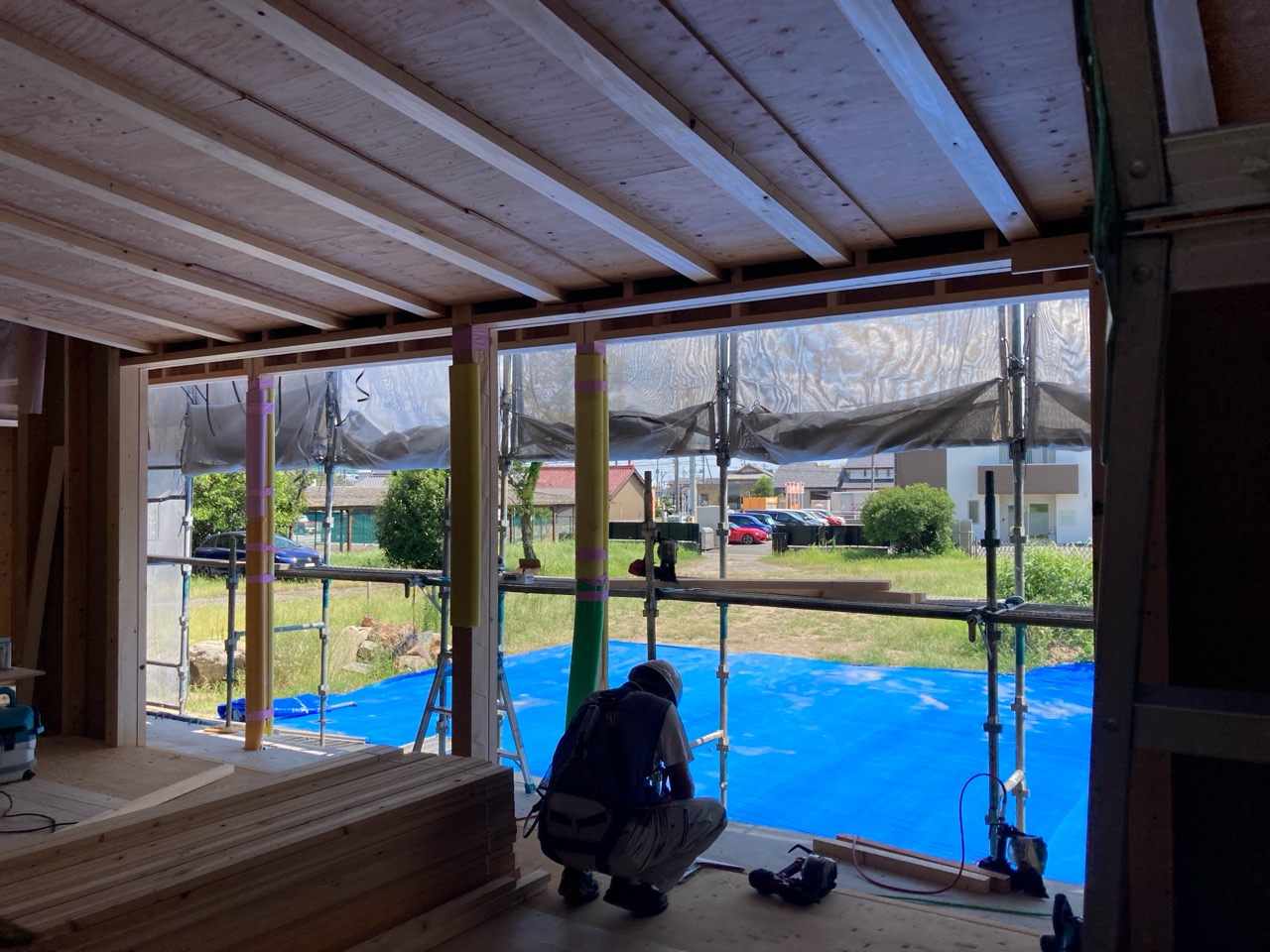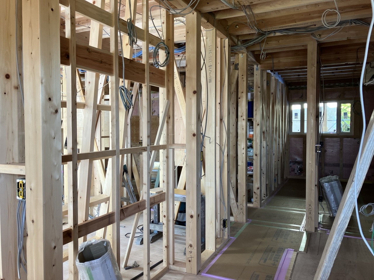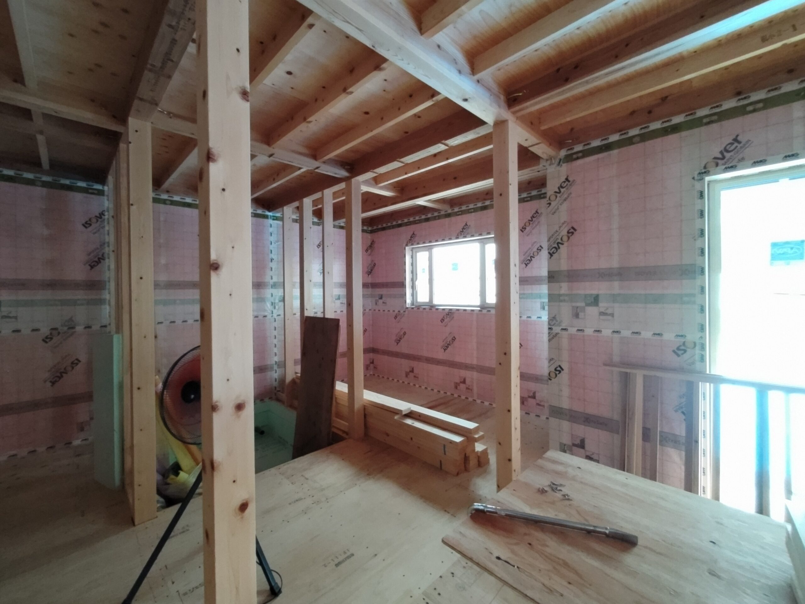屋内では間仕切壁下地工事が着々と進んでいます。下地のせっこうボードが張られる前は視線が抜けるため広々と感じますが、壁下地ができてくると一気に部屋の感じがしてきます。リビングは仮設足場が外され、屋根なりの勾配天井が現れました。高々とした空間になっています。