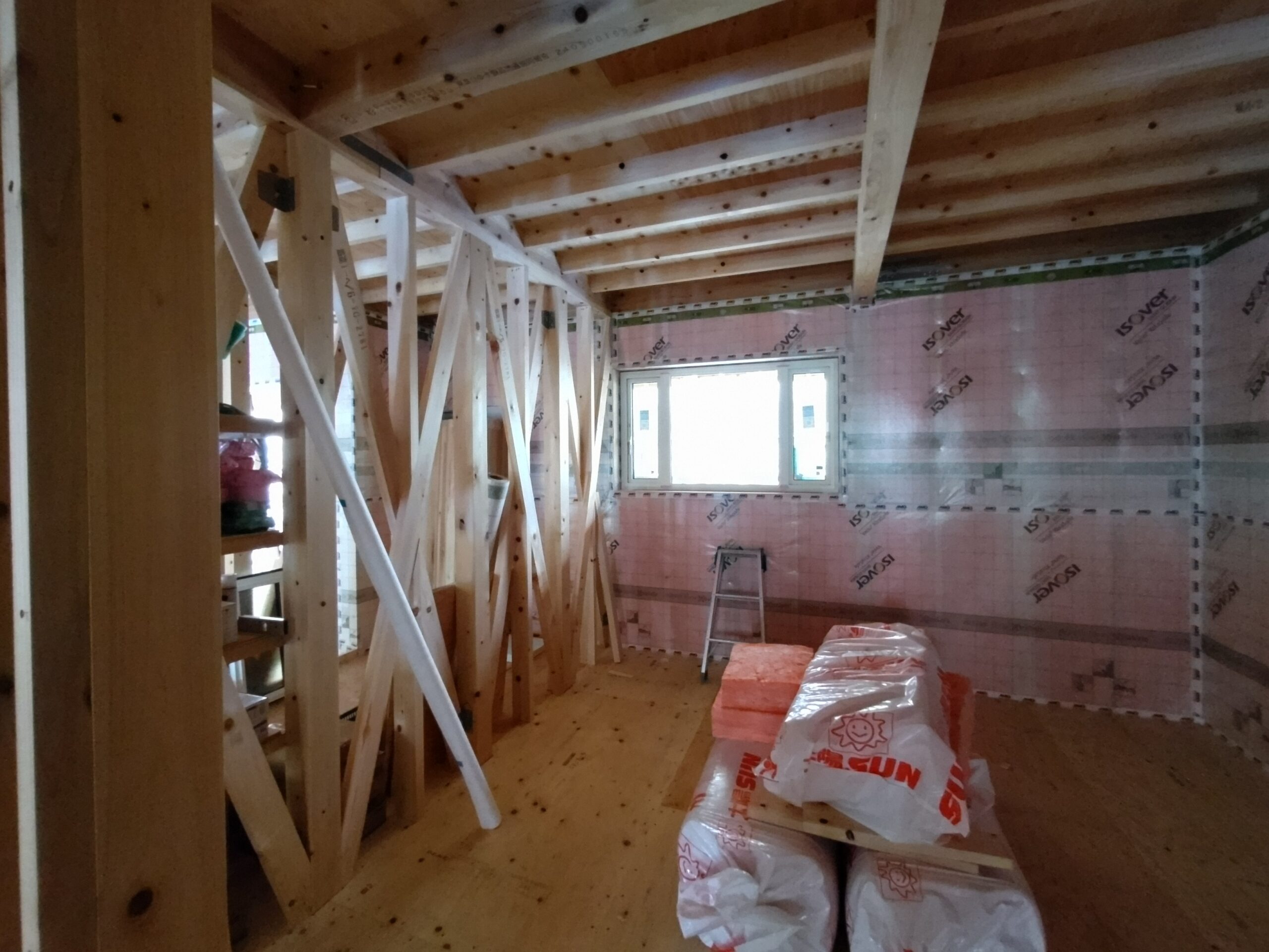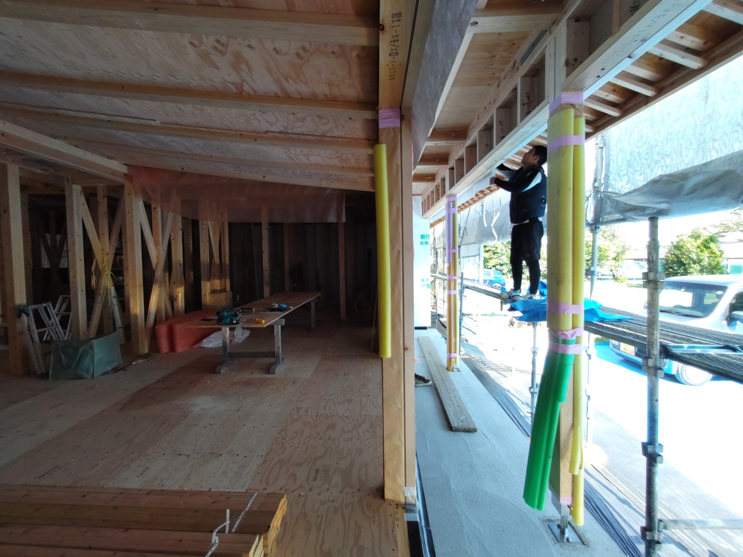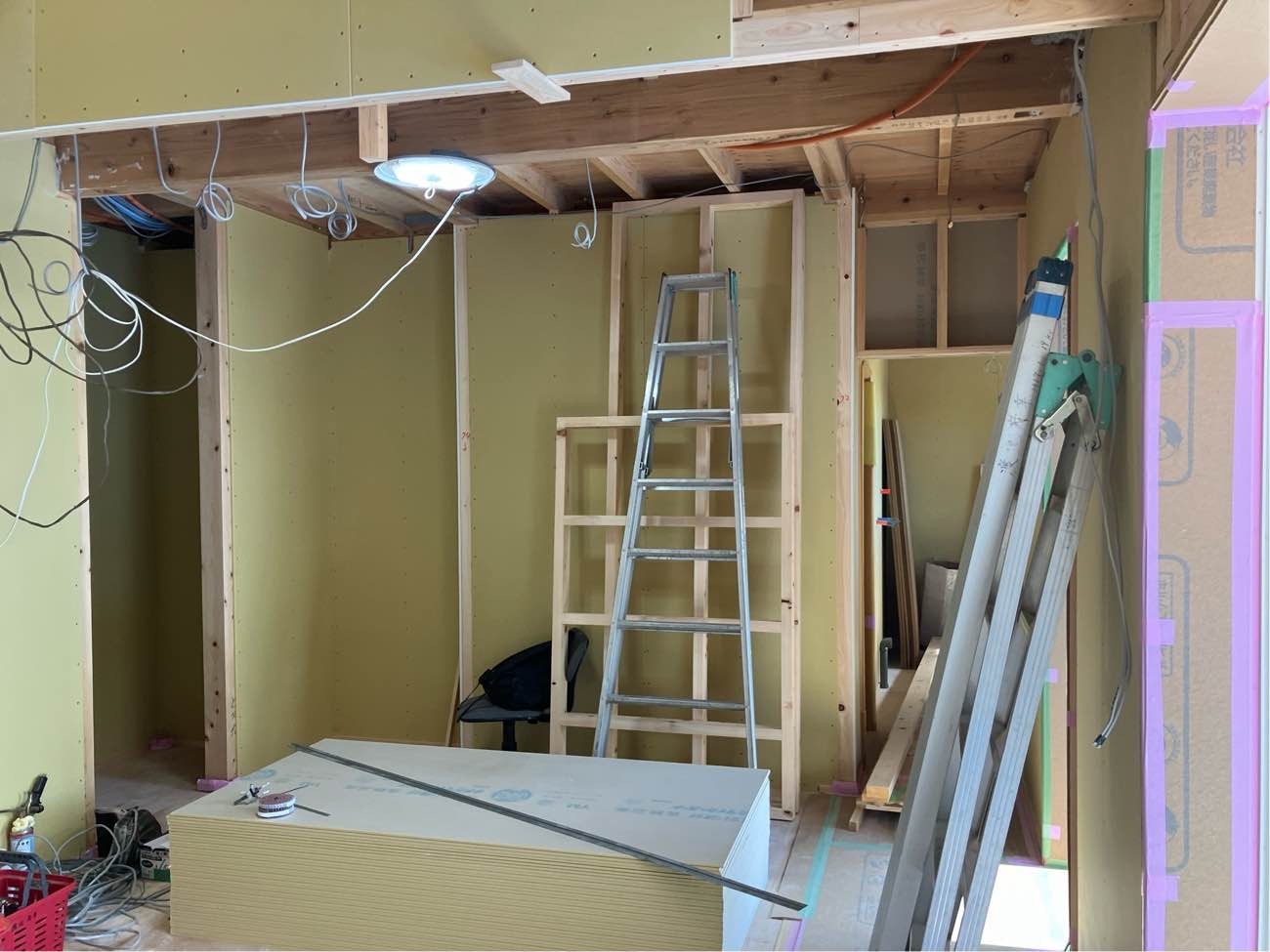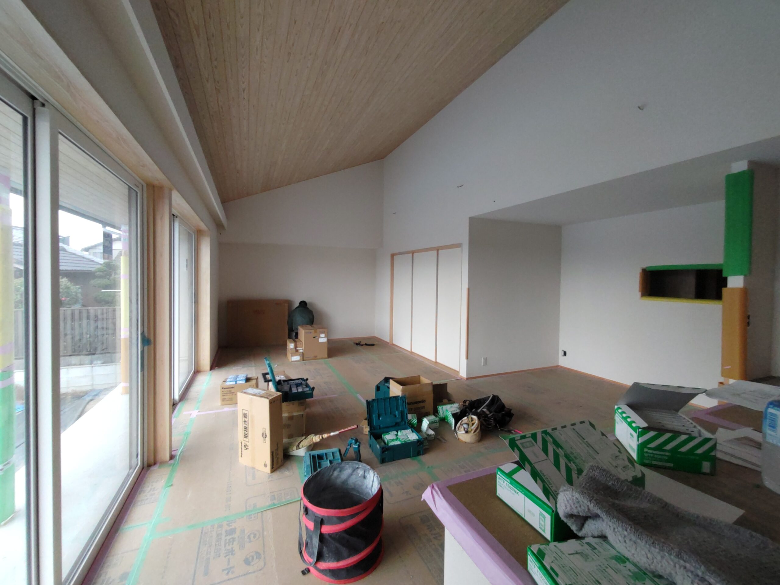 屋内では間仕切壁下地工事が着々と進んでいます。下地のせっこうボードが張られる前は視線が抜けるため広々と感じますが、壁下地ができてくると一気に部屋の感じがしてきます。リビングは仮設足場が外され、屋根なりの勾配天井が現れました。高々とした空間になっています。