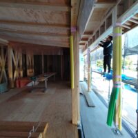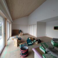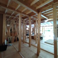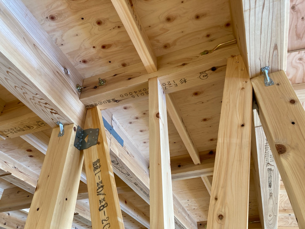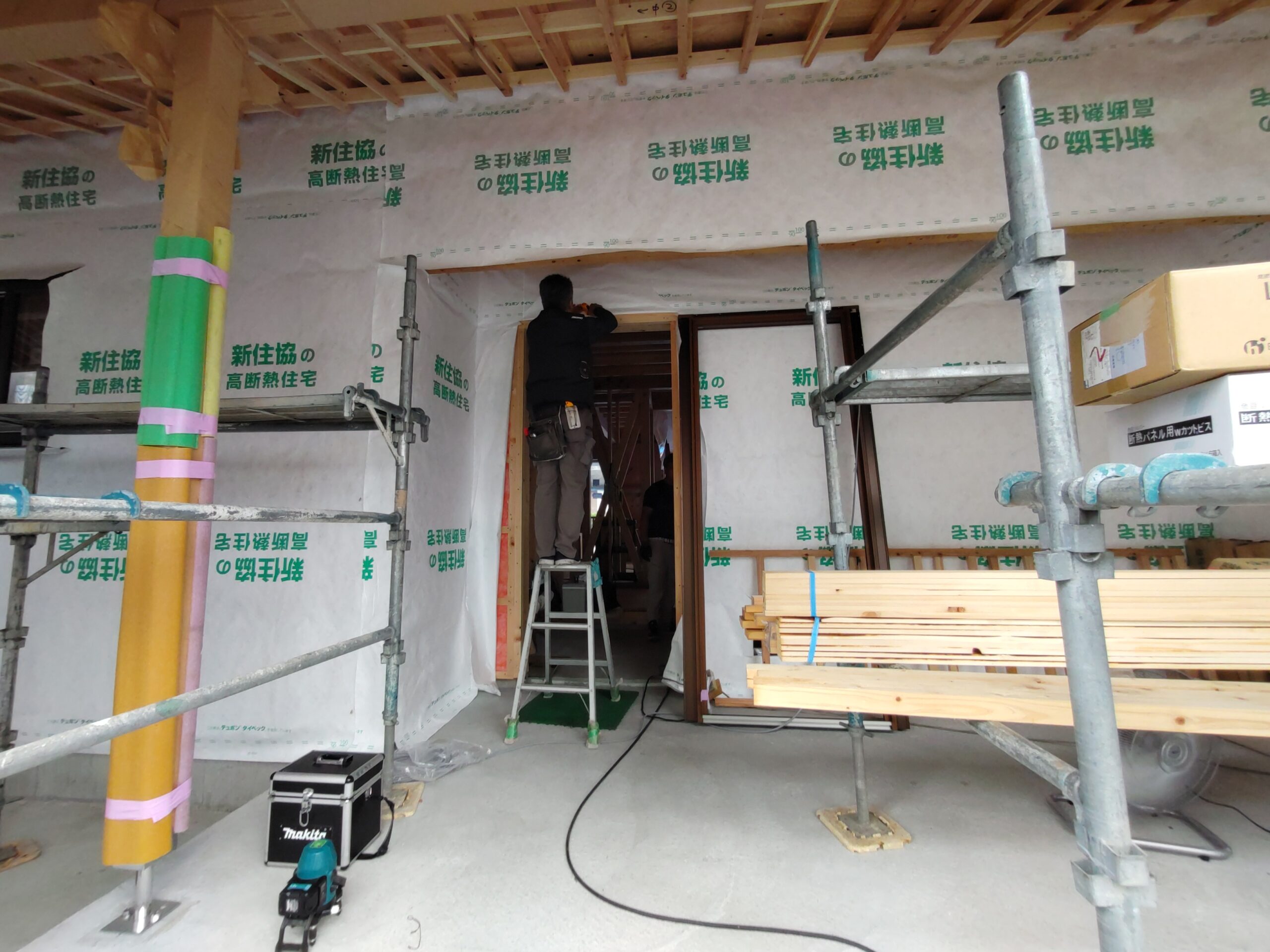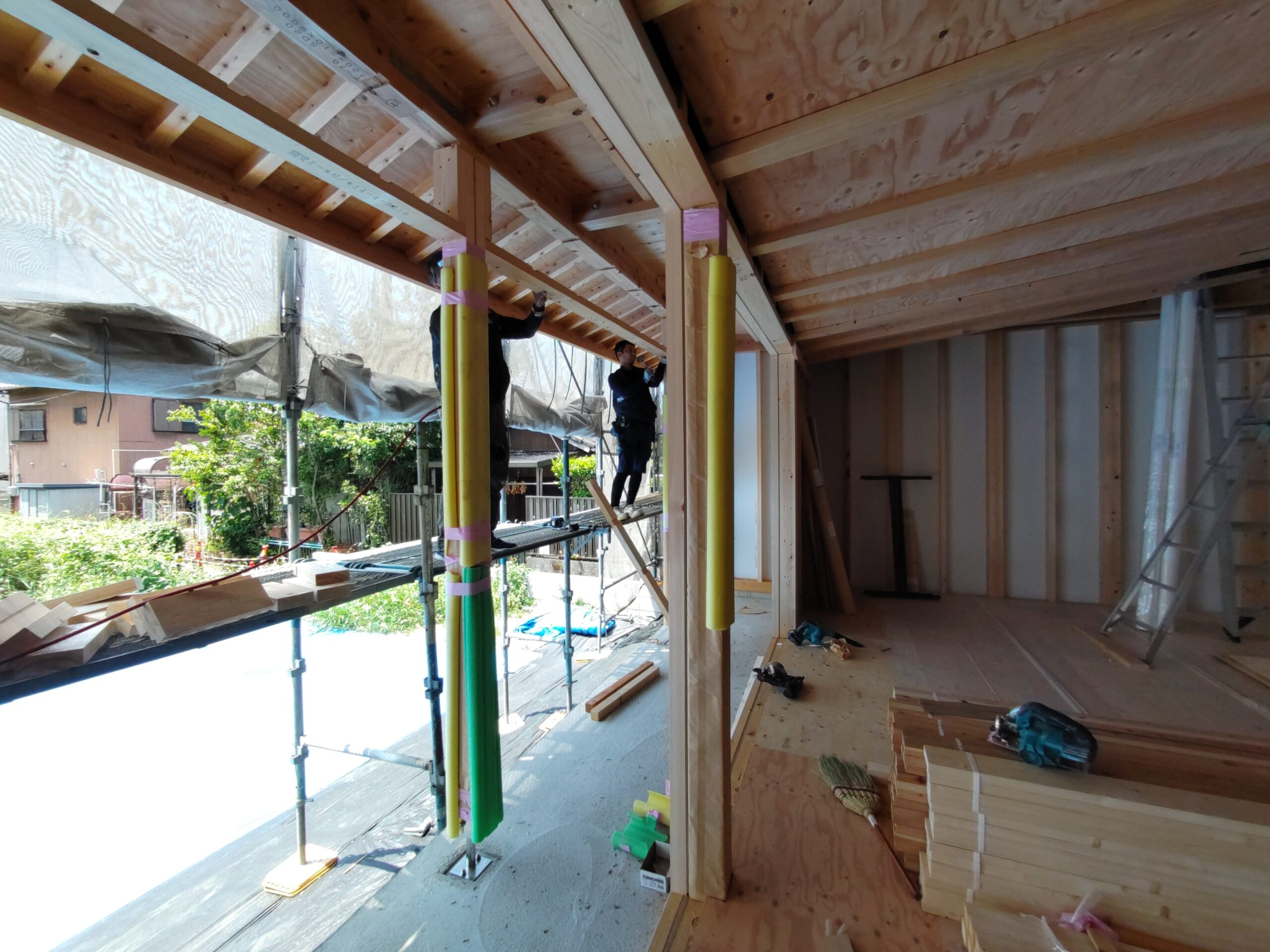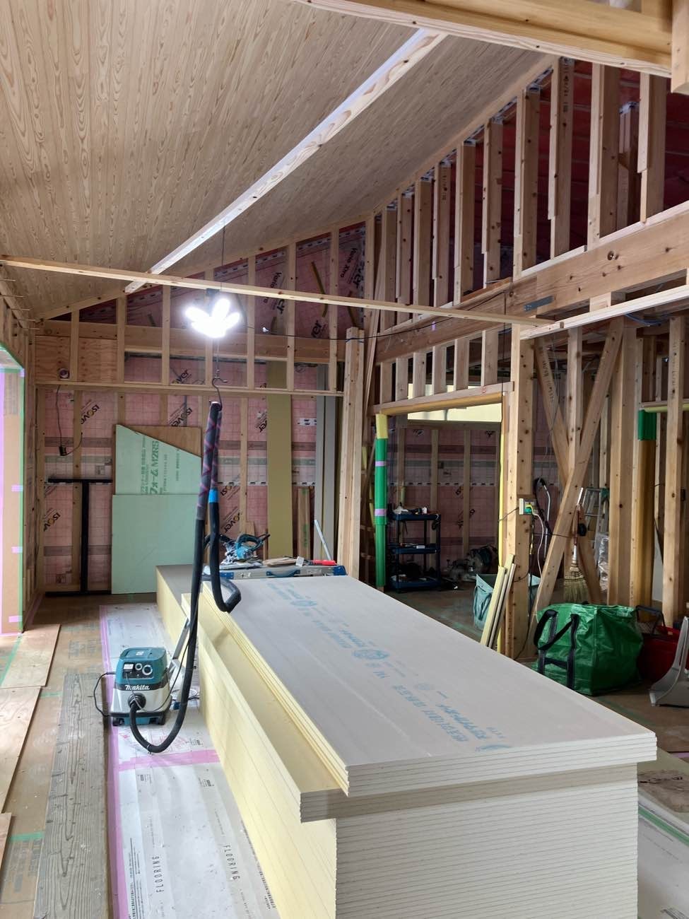 屋内では間仕切壁下地工事が着々と進んでいます。下地のせっこうボードが張られる前は視線が抜けるため広々と感じますが、壁下地ができてくると一気に部屋の感じがしてきます。リビングは仮設足場が外され、屋根なりの勾配天井が現れました。高々とした空間になっています。