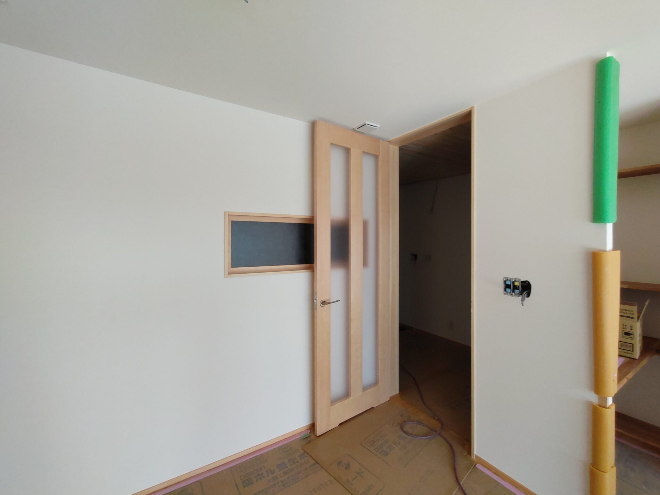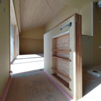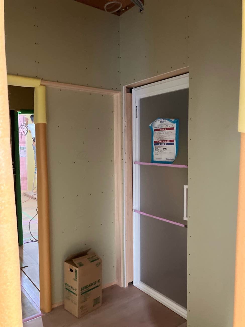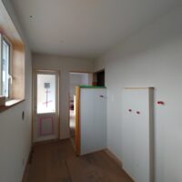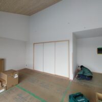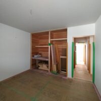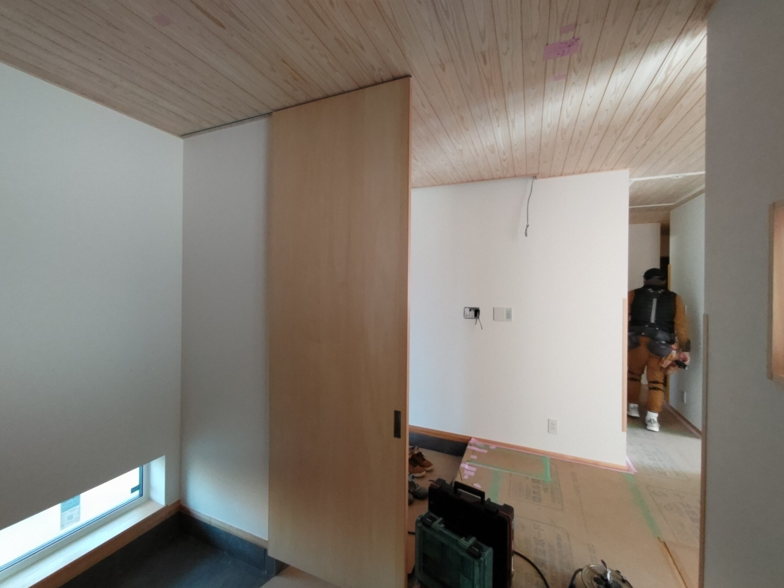 各居室や収納の建具が取り付けられました。筆者が担当する現場はあまり重々しい印象を与えない様子にするために、建具の面材はシナ合板をご提案する事が多いです。形にしてもシンプルイズベストに納める事によって、できるだけ違和感なく収めたいと考えます。