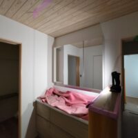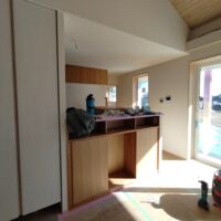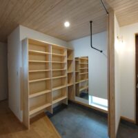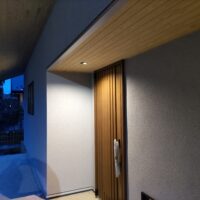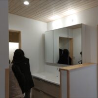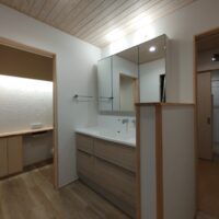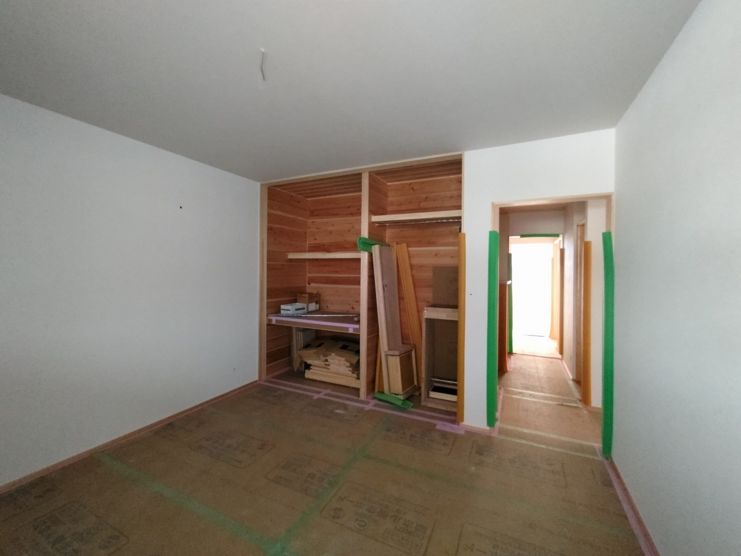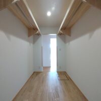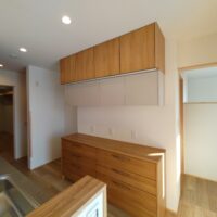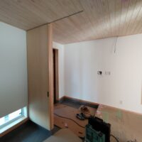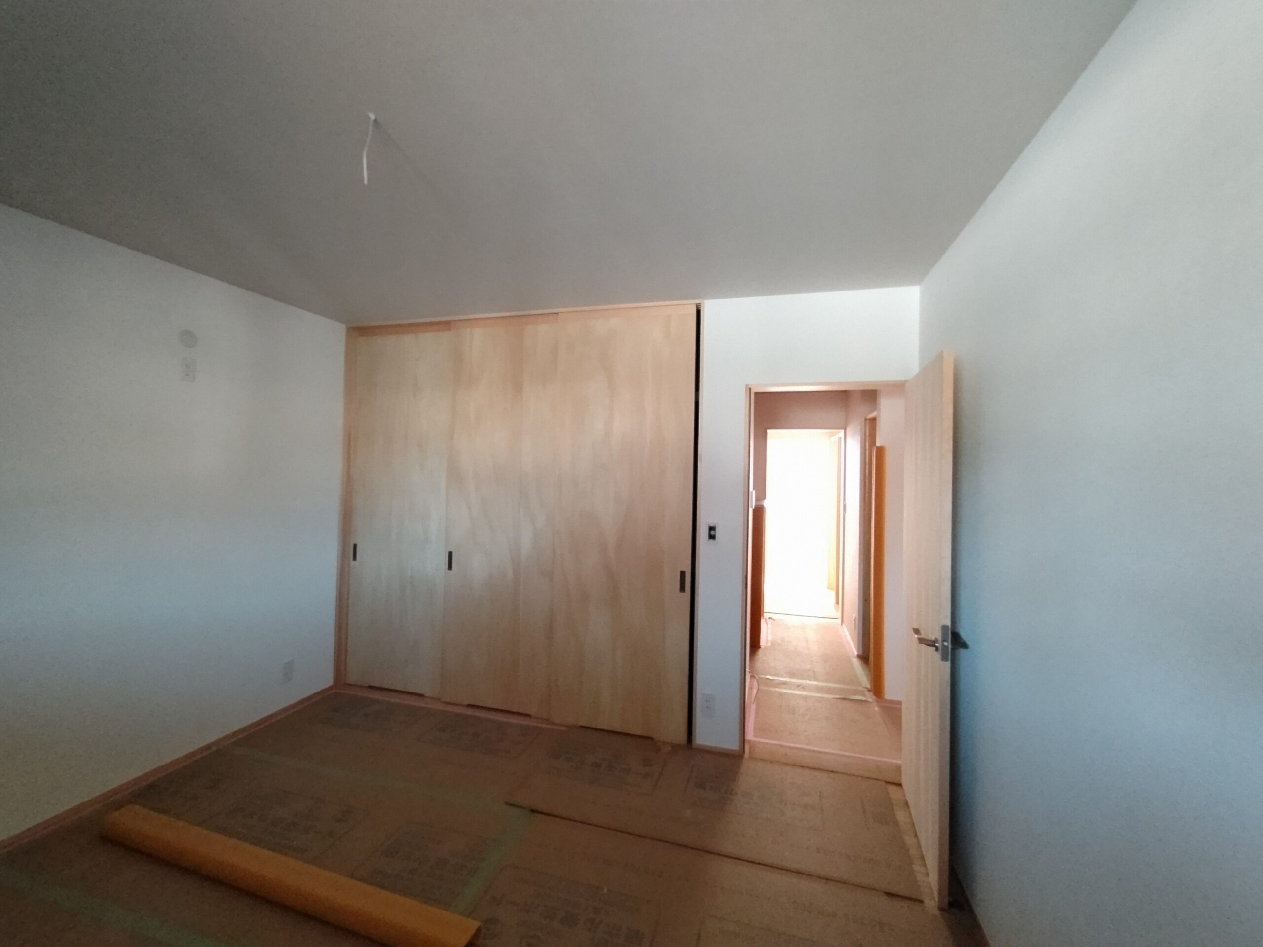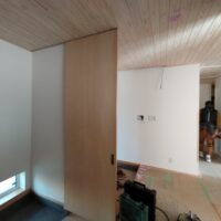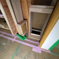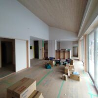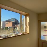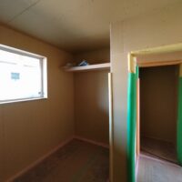 各居室や収納の建具が取り付けられました。筆者が担当する現場はあまり重々しい印象を与えない様子にするために、建具の面材はシナ合板をご提案する事が多いです。形にしてもシンプルイズベストに納める事によって、できるだけ違和感なく収めたいと考えます。