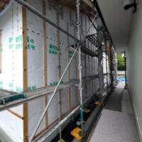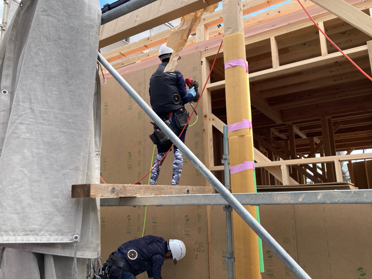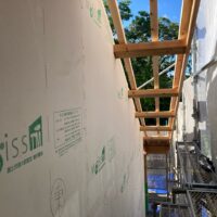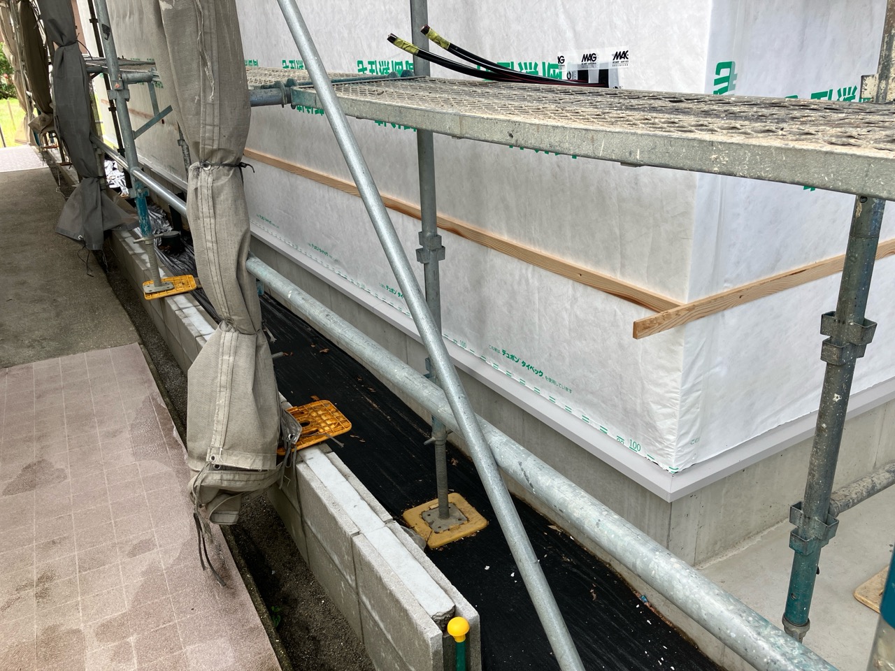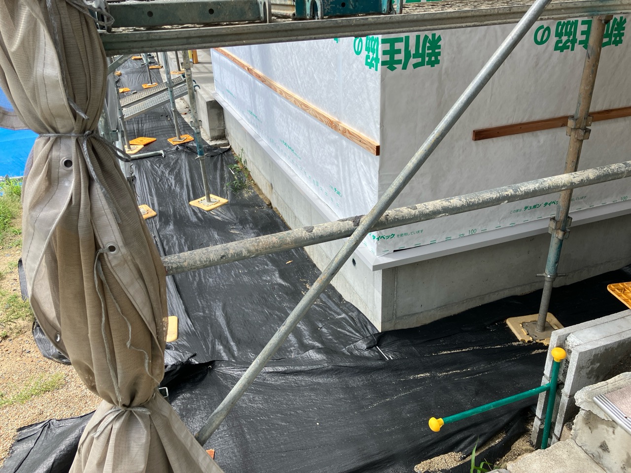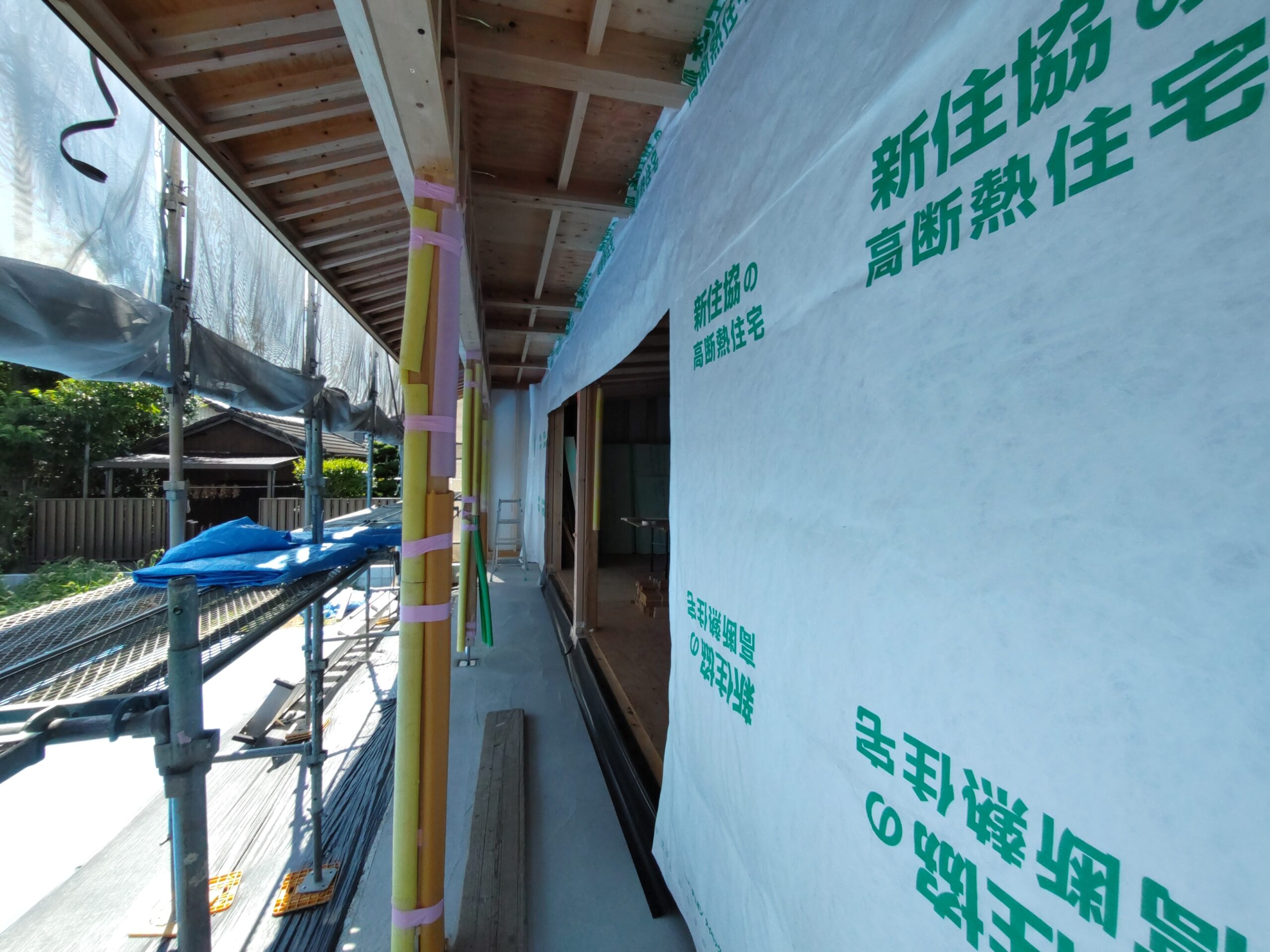 外壁の付加断熱が施され、その上に防水シートが敷設されました。タイミングの問題か、いつも付加断熱を施工している状況に立ち会えず、終わった後にこうして撮影しています。防水シート敷設前なら住宅が断熱材で覆われている状況が良く分かるのですが。
