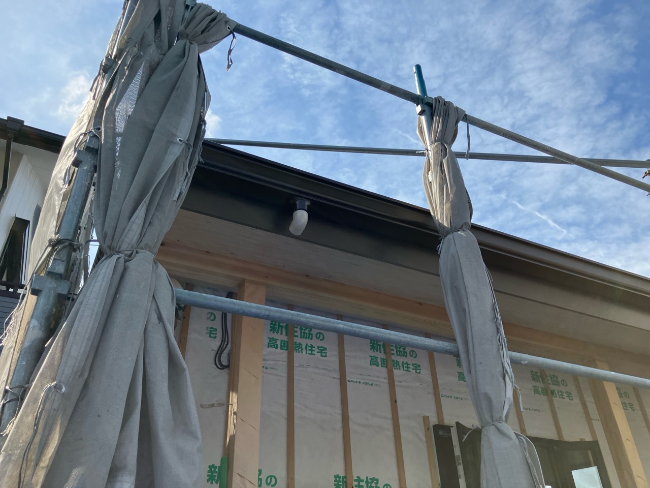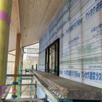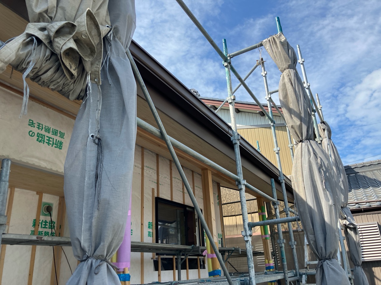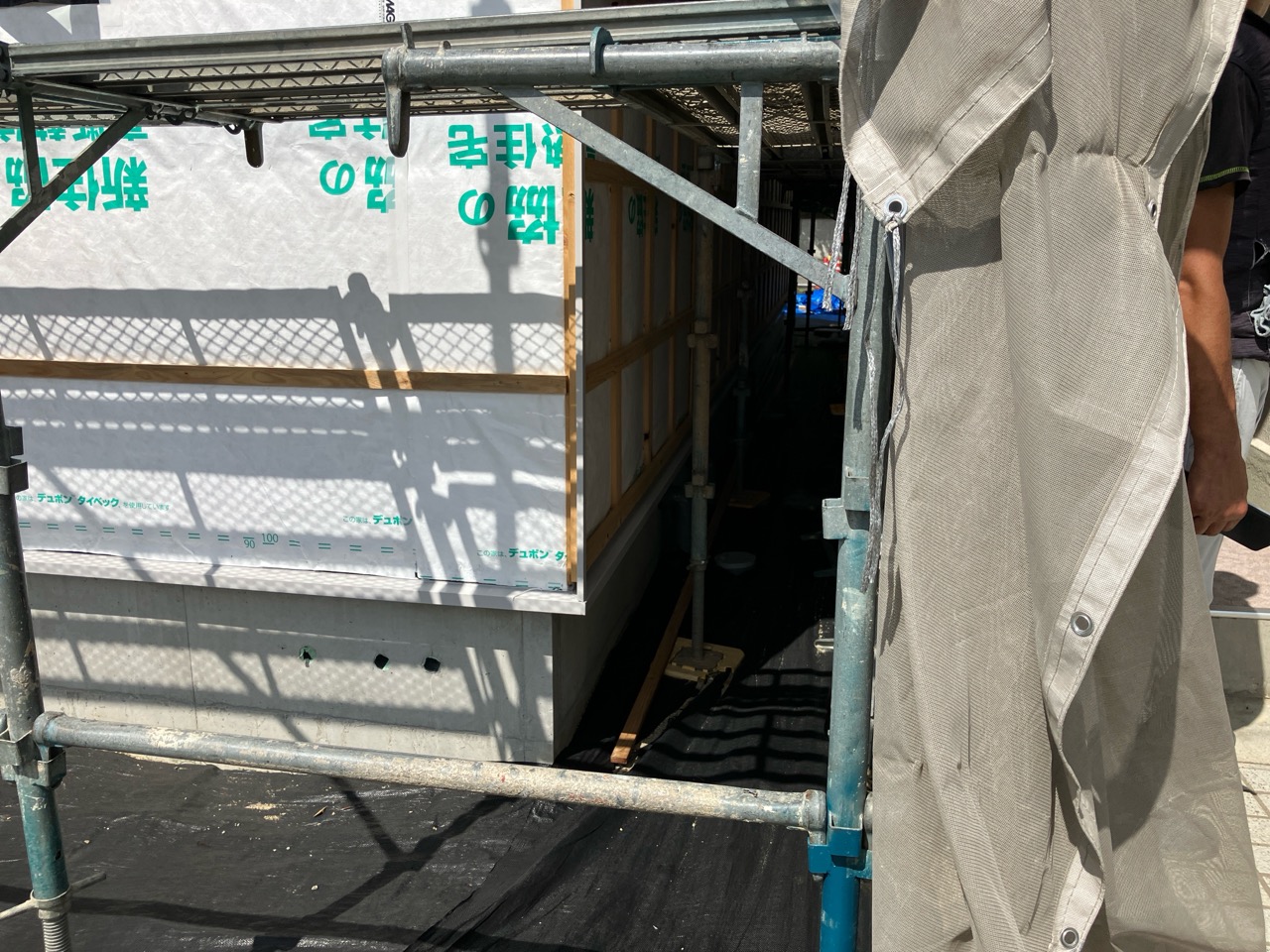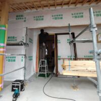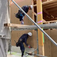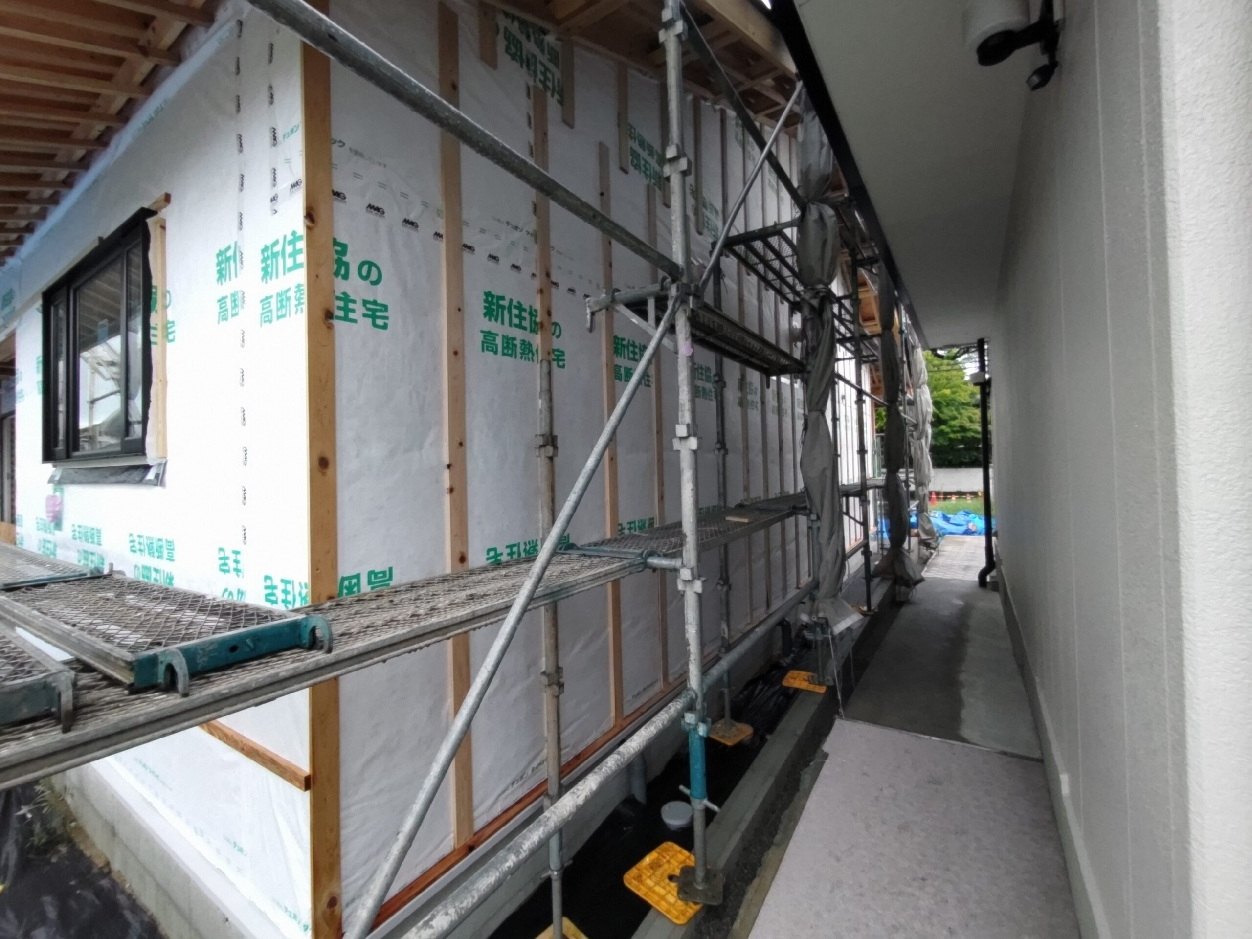 外壁の付加断熱が施され、その上に防水シートが敷設されました。タイミングの問題か、いつも付加断熱を施工している状況に立ち会えず、終わった後にこうして撮影しています。防水シート敷設前なら住宅が断熱材で覆われている状況が良く分かるのですが。