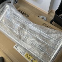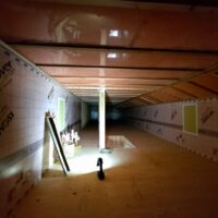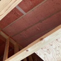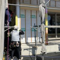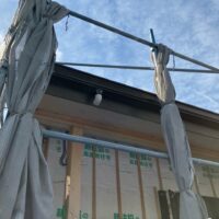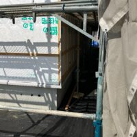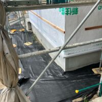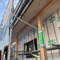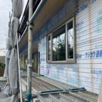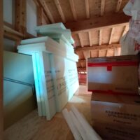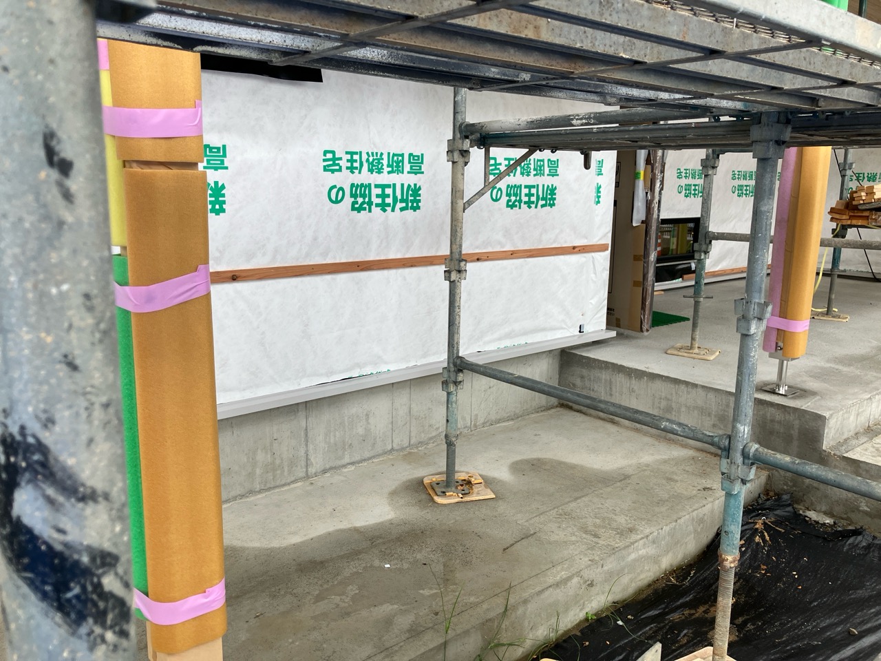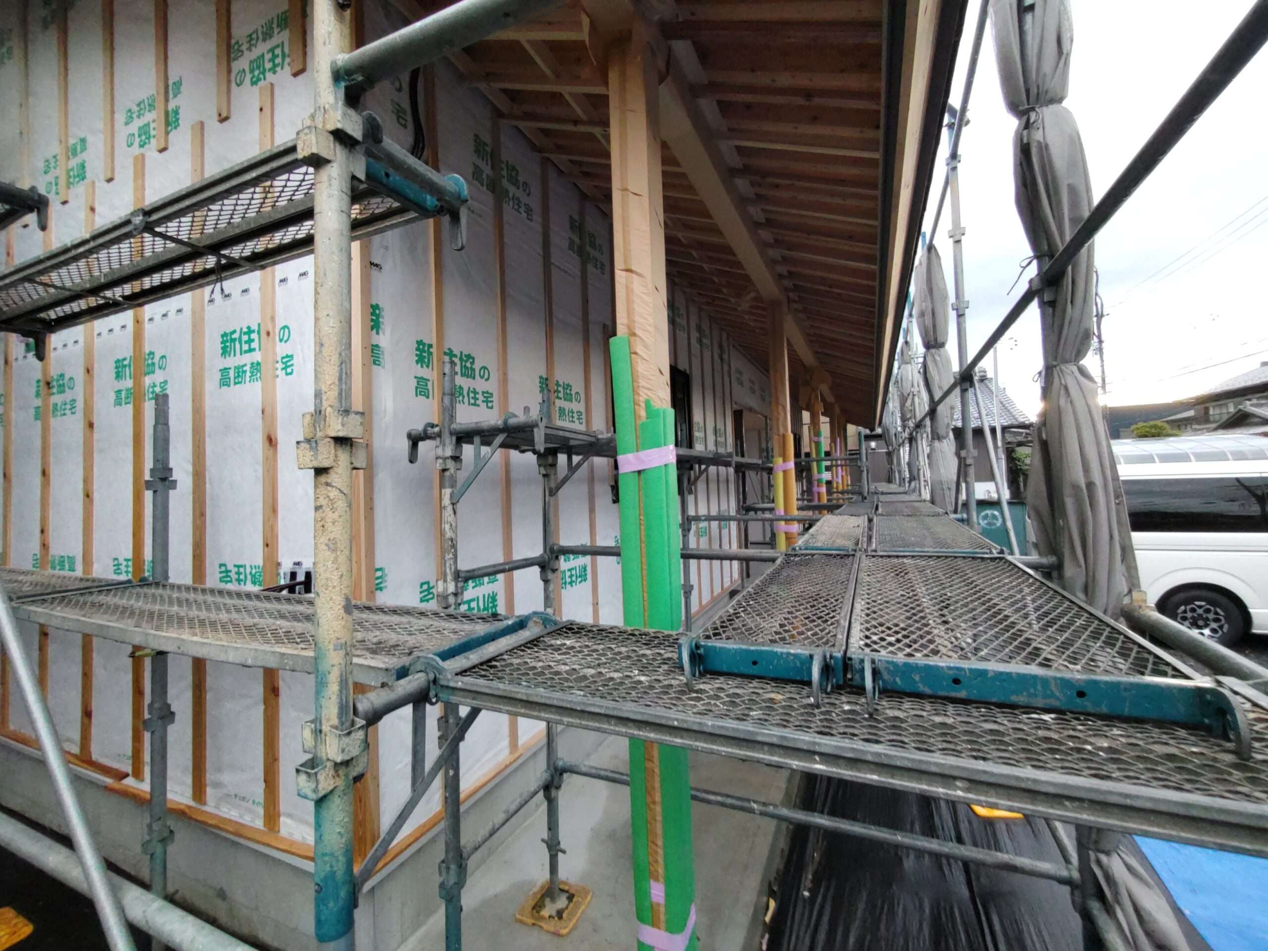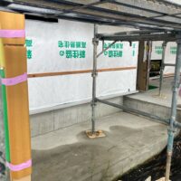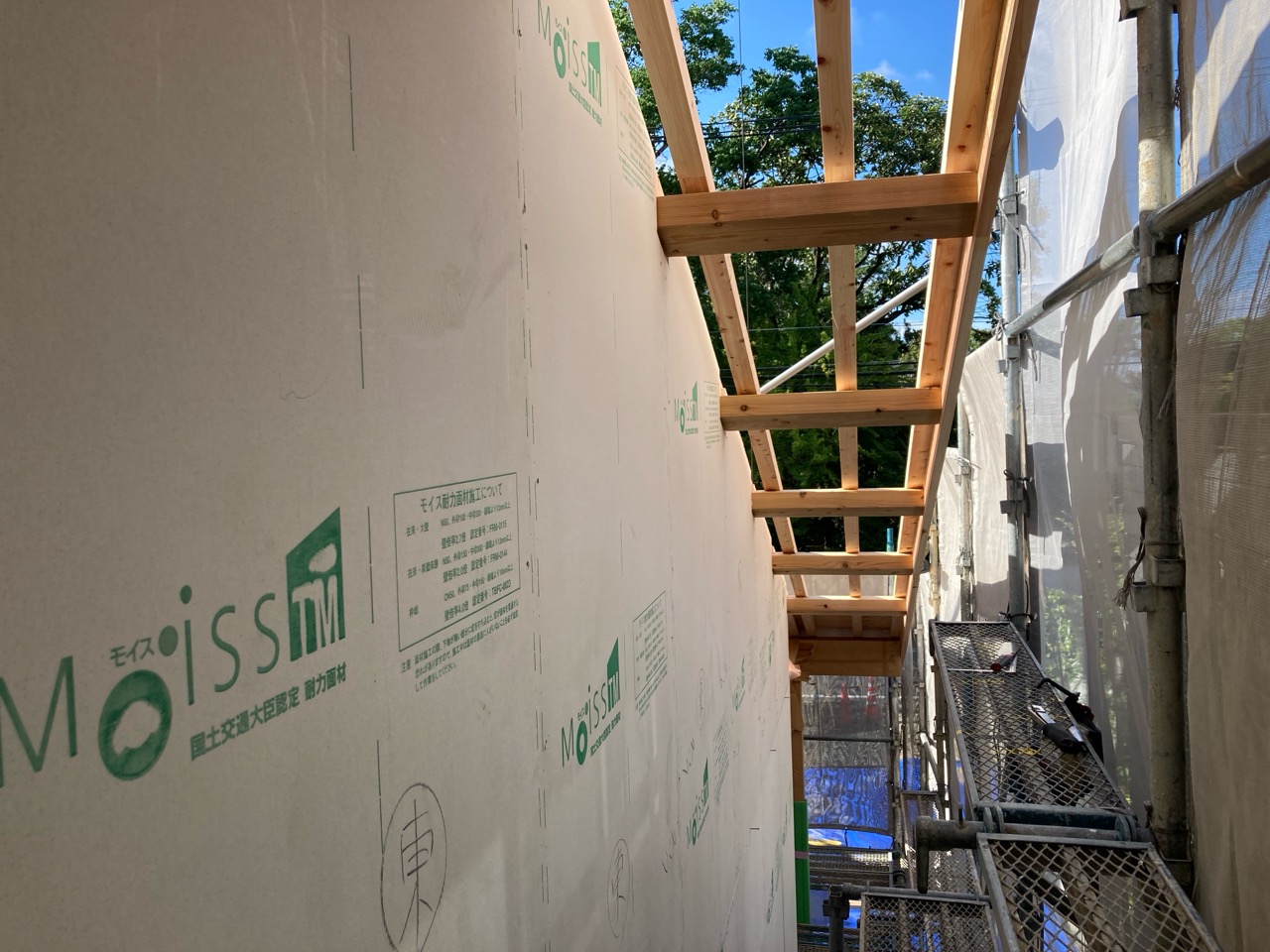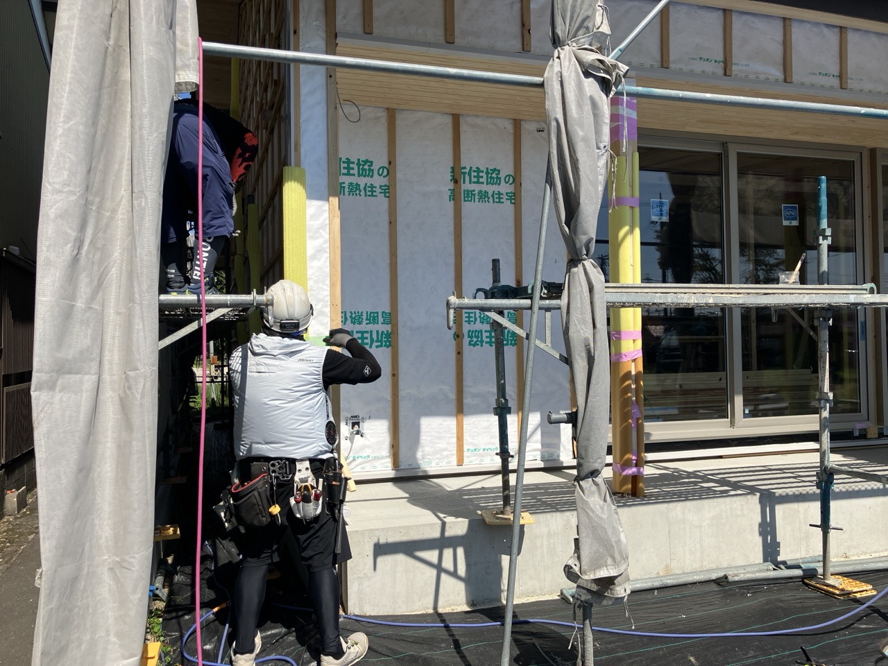 外壁の付加断熱が施され、その上に防水シートが敷設されました。タイミングの問題か、いつも付加断熱を施工している状況に立ち会えず、終わった後にこうして撮影しています。防水シート敷設前なら住宅が断熱材で覆われている状況が良く分かるのですが。