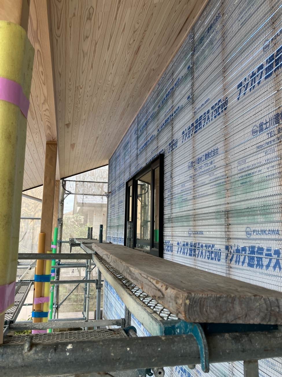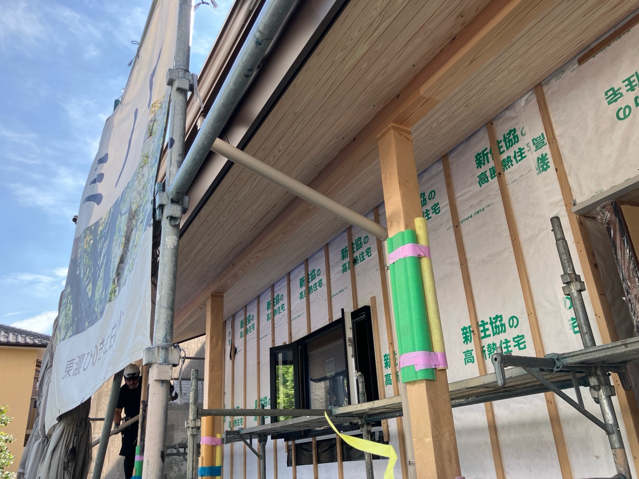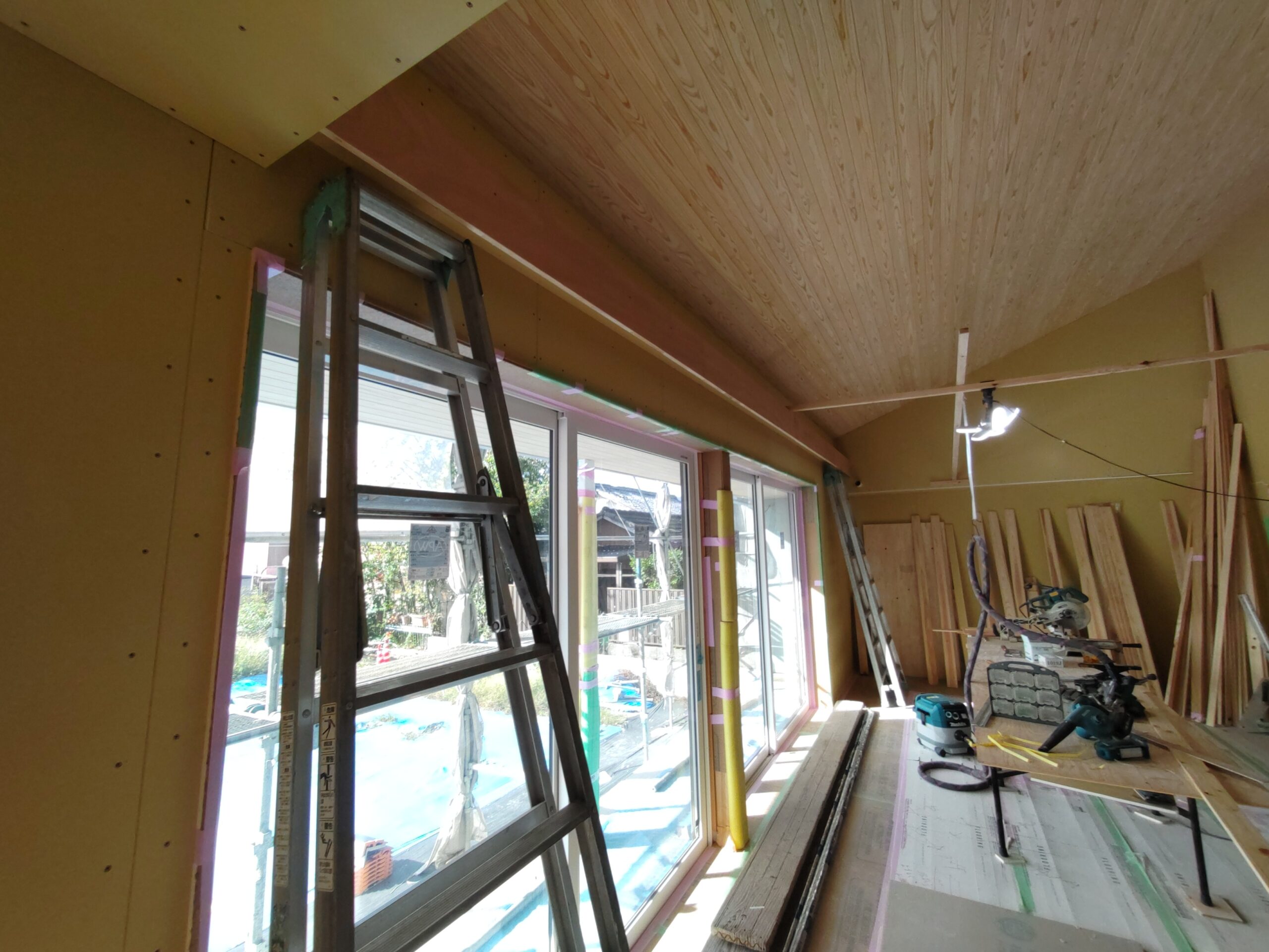 棟梁は灼熱の小屋裏作業を終え、軒の天井を張っています。まだ残暑が厳しい屋外とは言え小屋裏に比べれば時折吹く風が涼しい1階とは雲泥の差です。