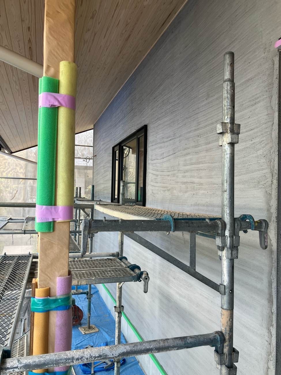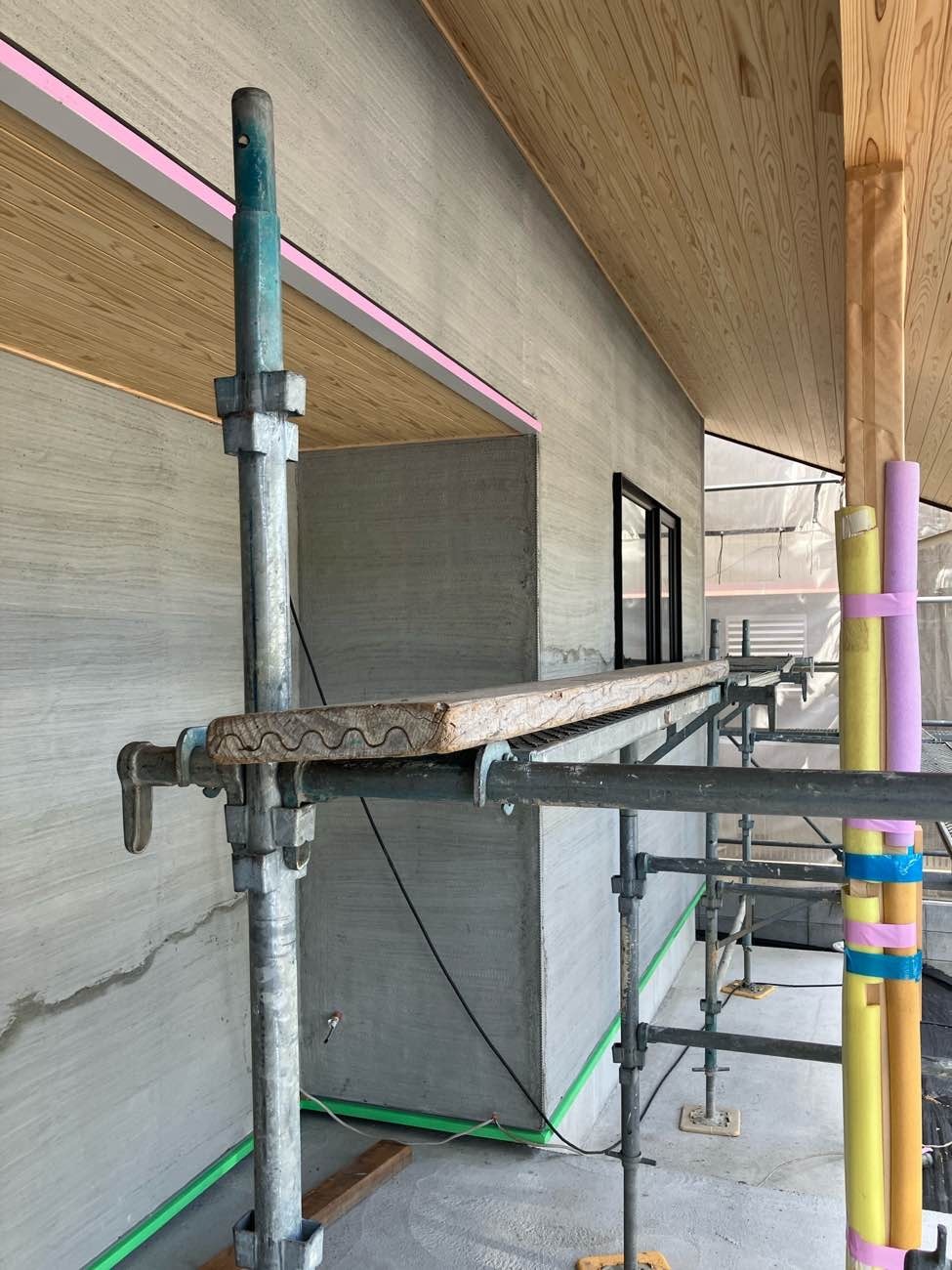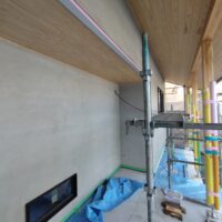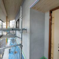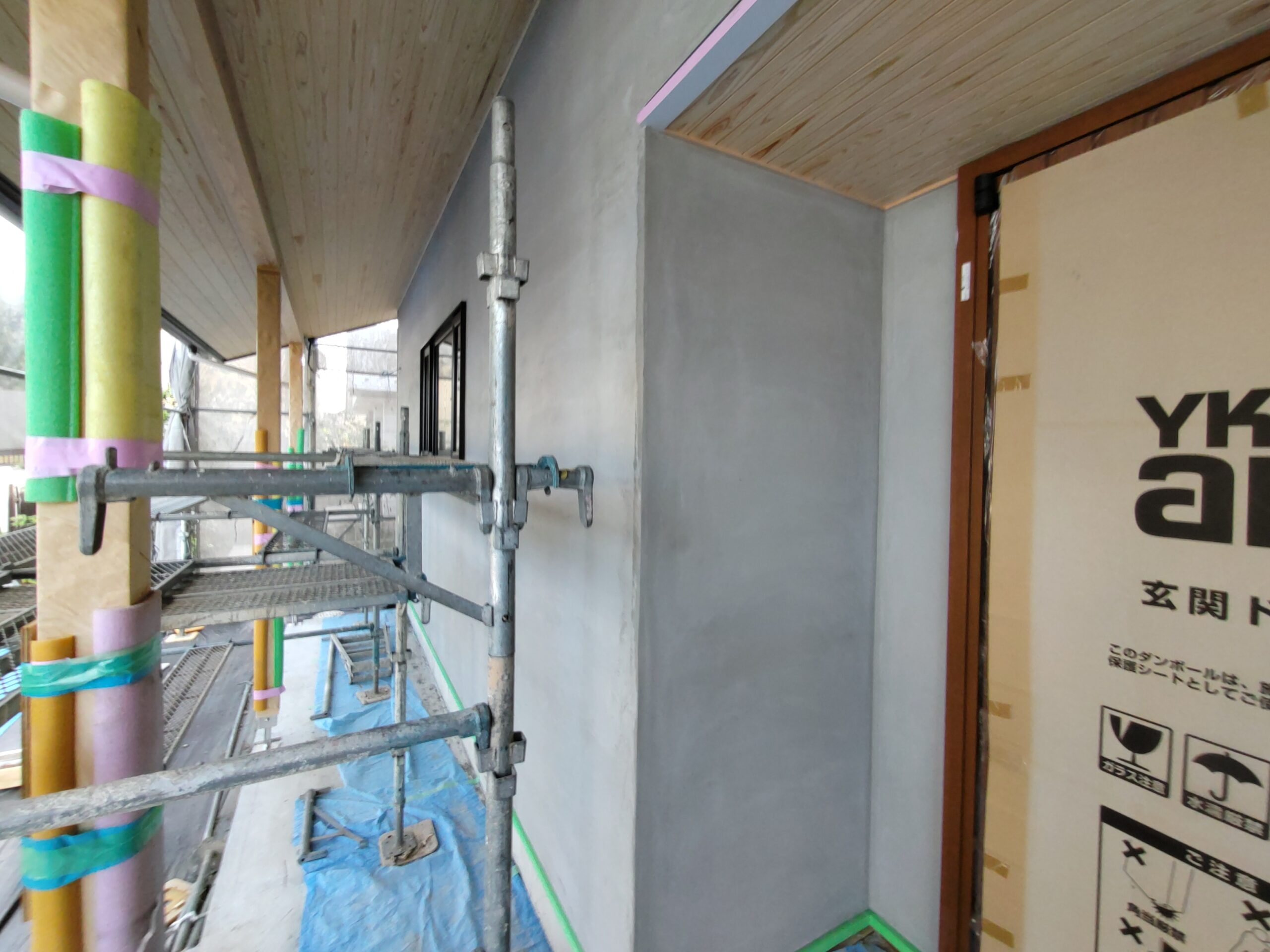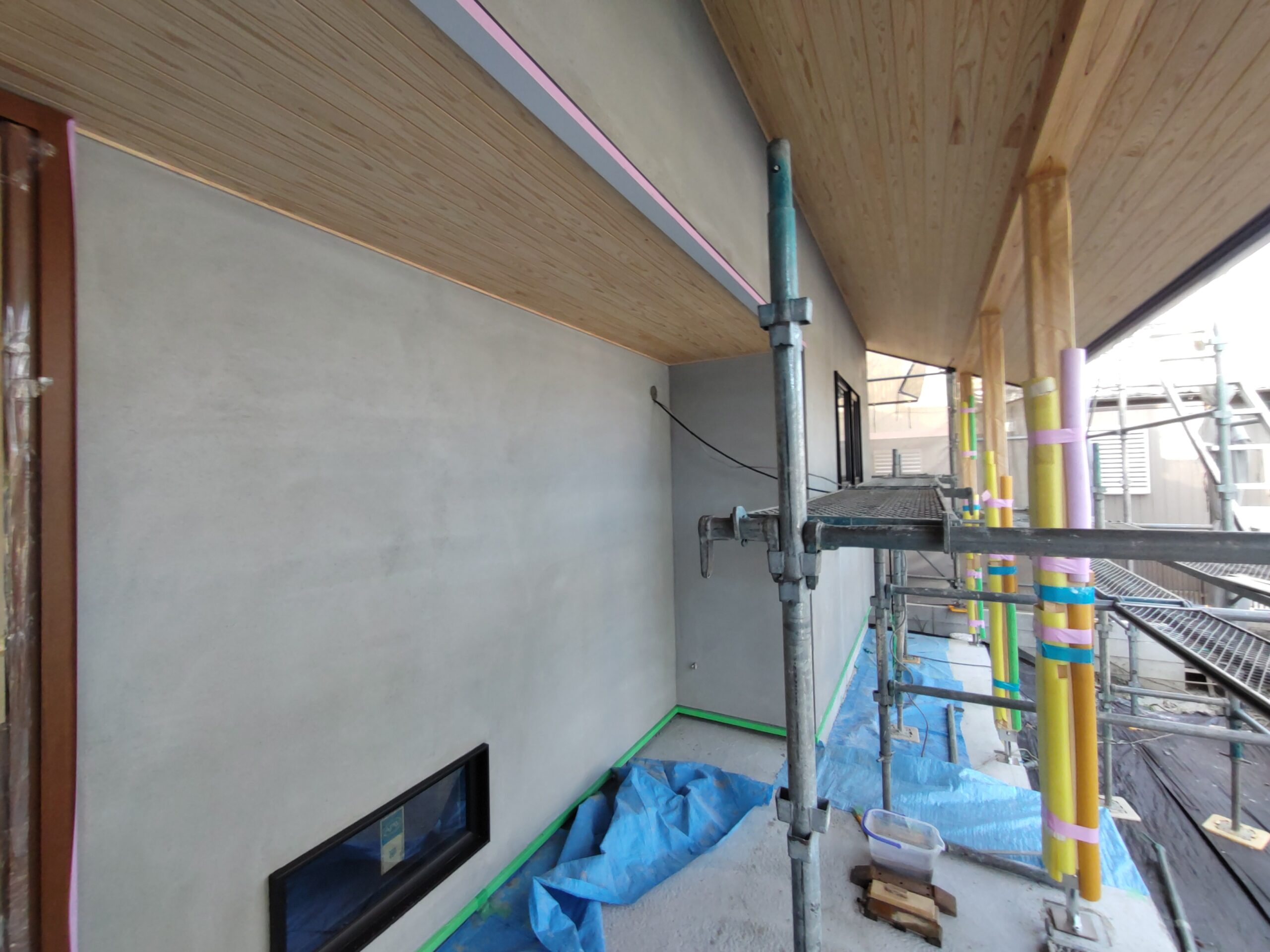 外壁左官工事は中塗りが終わり、表面が綺麗に均されてきました。乾燥を待っていよいよ仕上塗に入ります。
