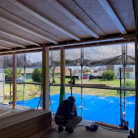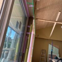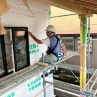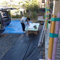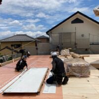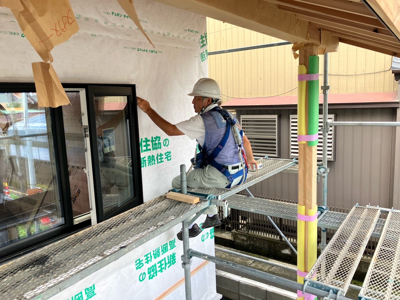 外装に係る工事を進めていきます。棟梁は現場に届いたサッシ関係を順番に取付け。瓦業者のO嶋屋さんは瓦桟を打つ前の流水テープ張りをしています。このテープを流れ方向に張っておいてその上に水平方向に瓦桟を打つ事で下に潜り込んだ雨水も止まることなく流れていきます。