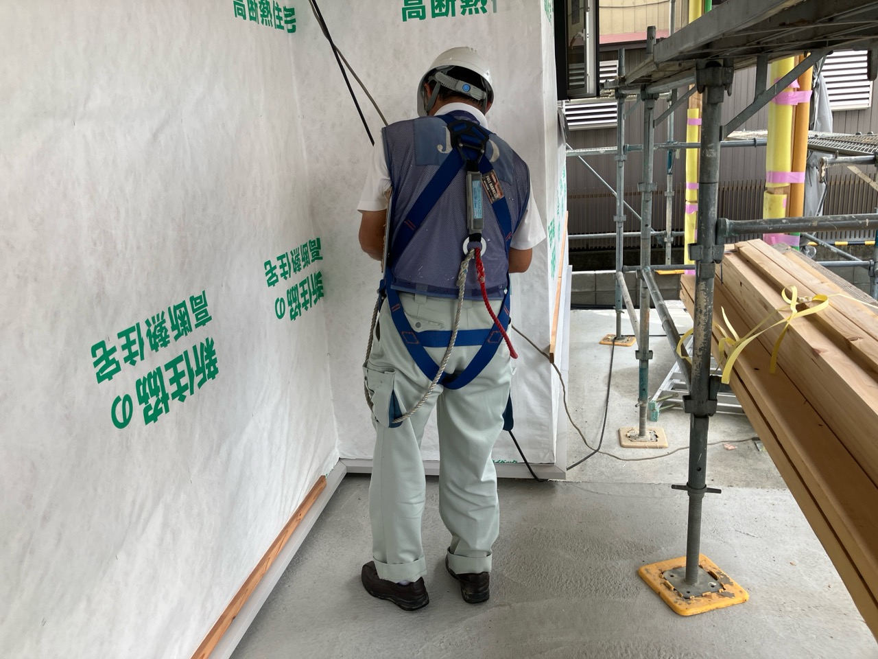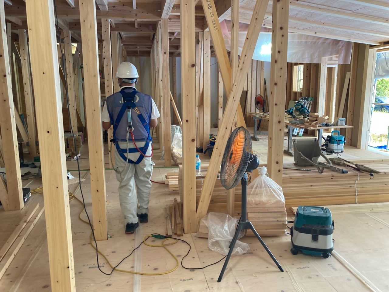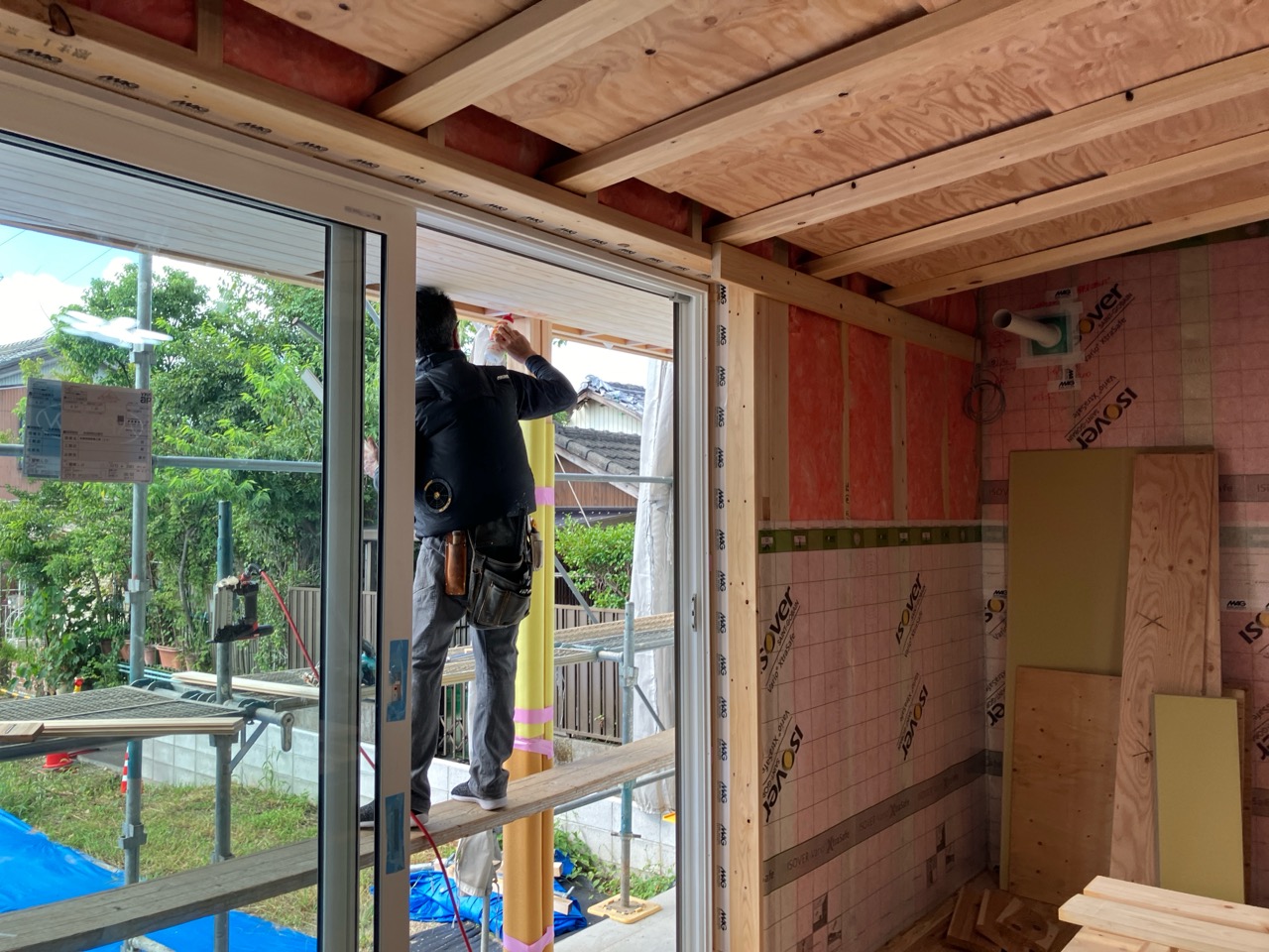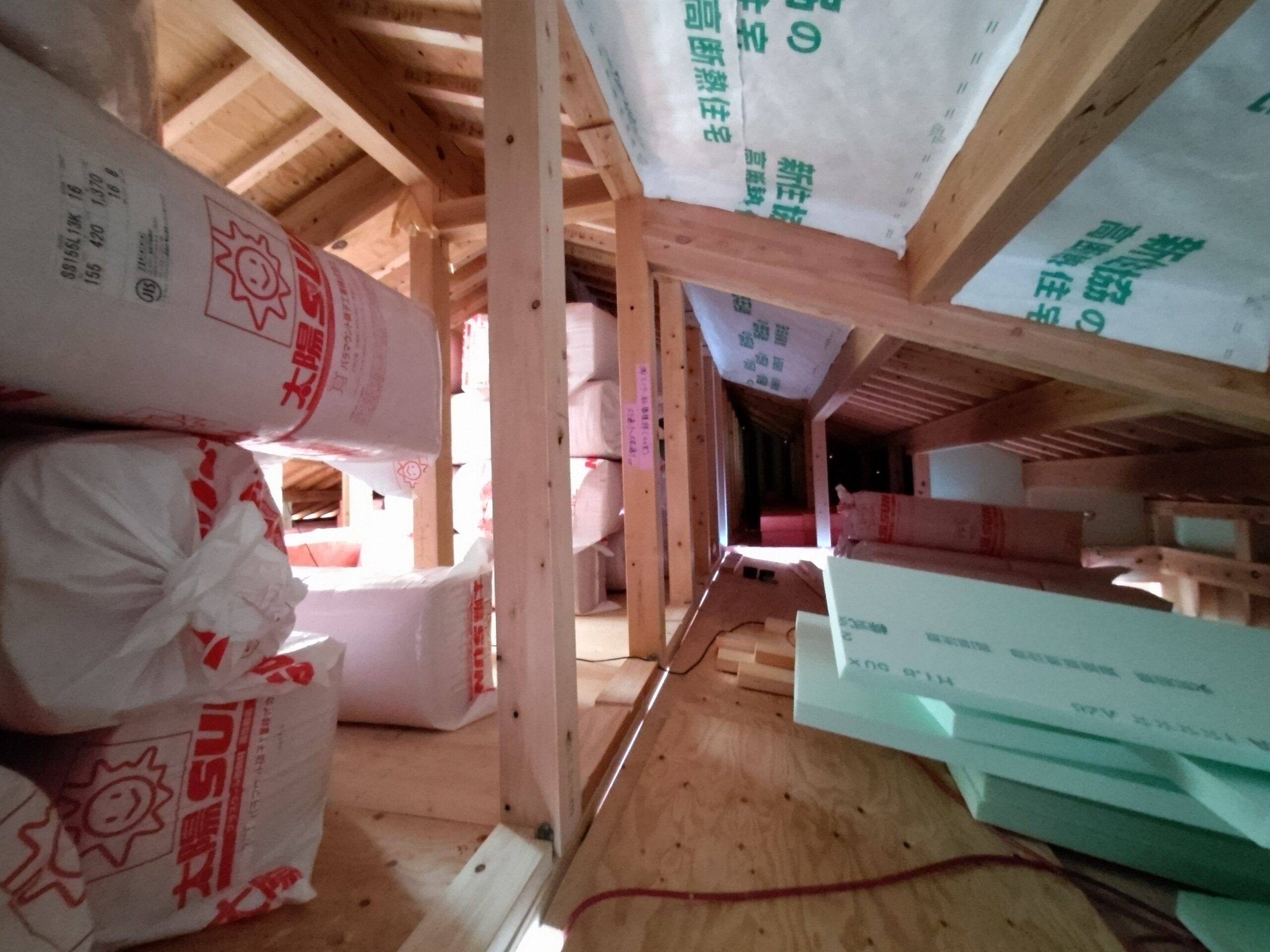 道行く人には熱風と感じられる真昼の風も、現場の中では涼風に感じる環境の中、断熱工事は音もなく粛々とグラスウールが敷設されていきます。