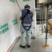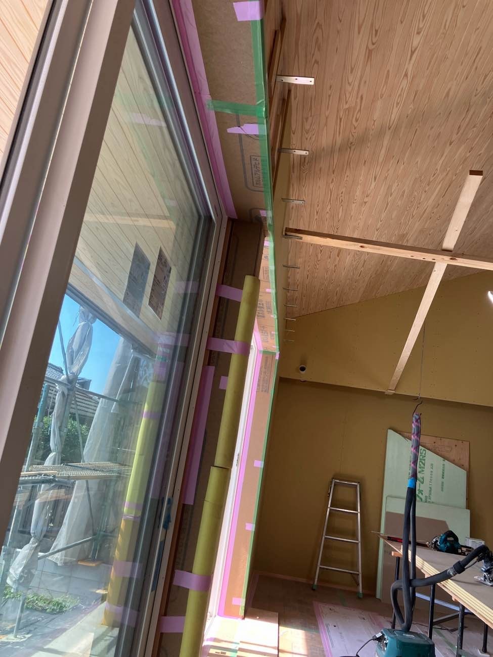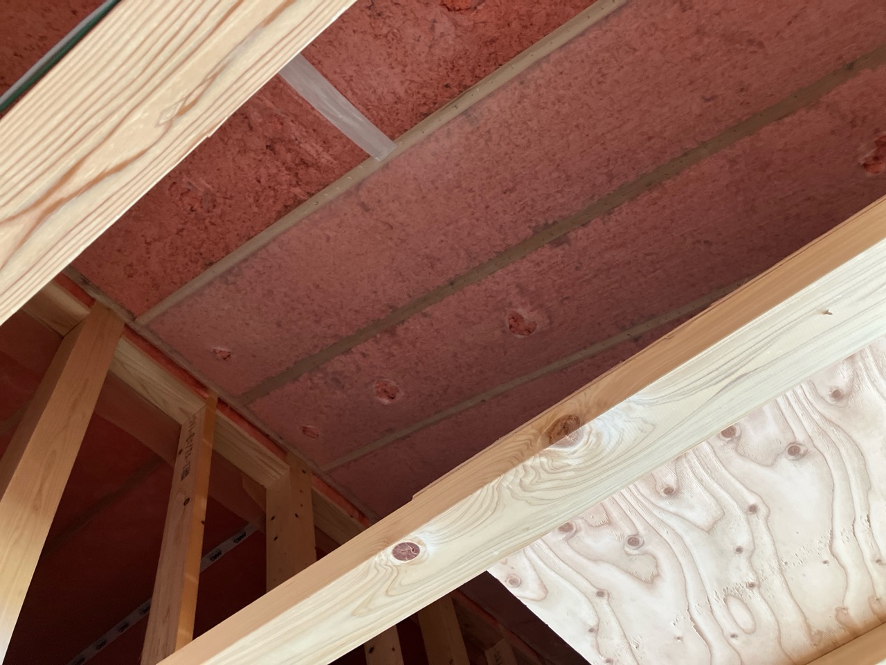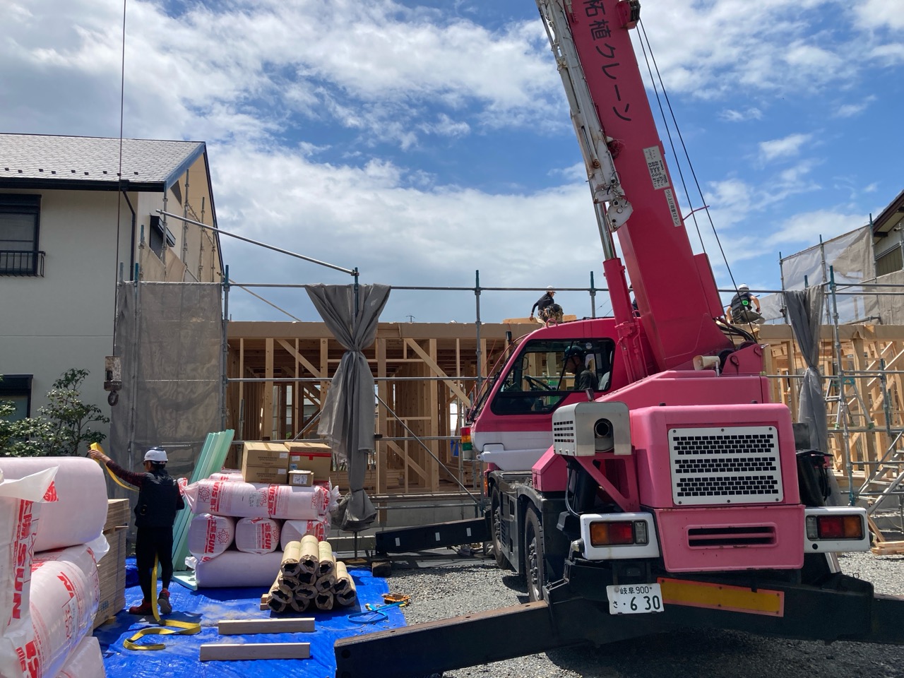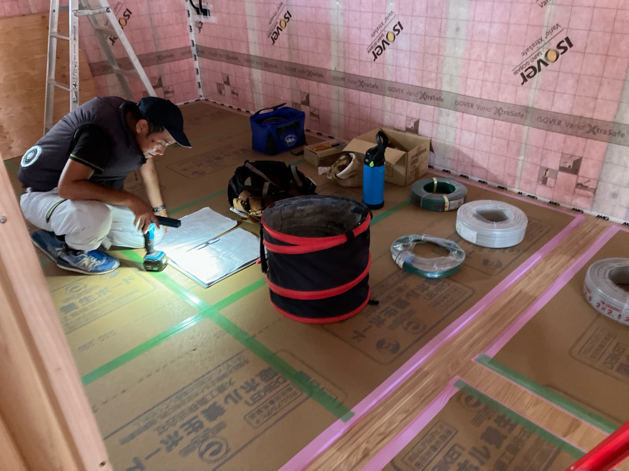 道行く人には熱風と感じられる真昼の風も、現場の中では涼風に感じる環境の中、断熱工事は音もなく粛々とグラスウールが敷設されていきます。