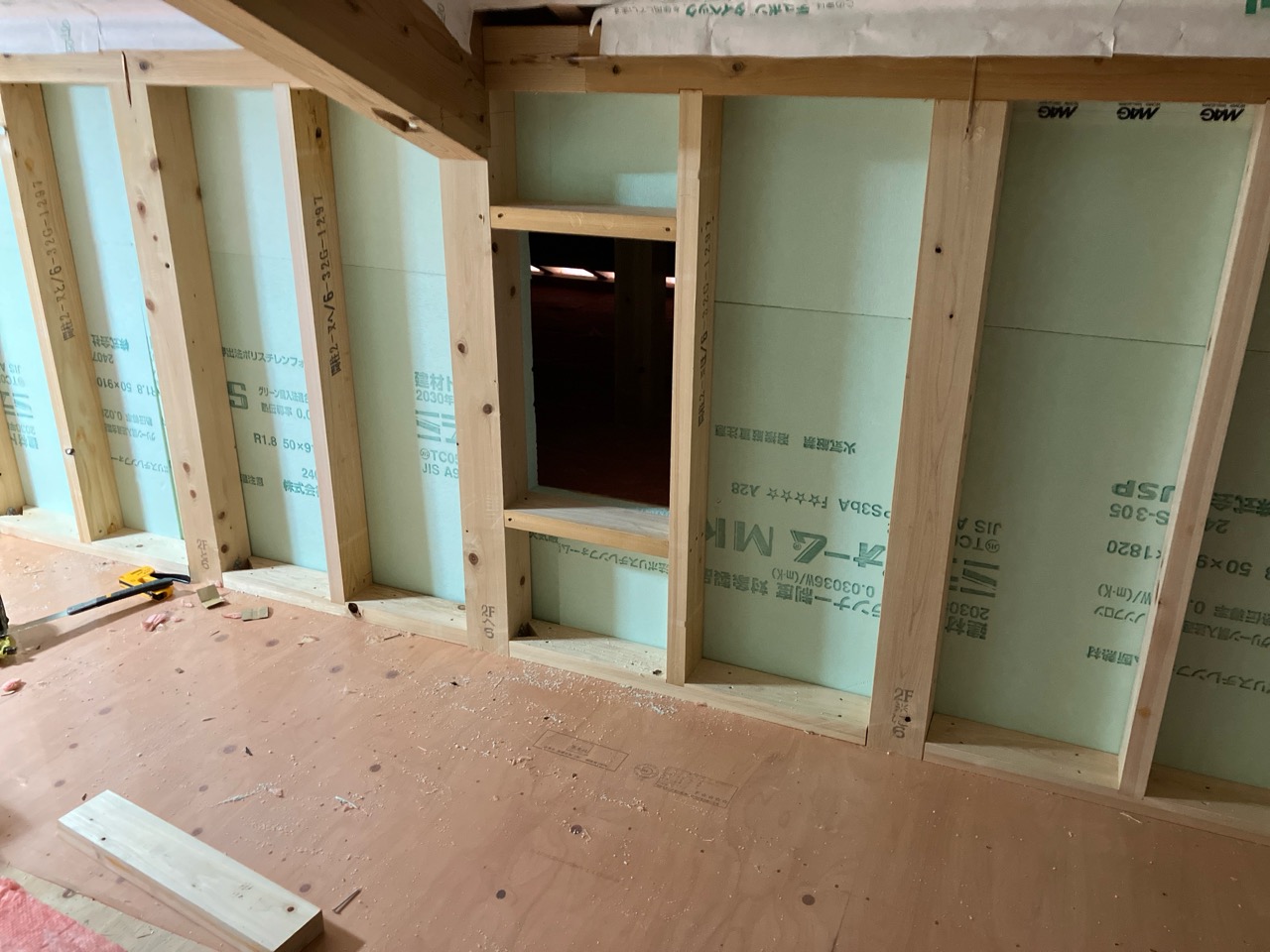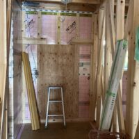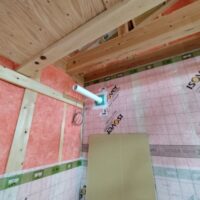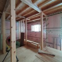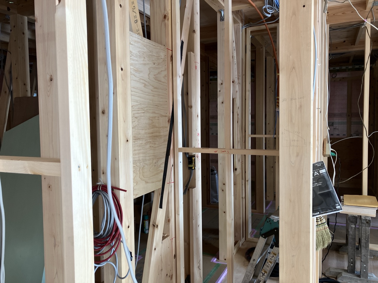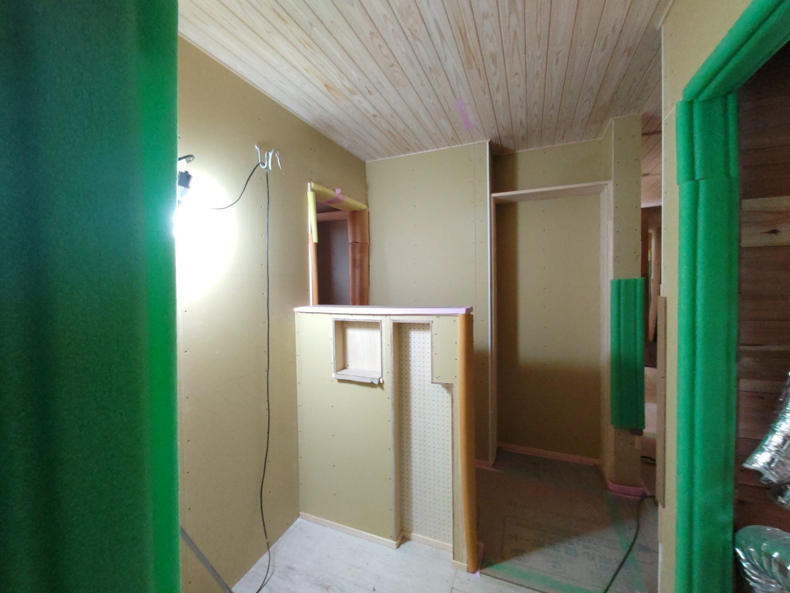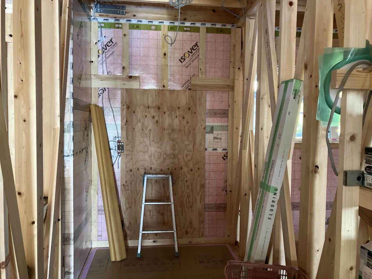 屋内では間仕切り壁下地を製作しつつ、いろいろな箇所に合板下地が打たれていきます。内装仕上げが終わった後に機器を取付ける場所には留め付けビスを効かせるために木下地を入れておきます。