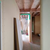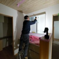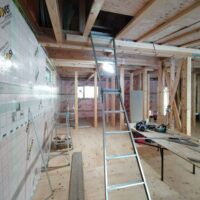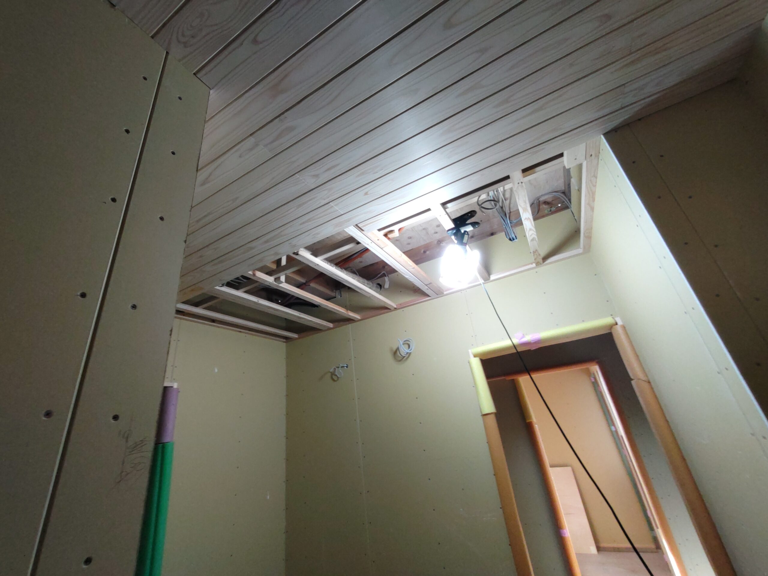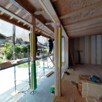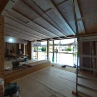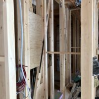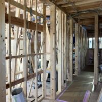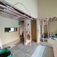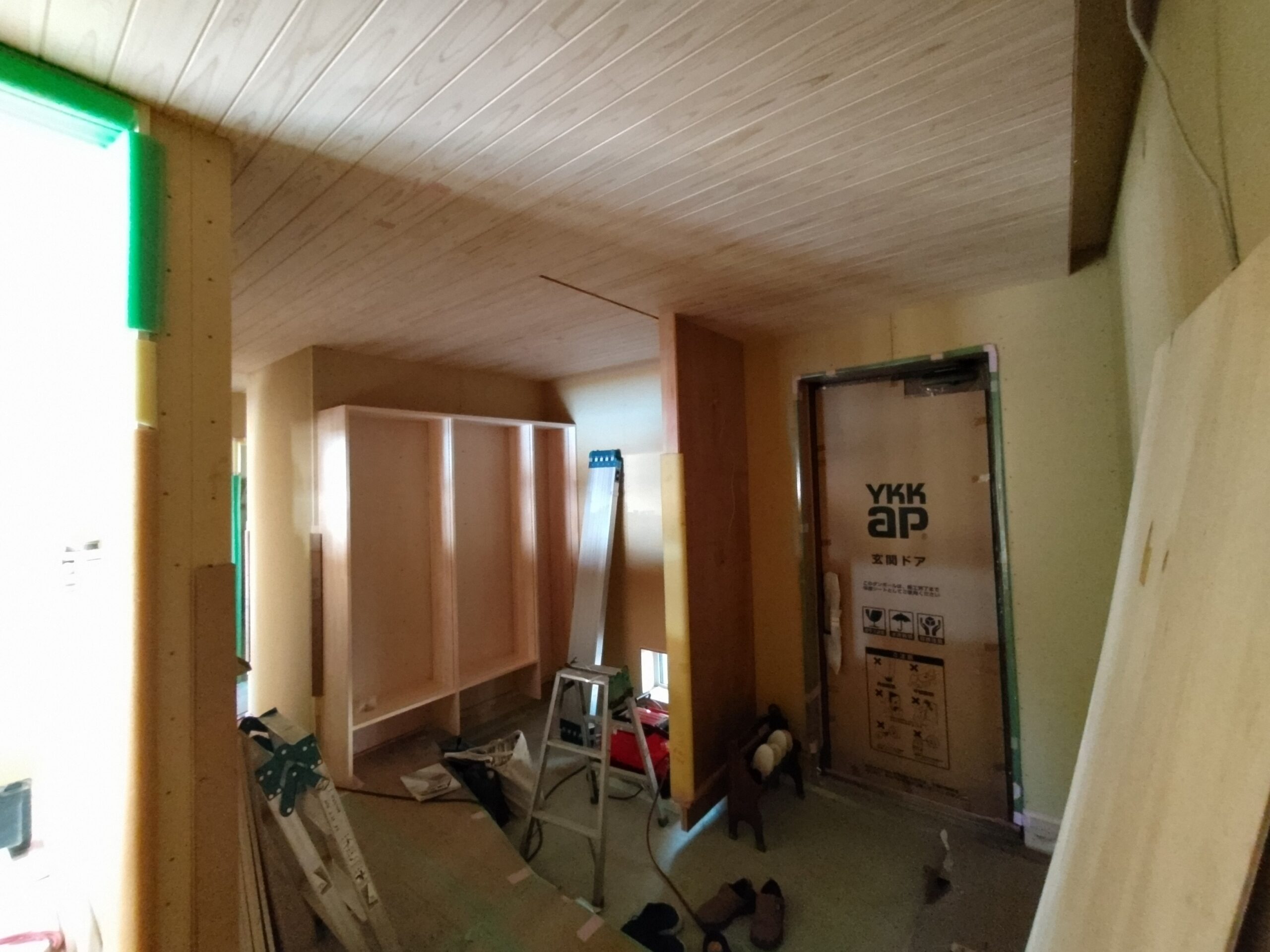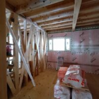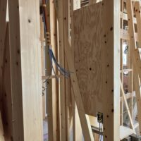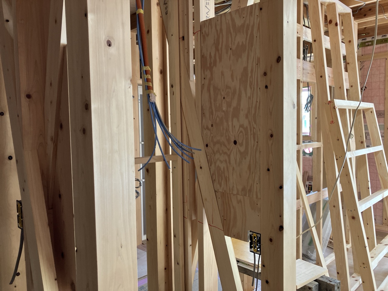 屋内では間仕切り壁下地を製作しつつ、いろいろな箇所に合板下地が打たれていきます。内装仕上げが終わった後に機器を取付ける場所には留め付けビスを効かせるために木下地を入れておきます。