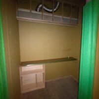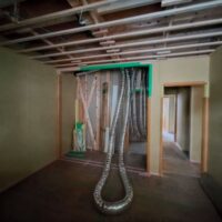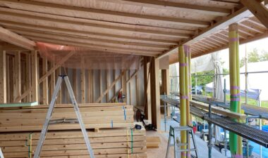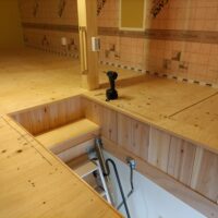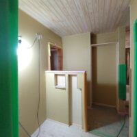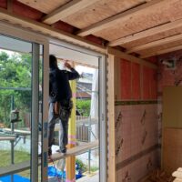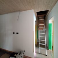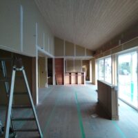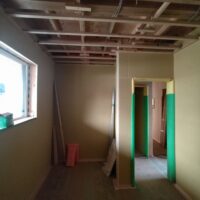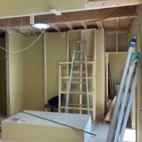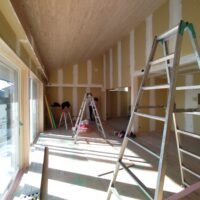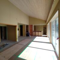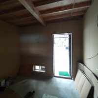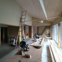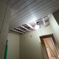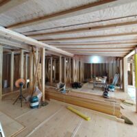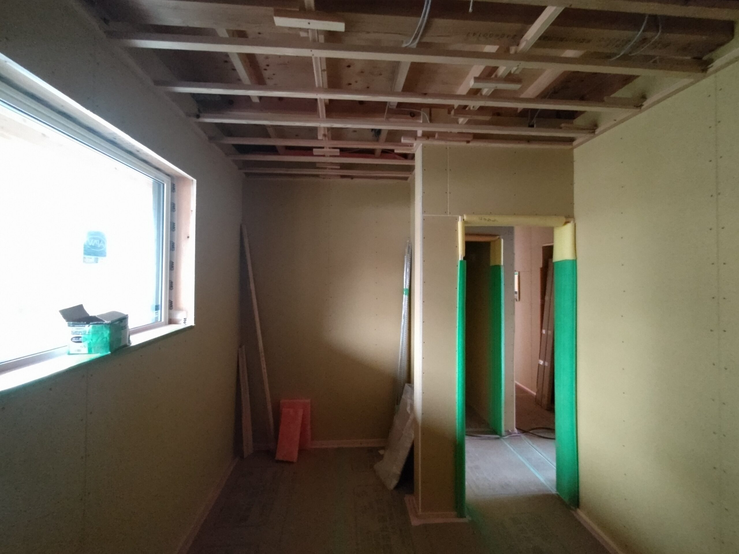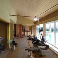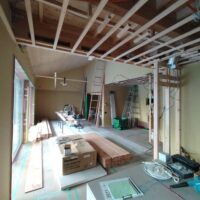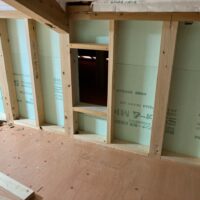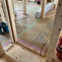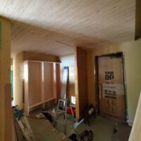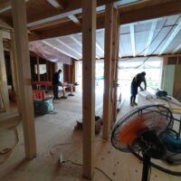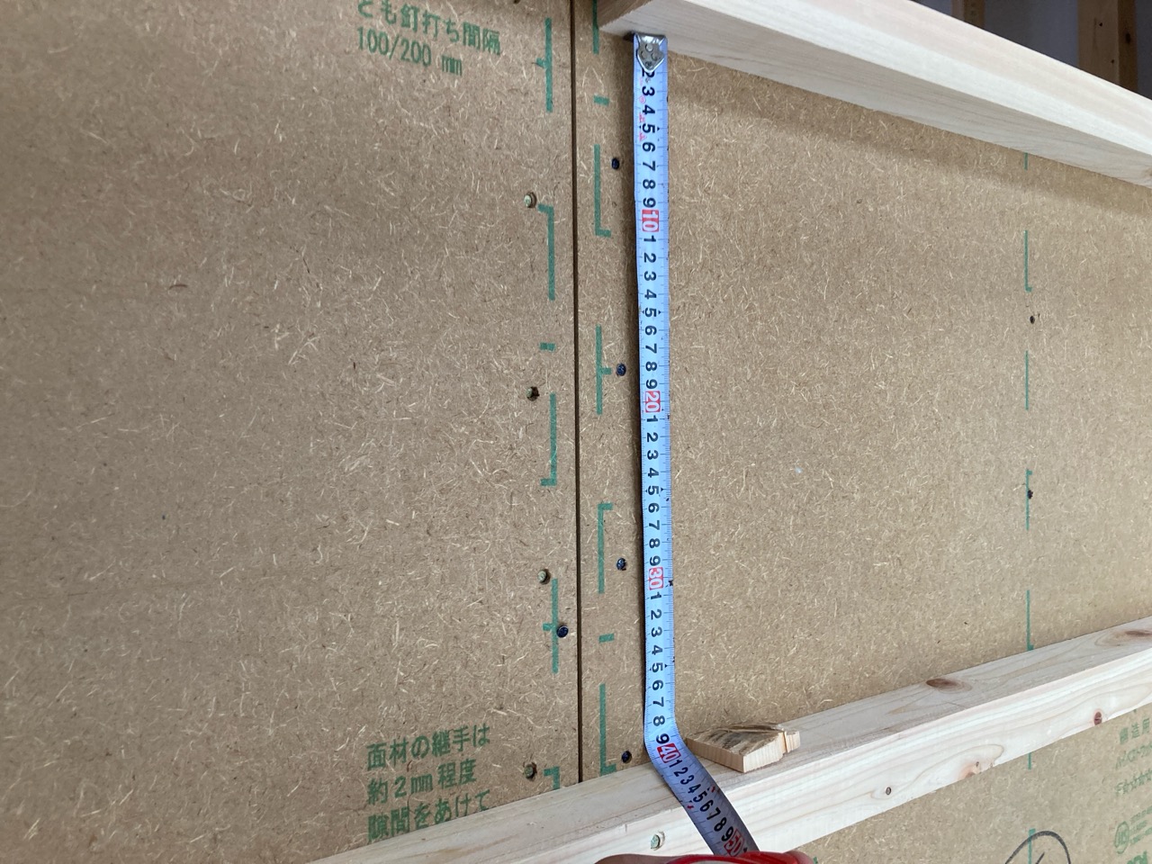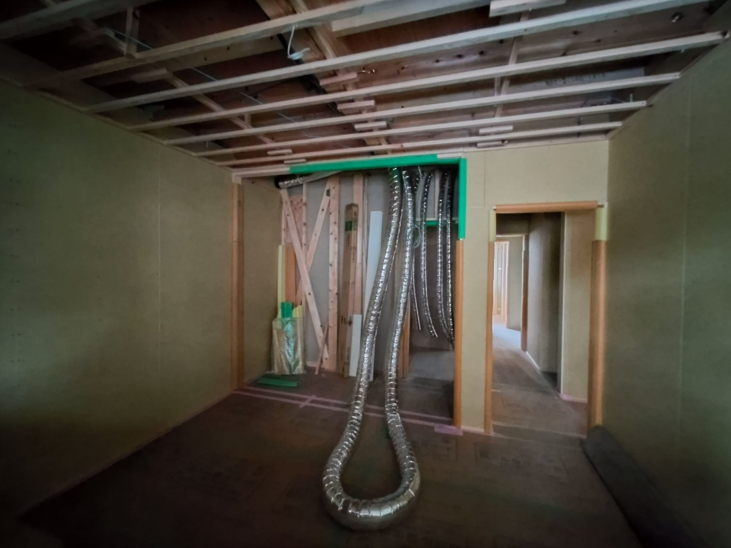屋内では間仕切り壁下地を製作しつつ、いろいろな箇所に合板下地が打たれていきます。内装仕上げが終わった後に機器を取付ける場所には留め付けビスを効かせるために木下地を入れておきます。