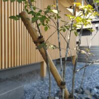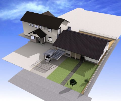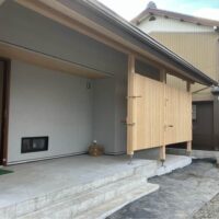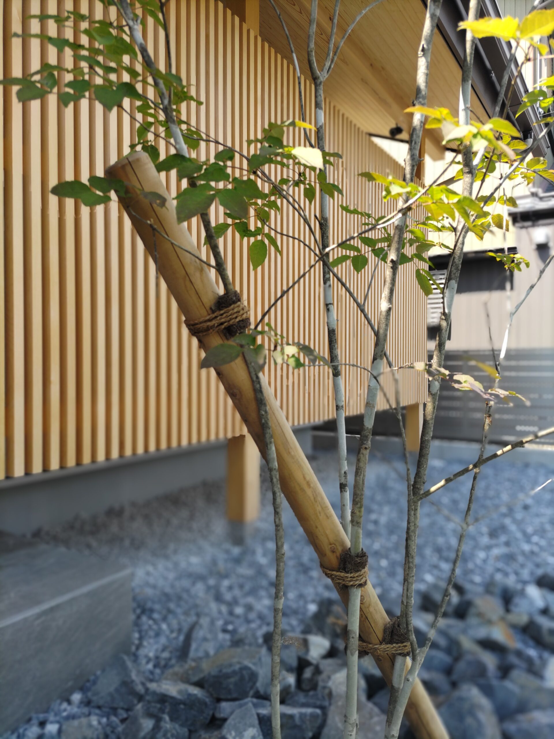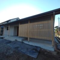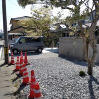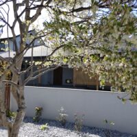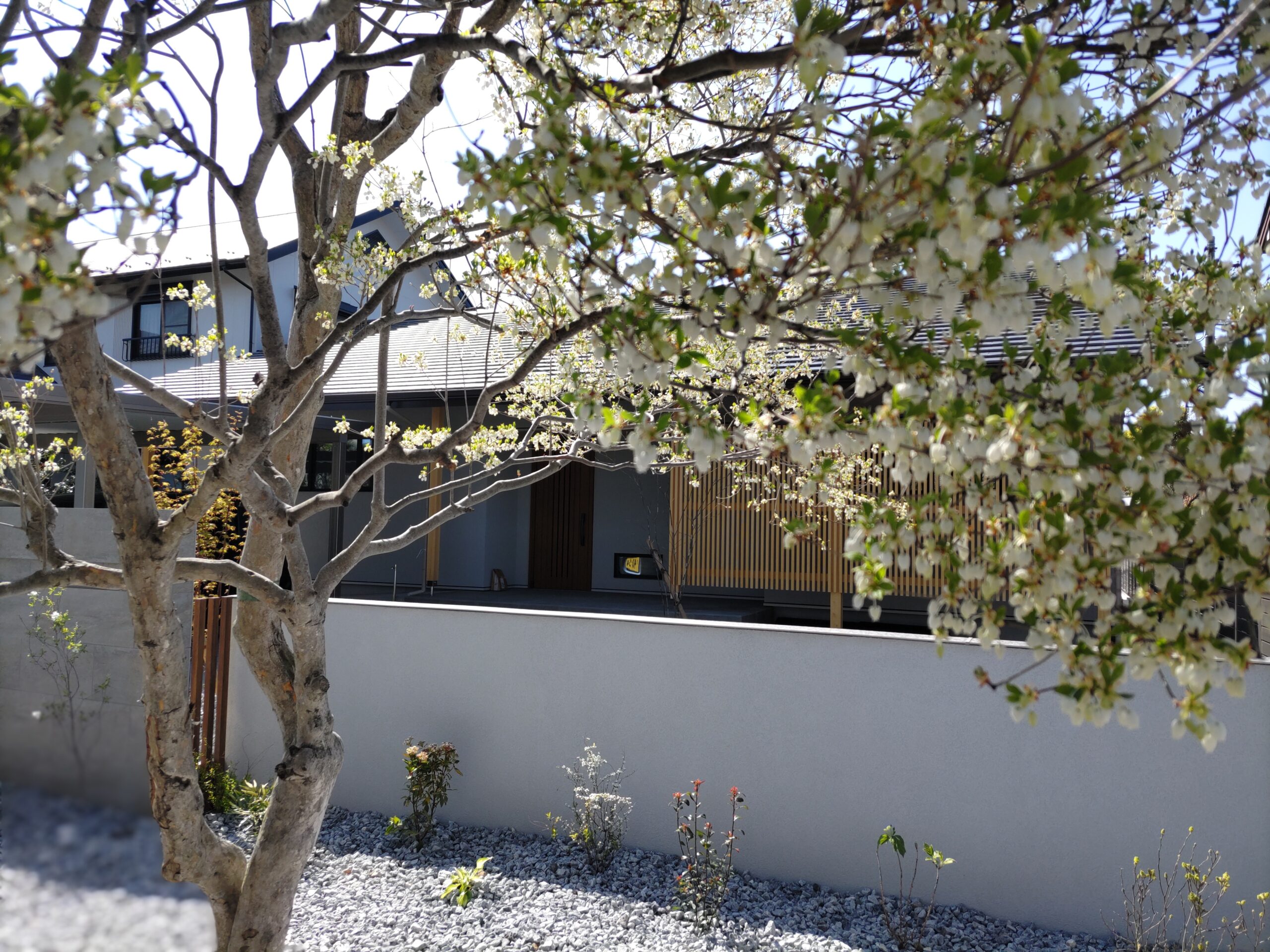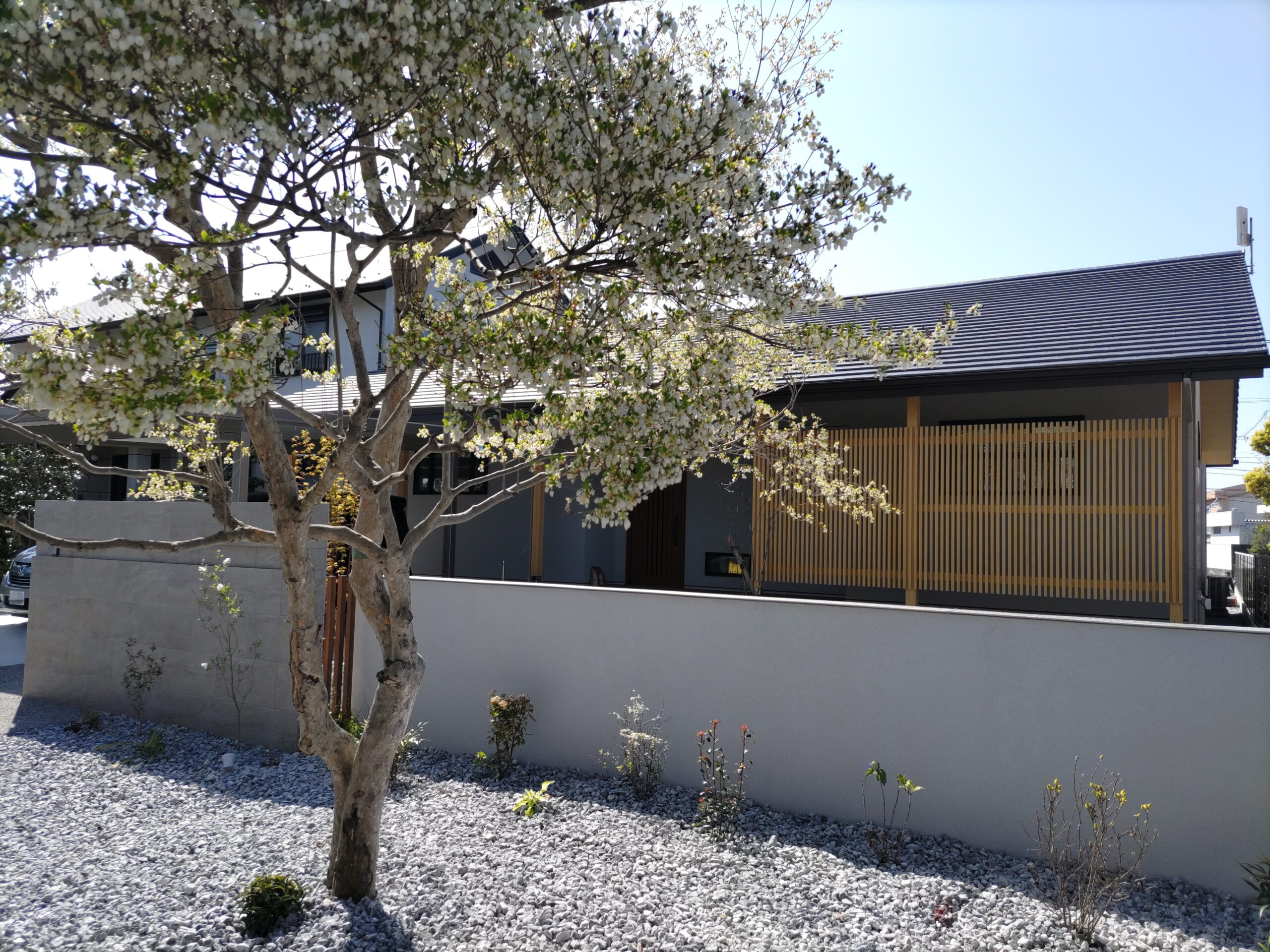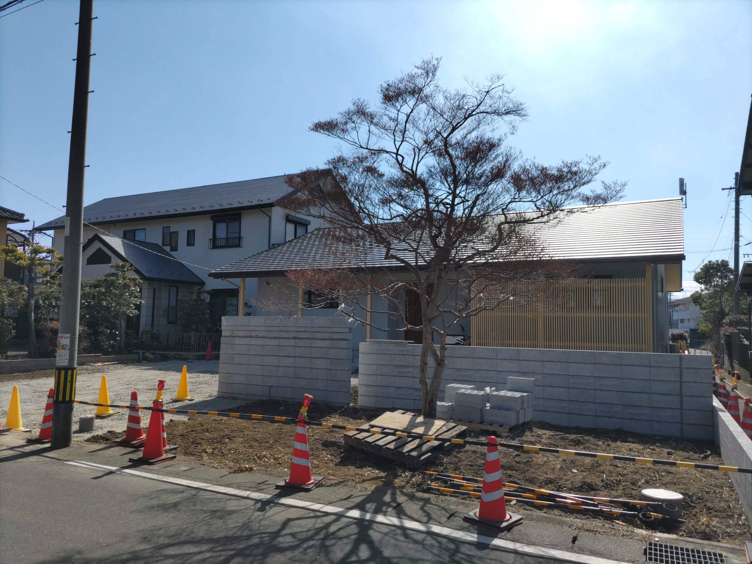 別件で書類をお届けにうかがいました。外構工事も大詰めを迎えています。来客用の車両も駐車できるように道路からだいぶ奥に控えて配置計画を行いましたので前庭にかなりのゆとりがあります。春先にシンボルツリーに花が咲き、その奥に平屋建ての建物があり、非常に画になる構図です。