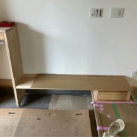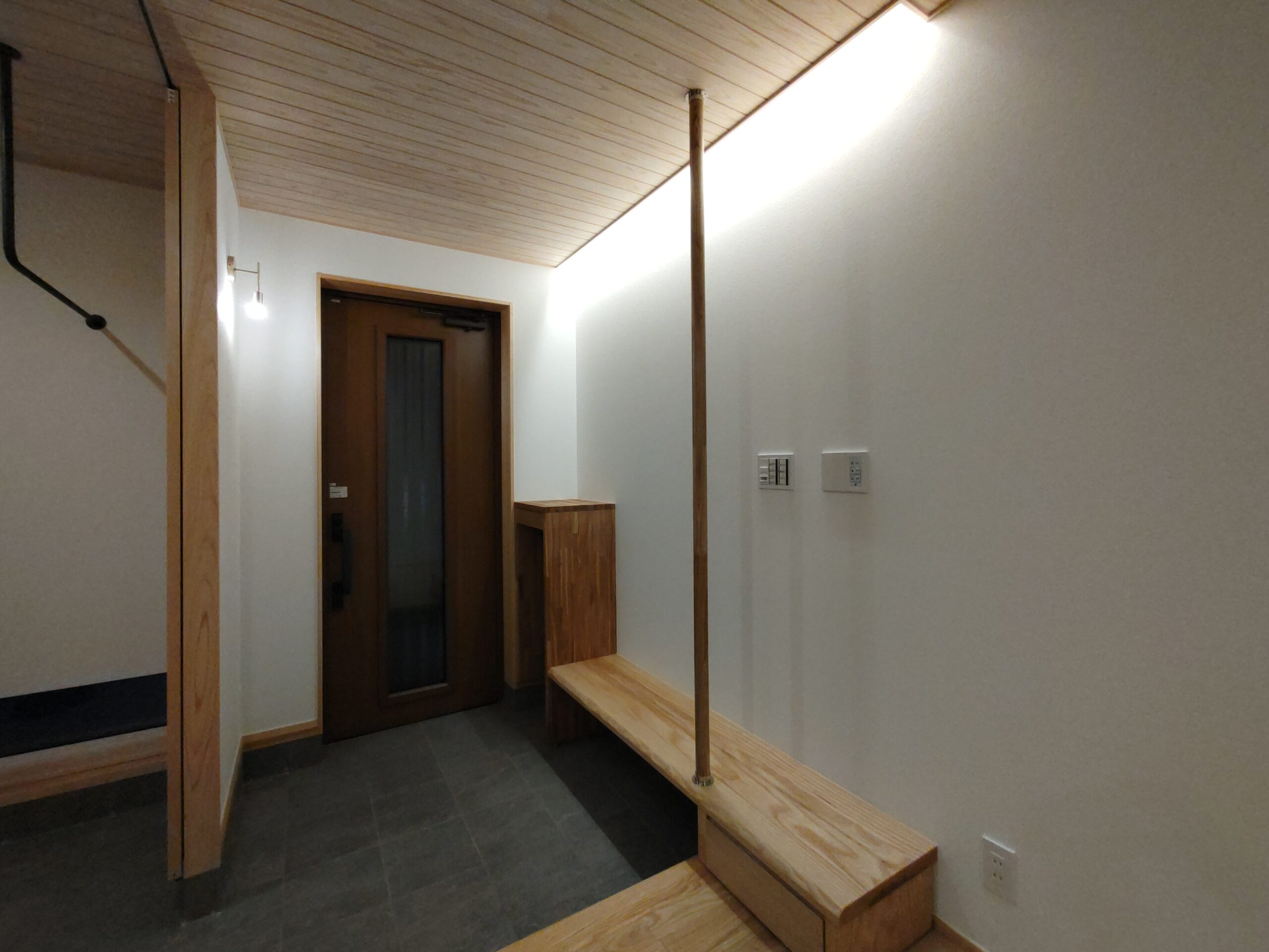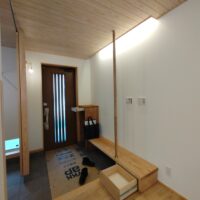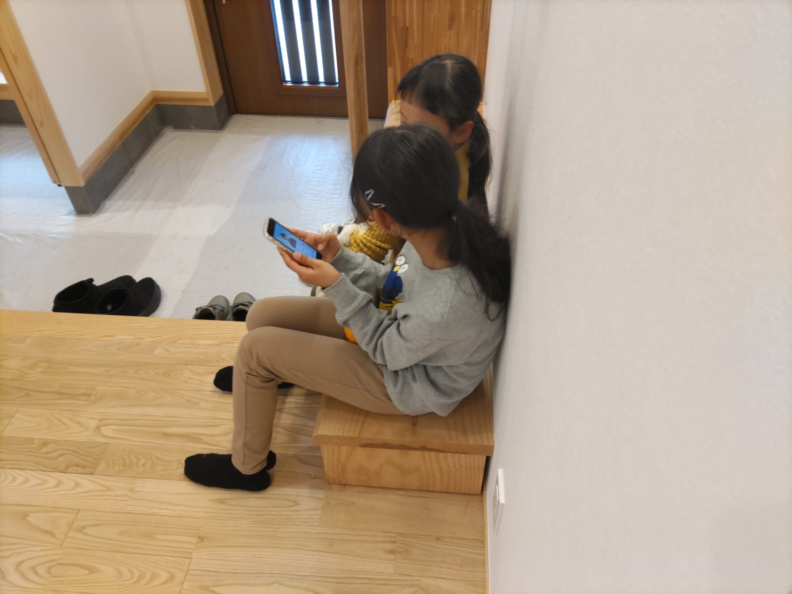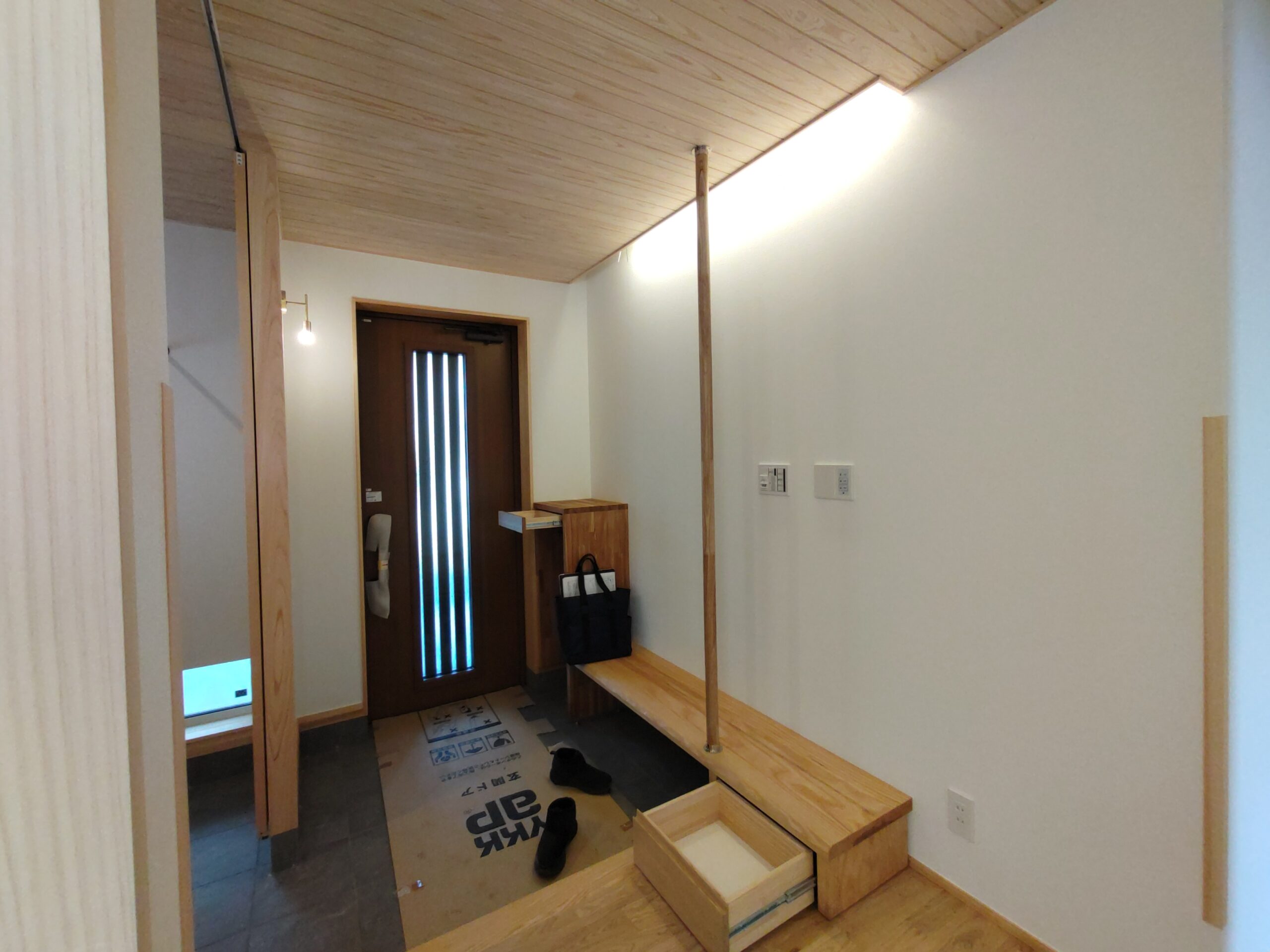 玄関に取付けられたベンチ収納、小さな姉妹が二人仲良く座るのにちょうど良い寸法でした。f様にももう少し幼い兄弟がおられます。写真のように仲良く座っている画が想像できます。