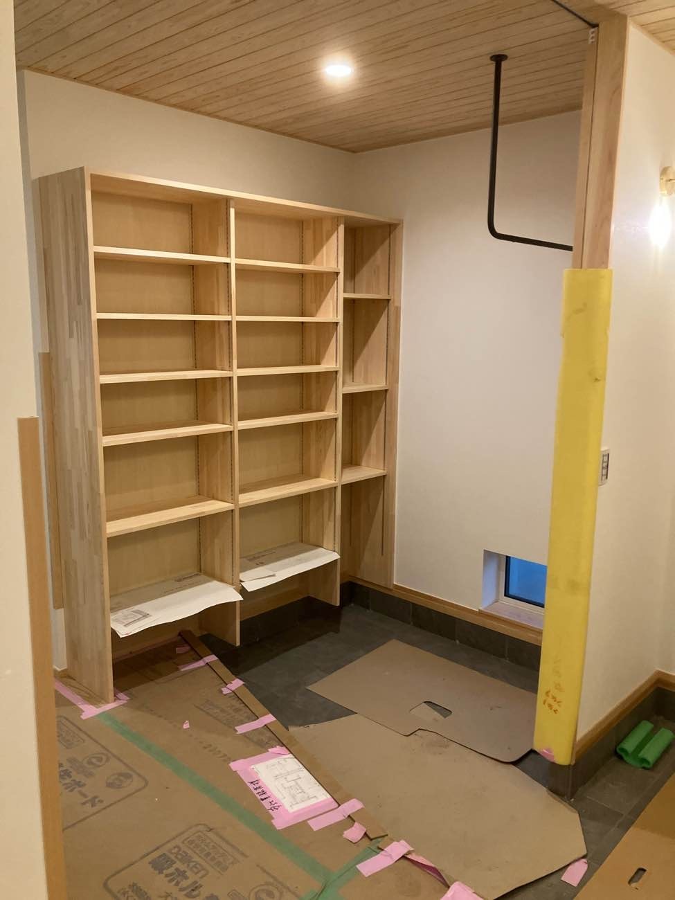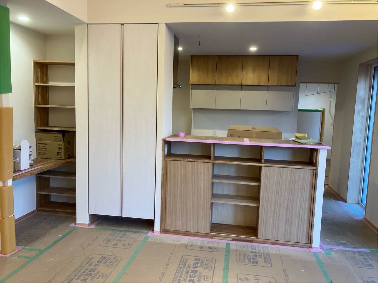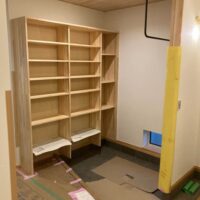 造作工事完了を目前に控え、各箇所の造作棚が着々とできあがってきています。棟梁もうひと頑張りです。その後はクロス工事、フロアタイル工事に入っていきます。