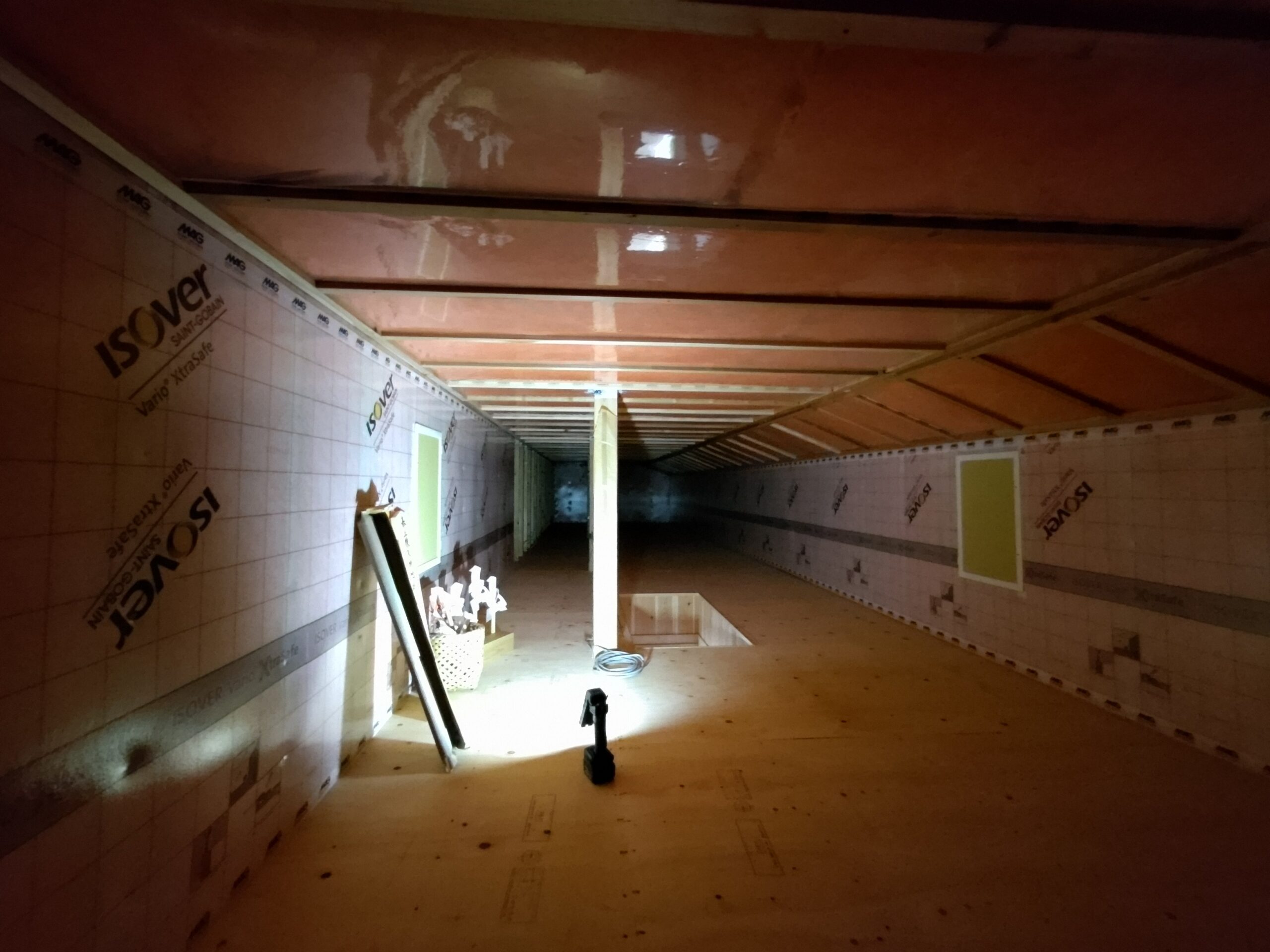 徐々に塞がれていく小屋裏空間。平屋建てである程度の勾配を持った屋根をかけているので、収納空間として利用する計画です。