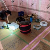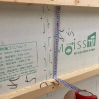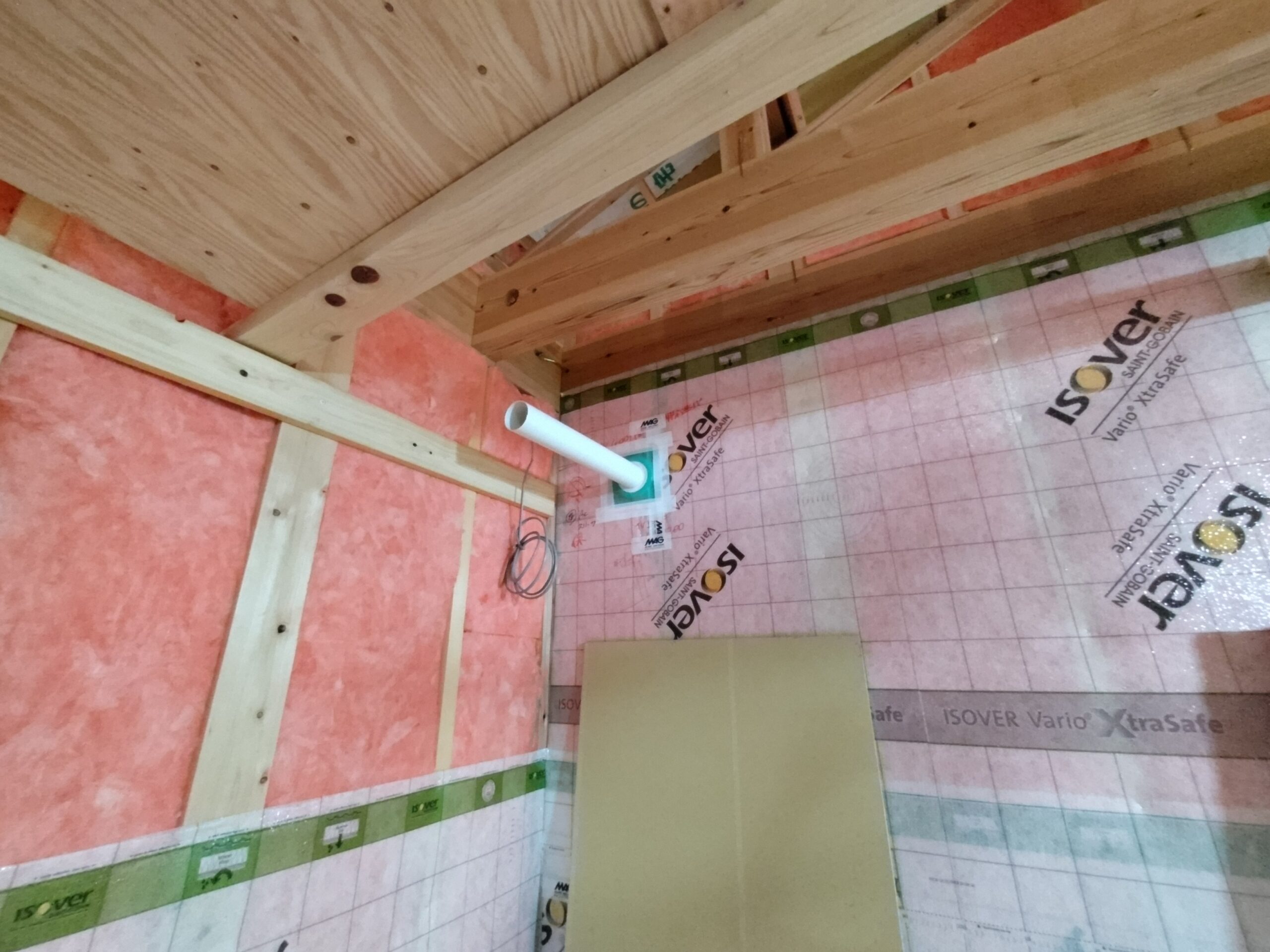 外壁の充填断熱、気密シート張りが完了しています。こうして水も漏らさぬシート張りを行う事で顕熱、潜熱共に熱損失しないようにして屋内の温度が保たれるのです。