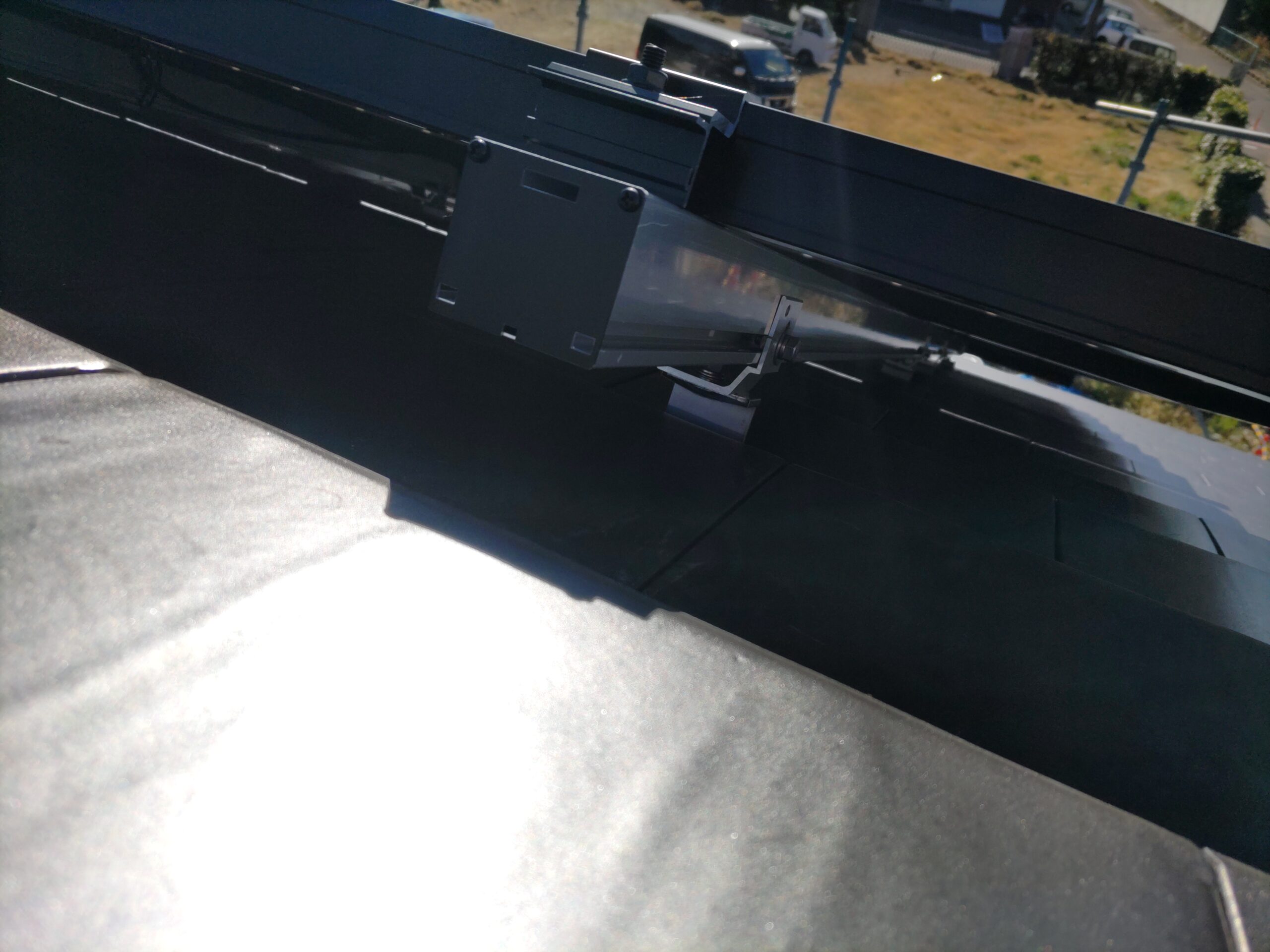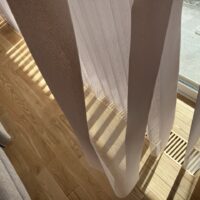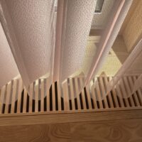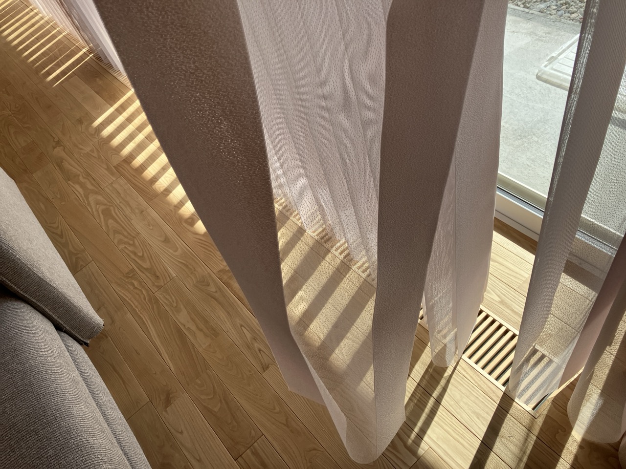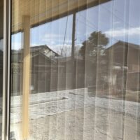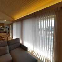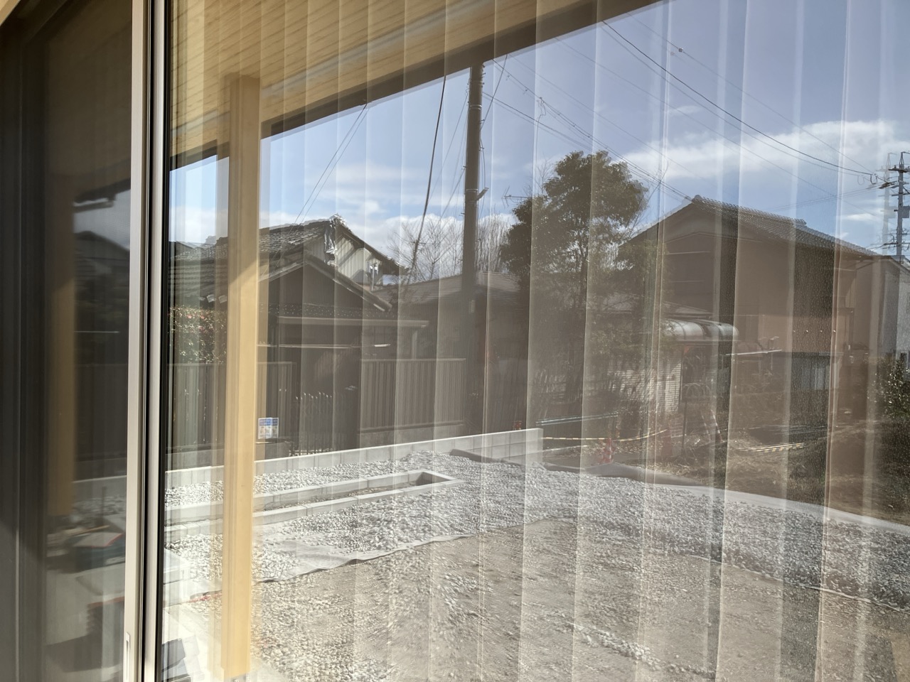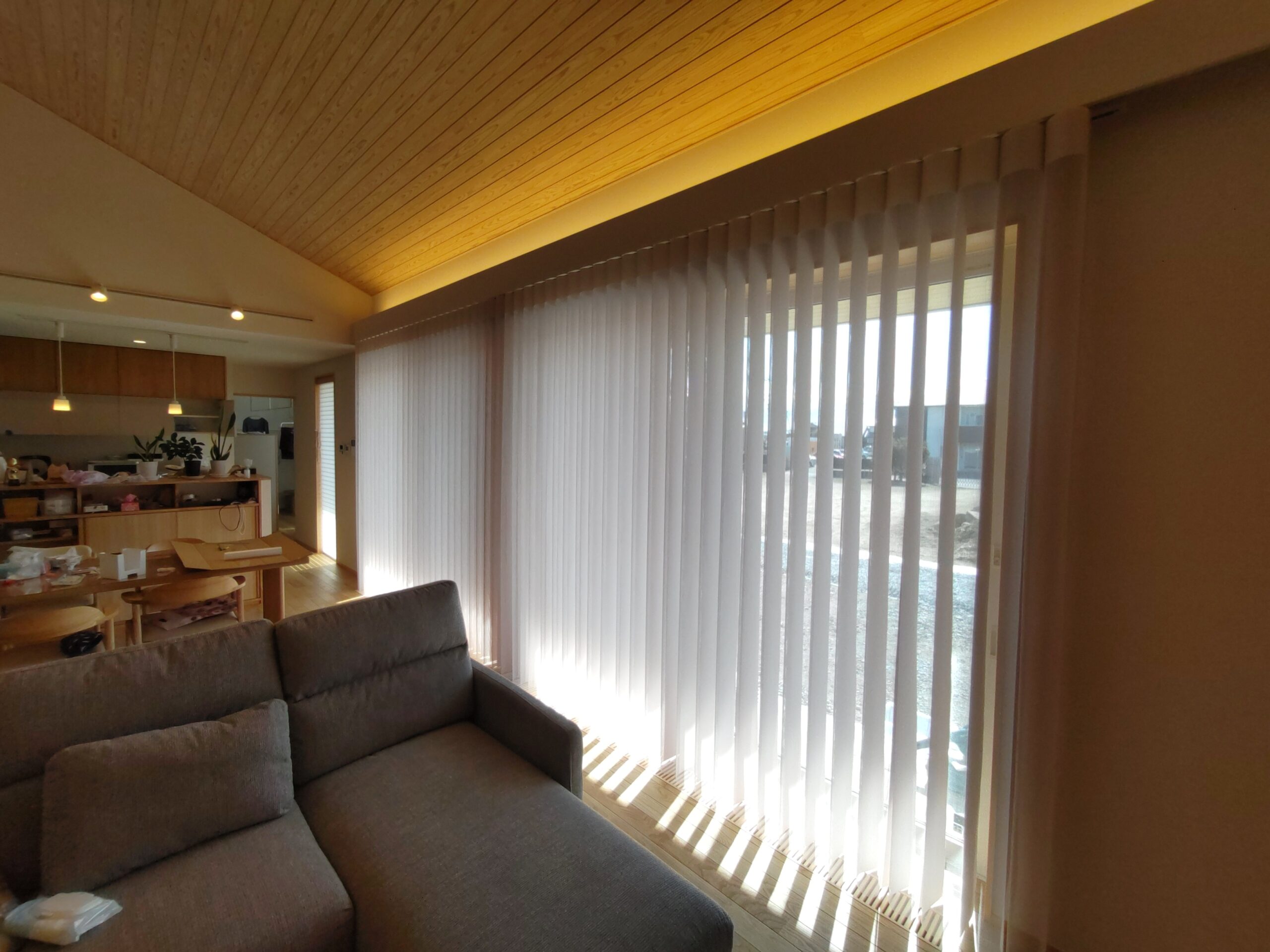 本日はカーテン業者さんも室内で作業中。外気温に比べて格段に暖かい室内で汗を拭き拭き取付を行います。リビングの大開口に取付けられたのは『スマートドレープシェード』というカーテン(というかシェード)。一見バーチカルブラインドにも見えるこのシェードは単体のシェードがドレープとレース生地が繋がったような形をしており、それぞれ独立しています。操作棒一本で角度を調節でき、向きを変えれば目隠しに、あるいはレース地にできます。汚れた場合もその部分だけ洗えば良いとの事。結構便利なシェードです。