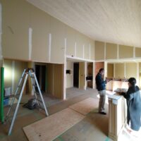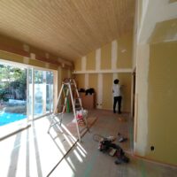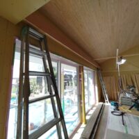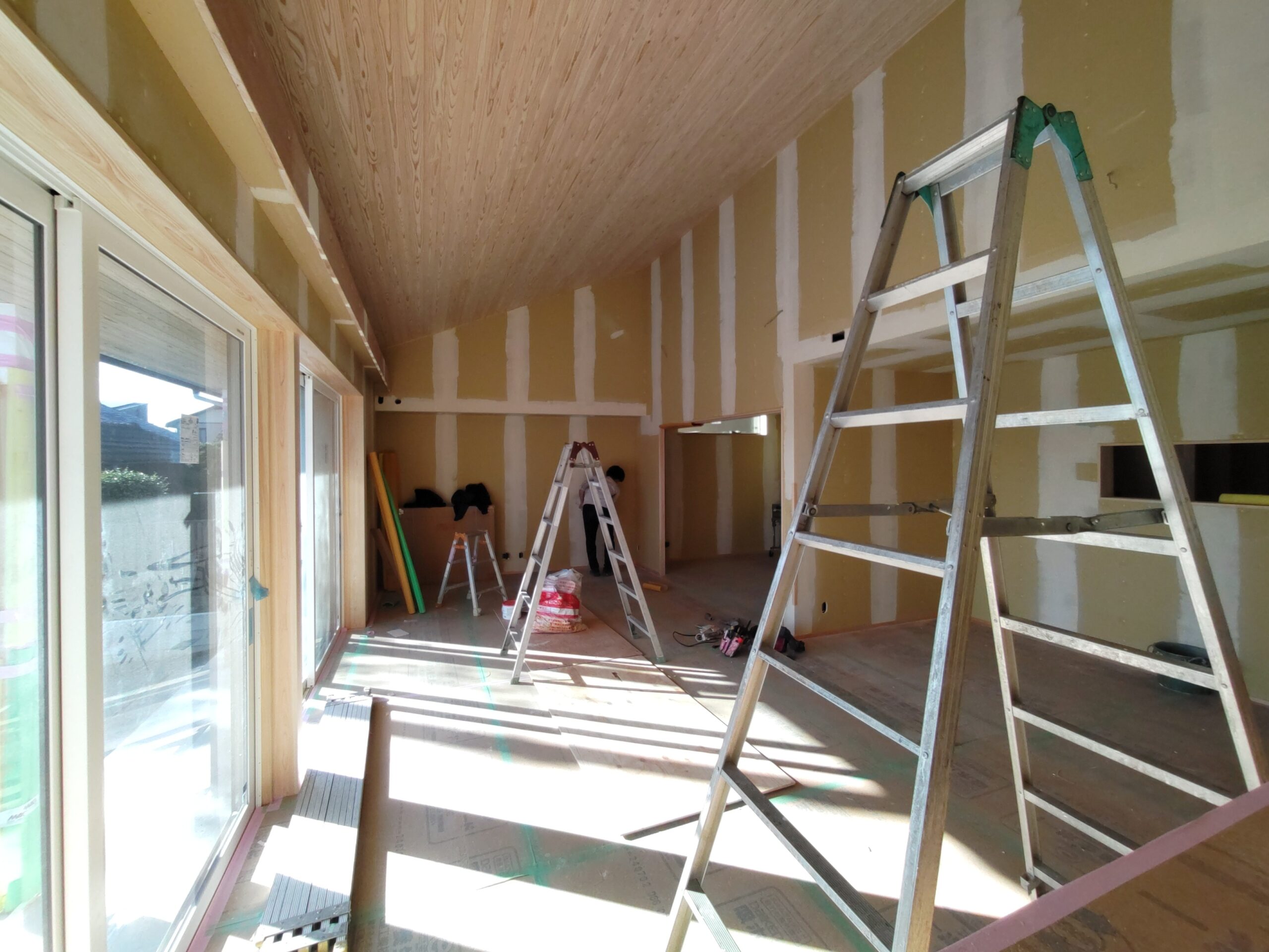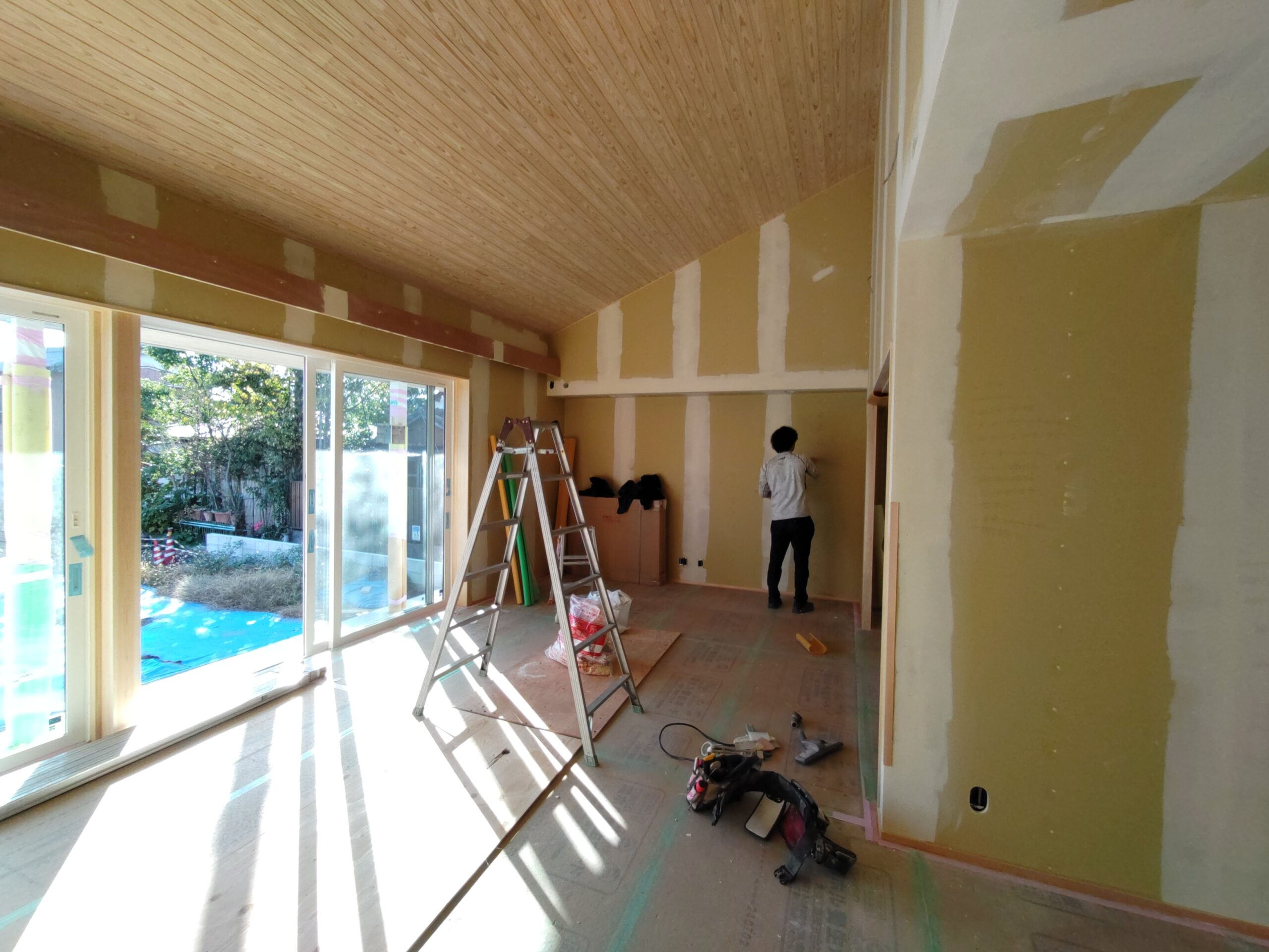 パテ処理はどんどん進んでいきます。背の高い勾配天井があるため、一番高い部分で4m近くあり、作業をするにも一苦労です。