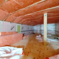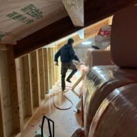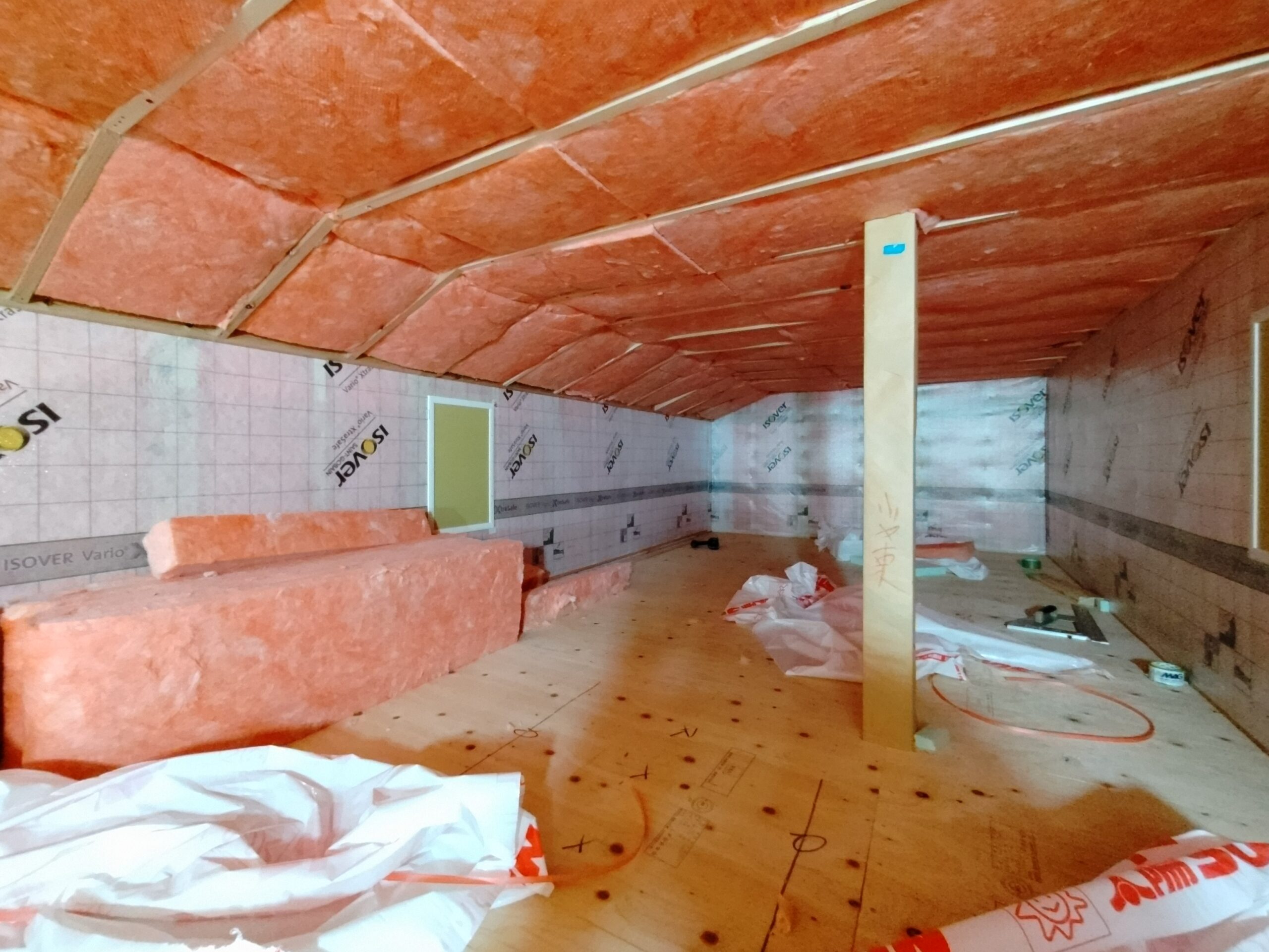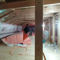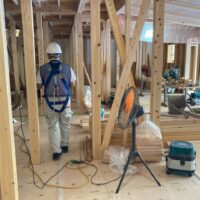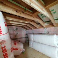 勾配天井になる部分には屋根断熱として高性能グラスウールのブローイング工事が終わりました。これで断熱工事が終わり、屋内では少しはマシな状況で作業できると思いきや、棟梁は今日も汗だくになって仕事をしています。