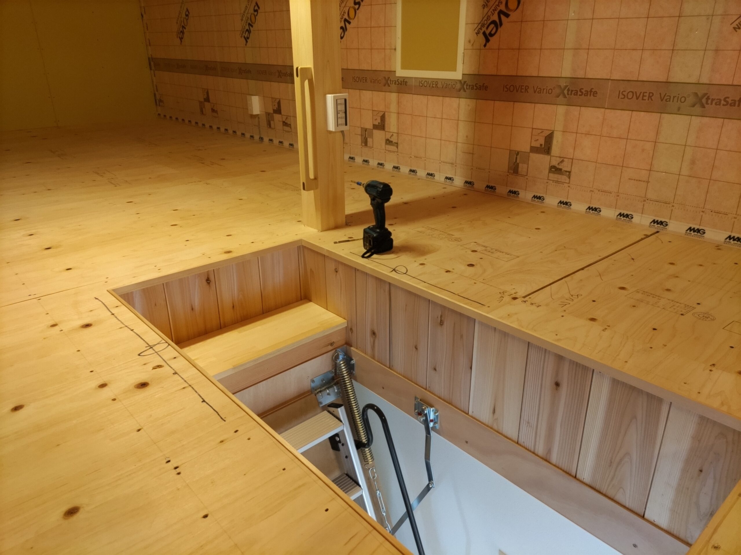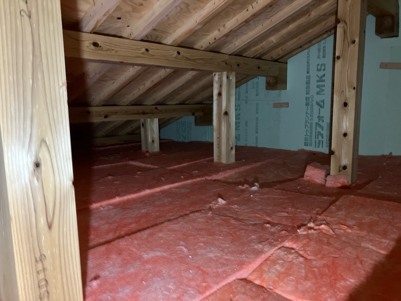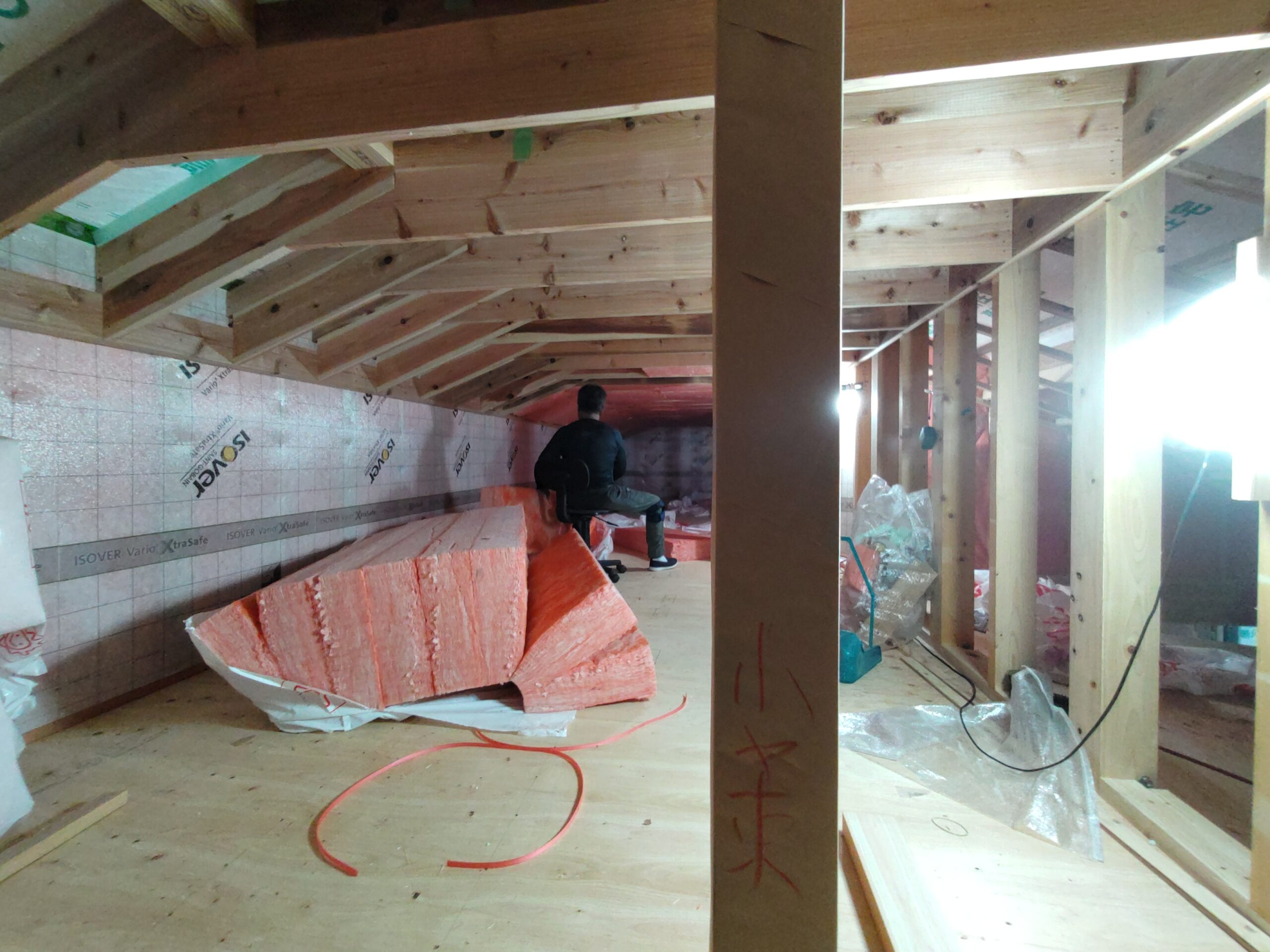 棟梁は内部の仕事を行います。小屋裏収納庫の天井グラスウールを仕込んでいます。建築基準法に従い、小屋裏収納庫の天井高は1.4m以下におさえていますが、ここを作業するとなると中腰となり非常に作業しづらいところ、棟梁は事務用の椅子を持ち込んで腰掛ながらの作業をしています。ちょうど天井の手が届く高さとなり、キャスターで横移動もラクチン。なかなかナイスなアイデアです。