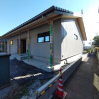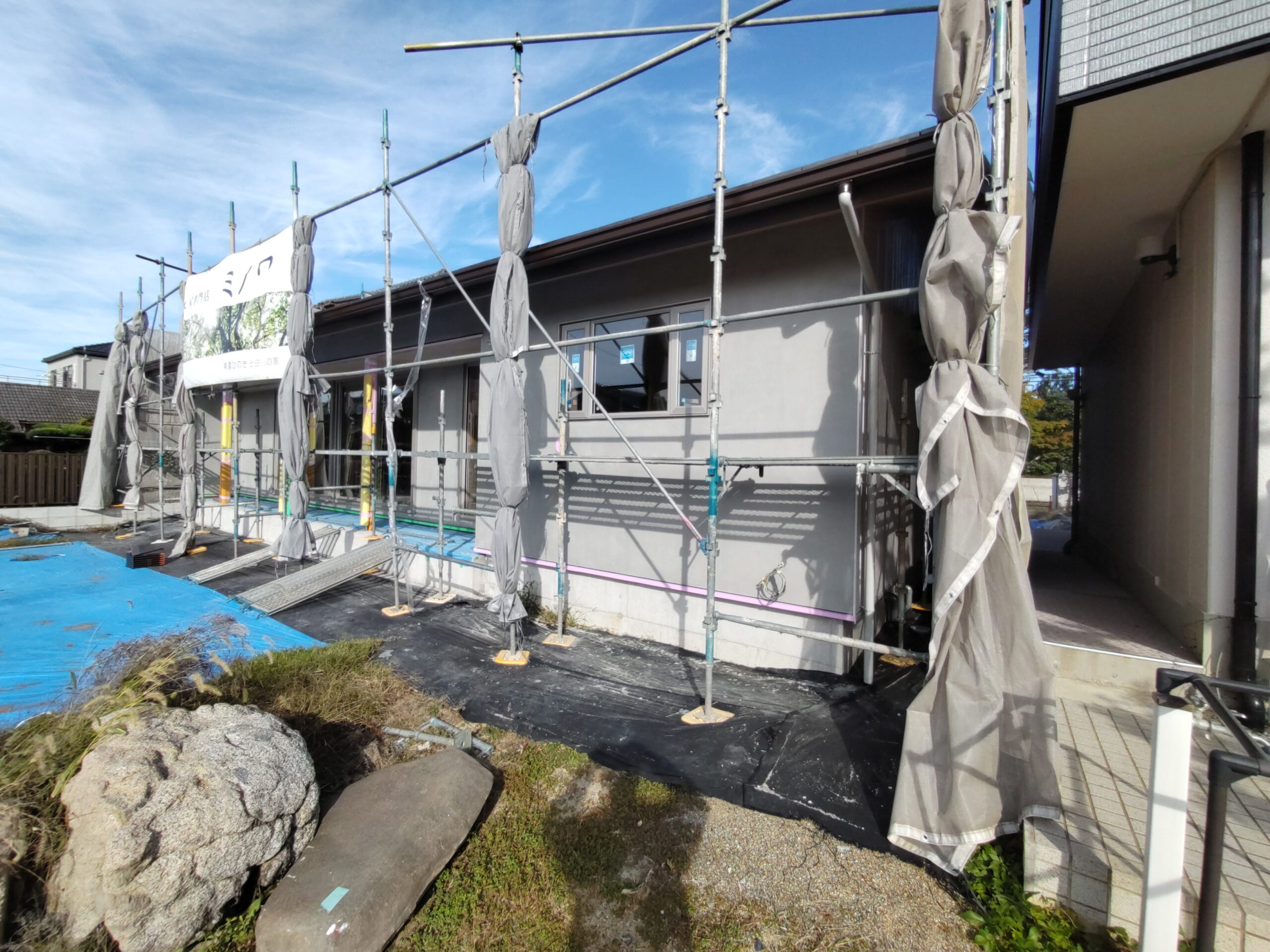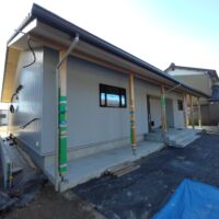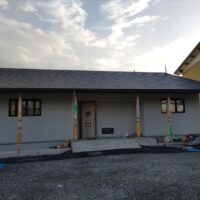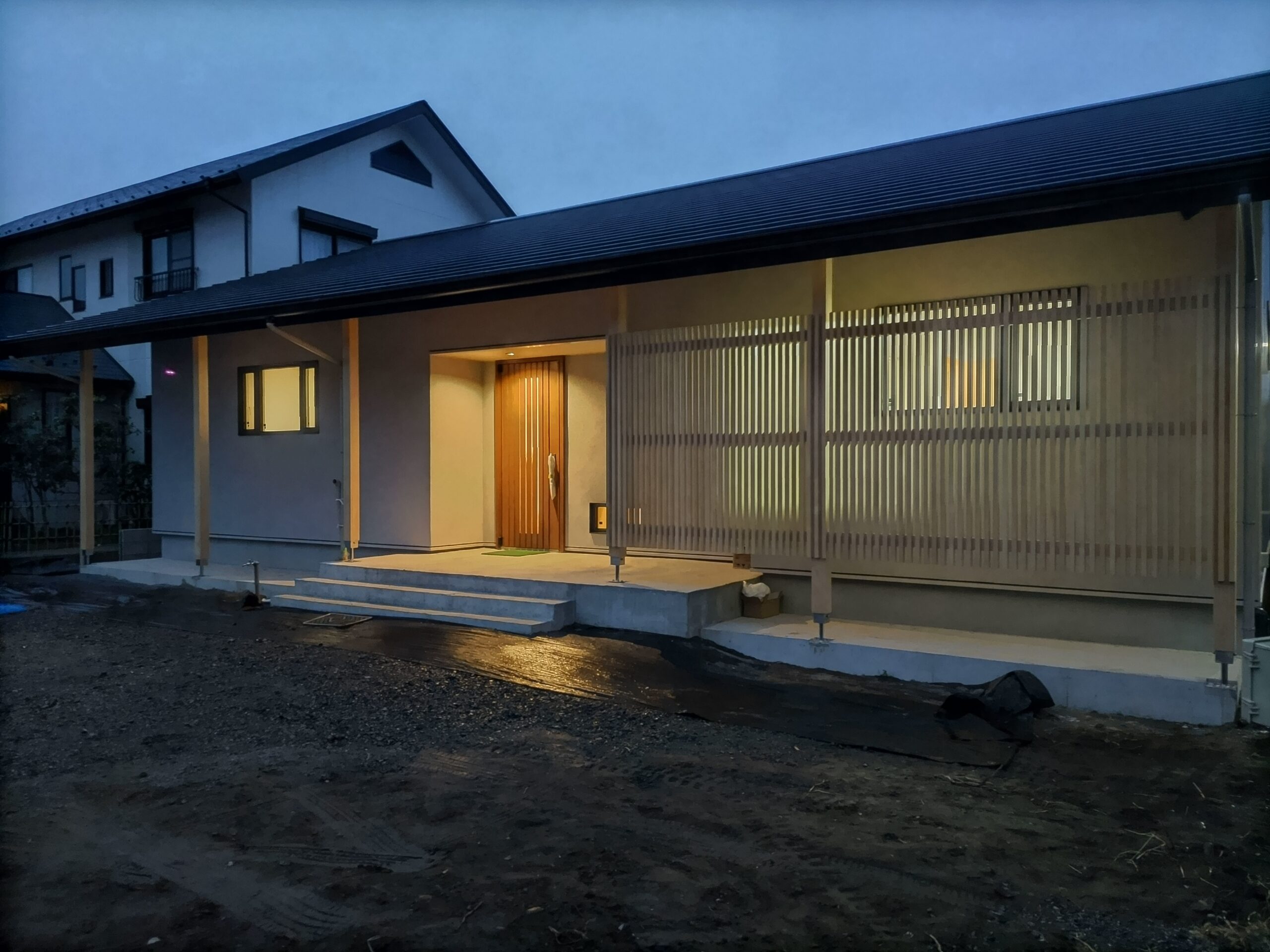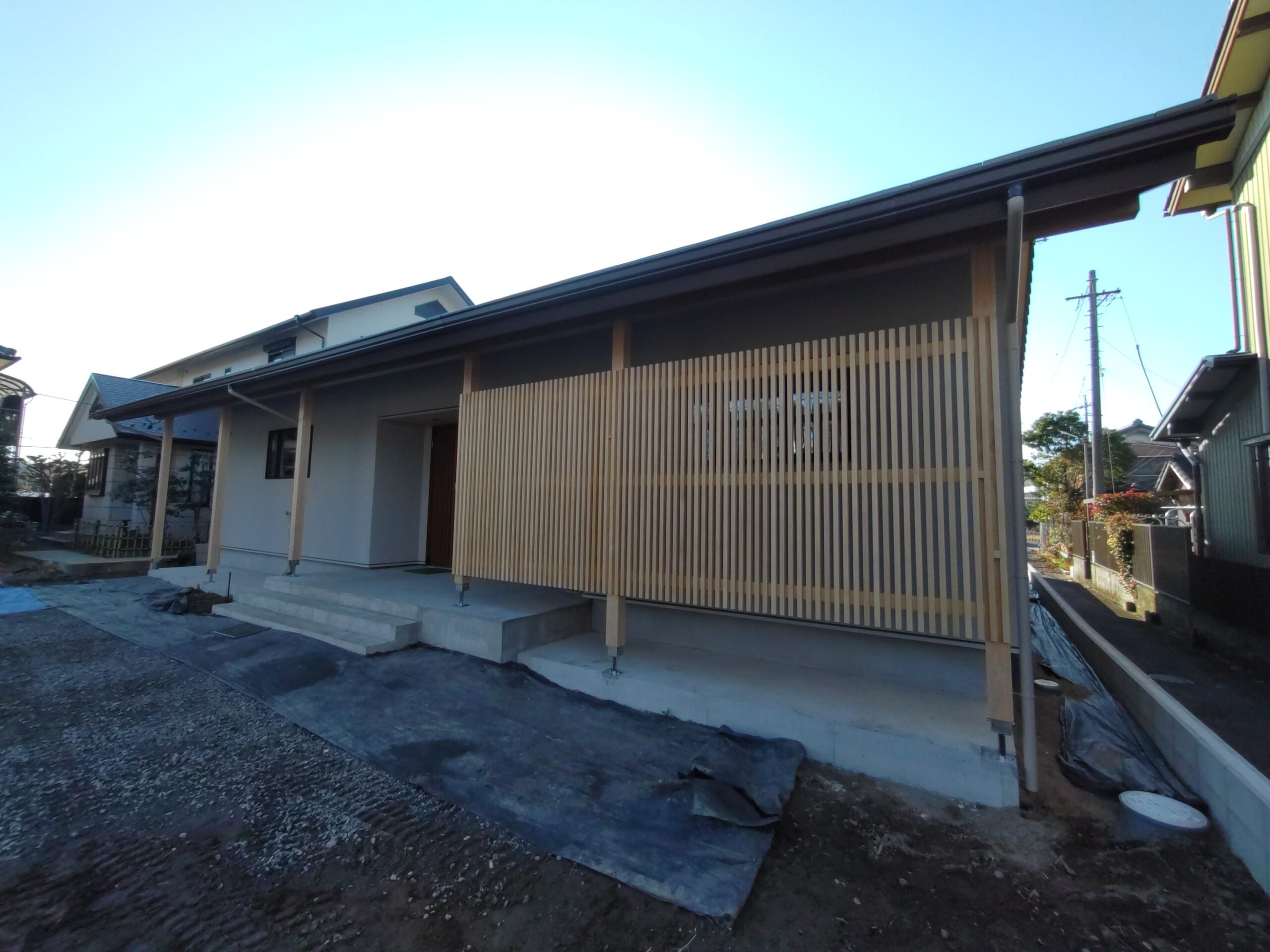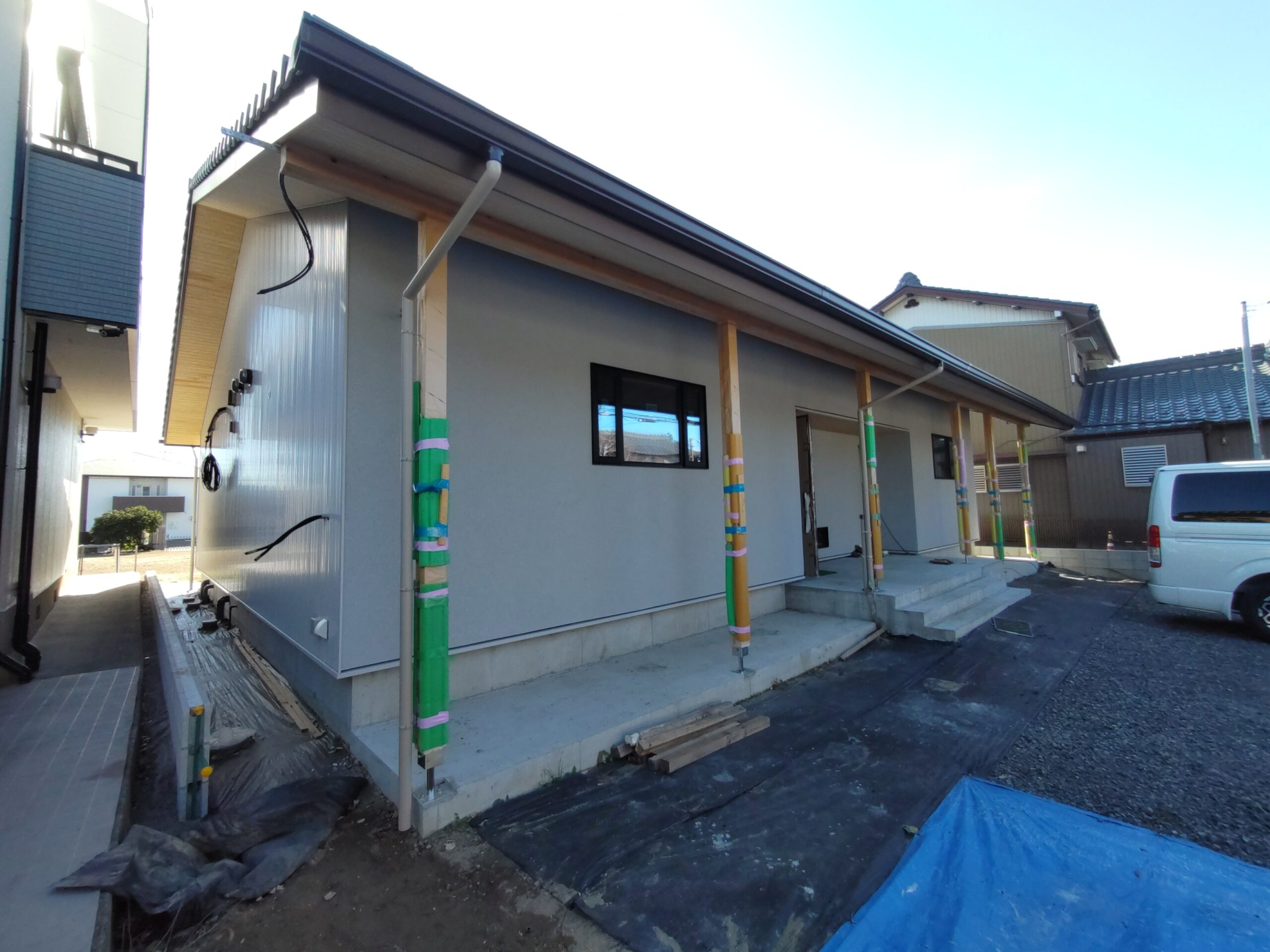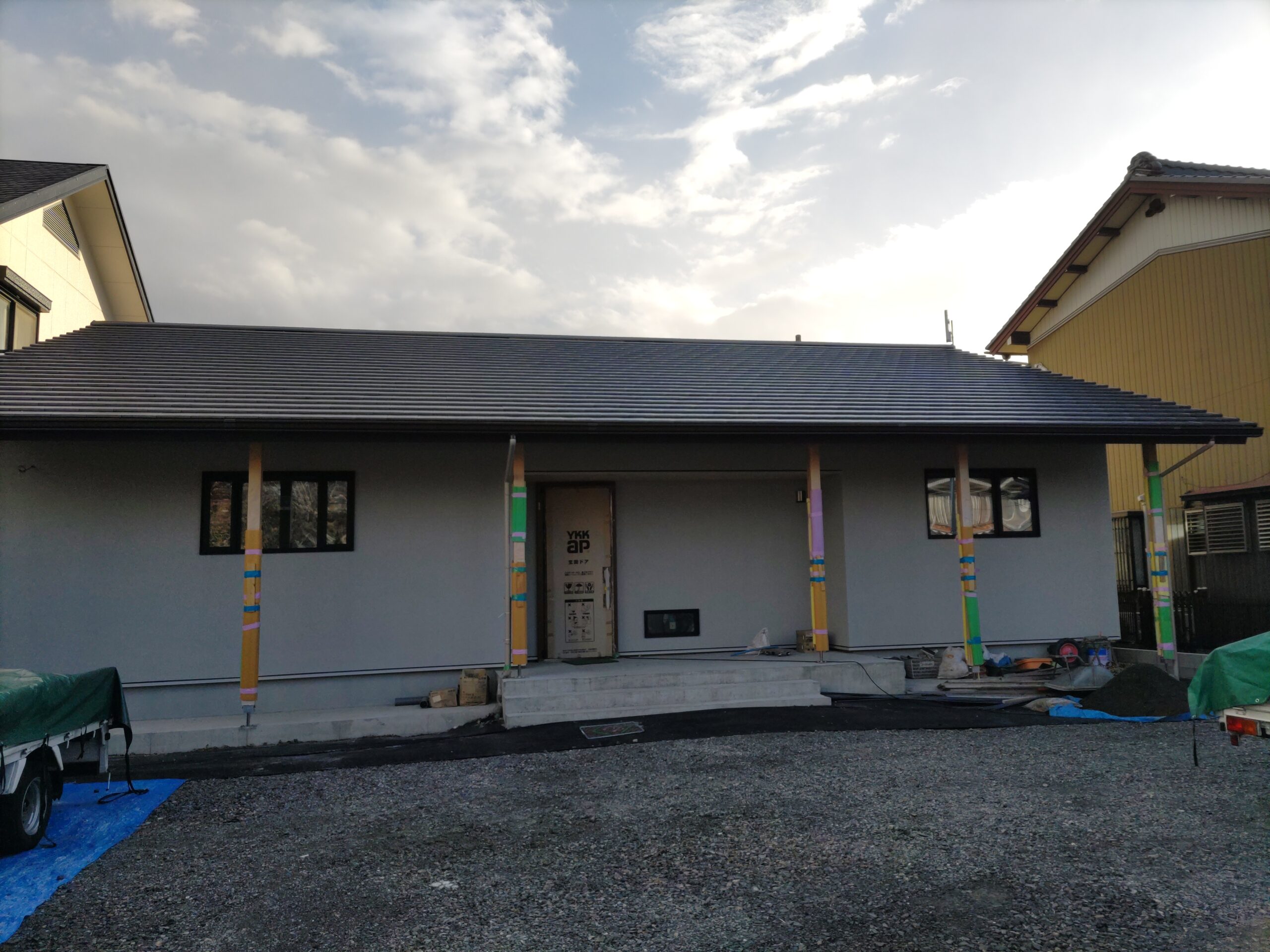 外壁ジョリパッドの仕上塗が完了しています。エンシェントブリック仕上。シックなカラーも相まって、平屋建ての落ち着いた雰囲気を醸し出しています。