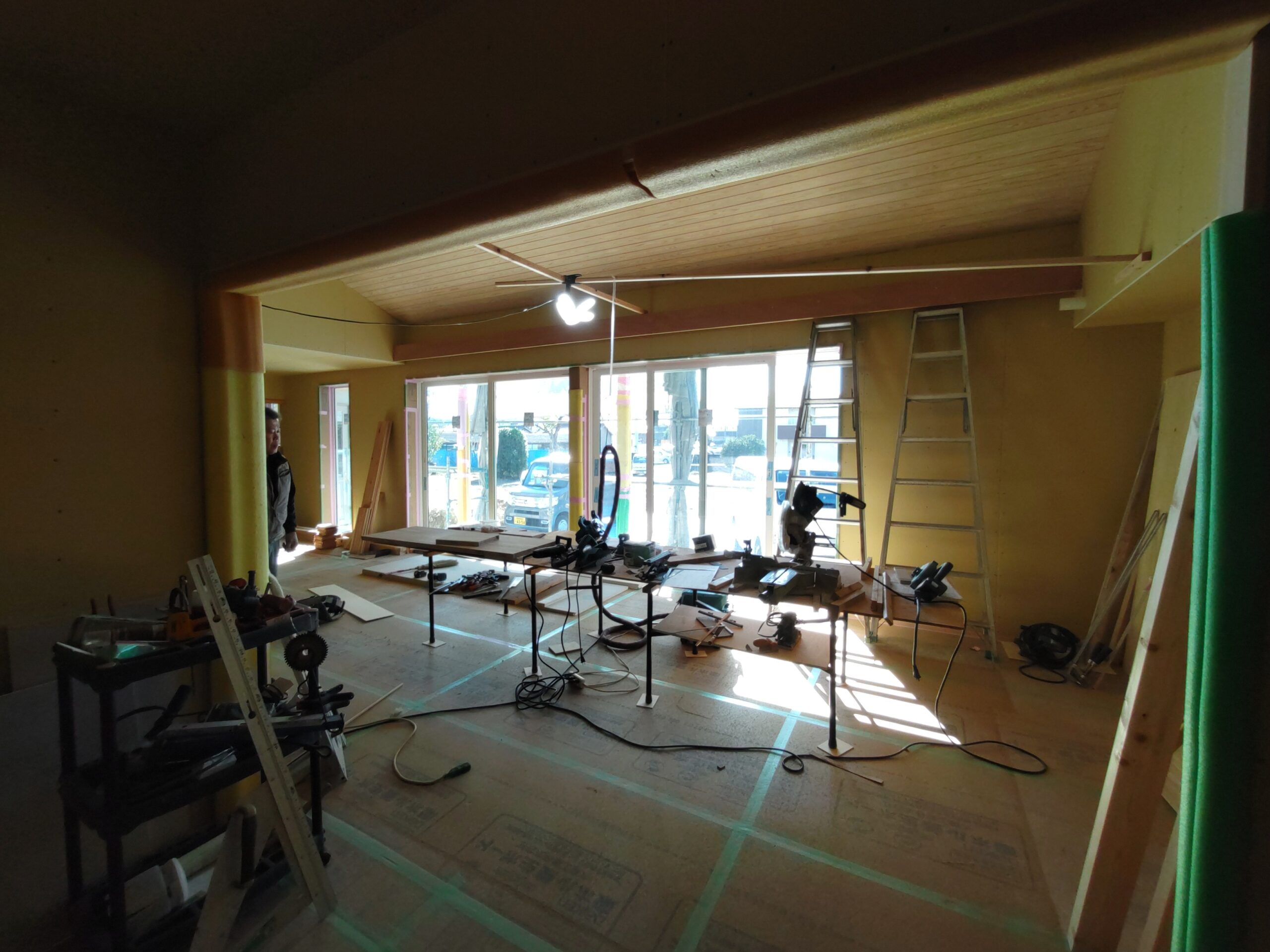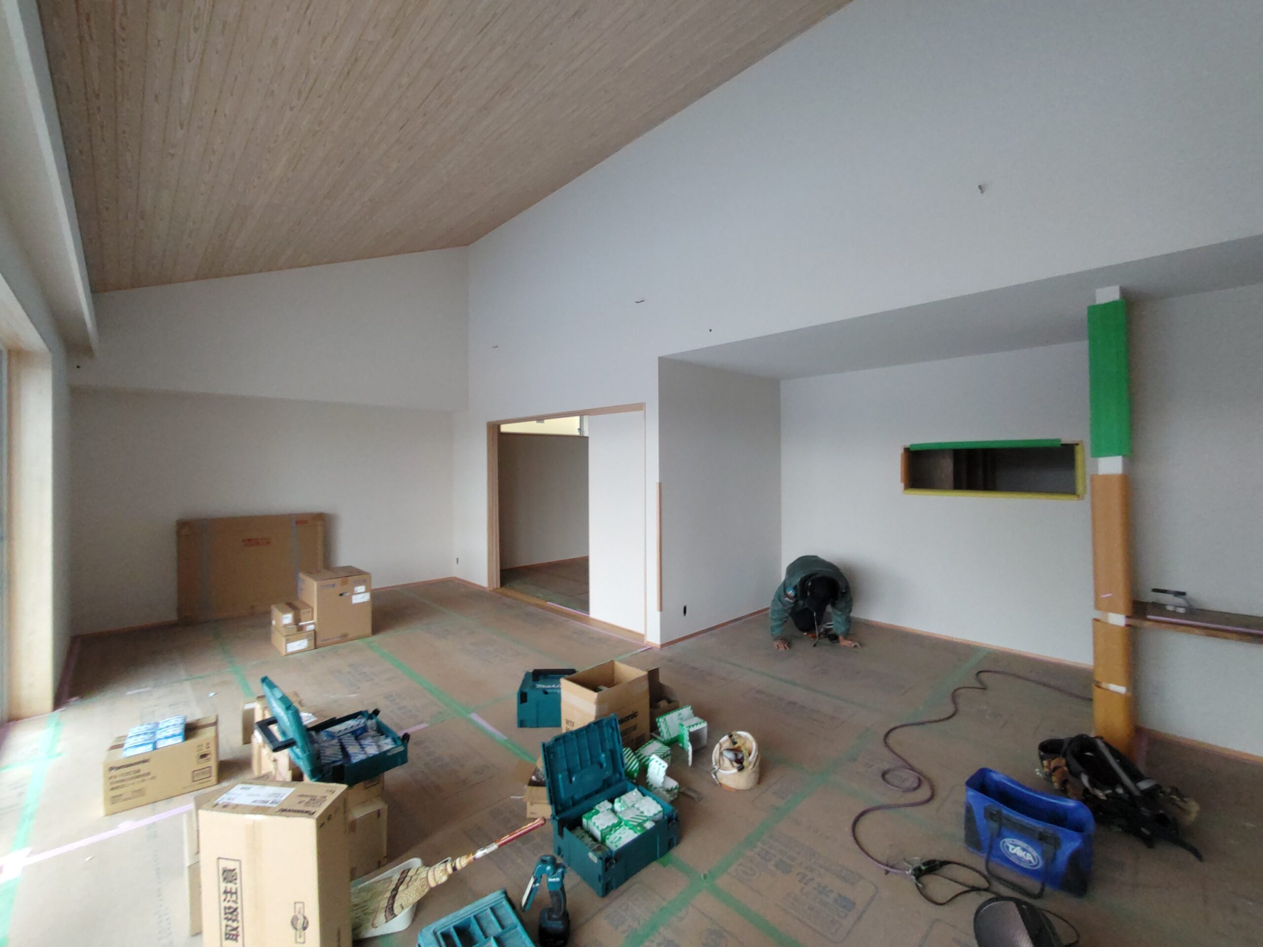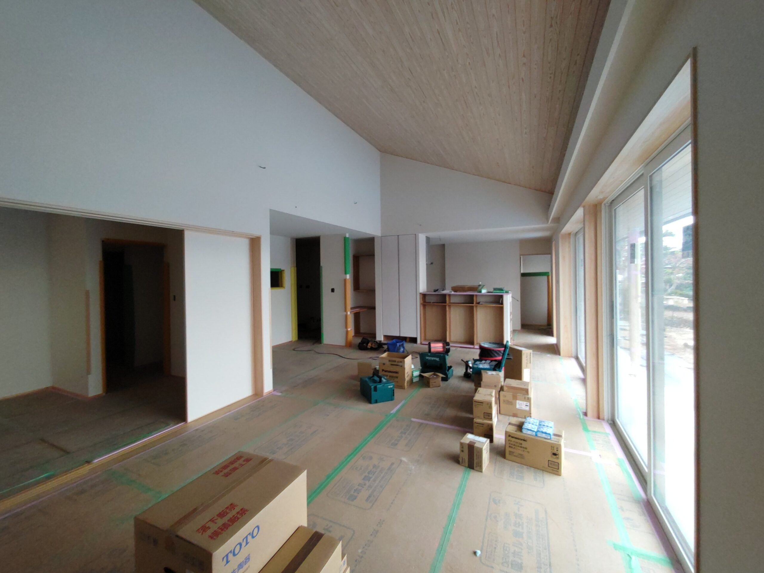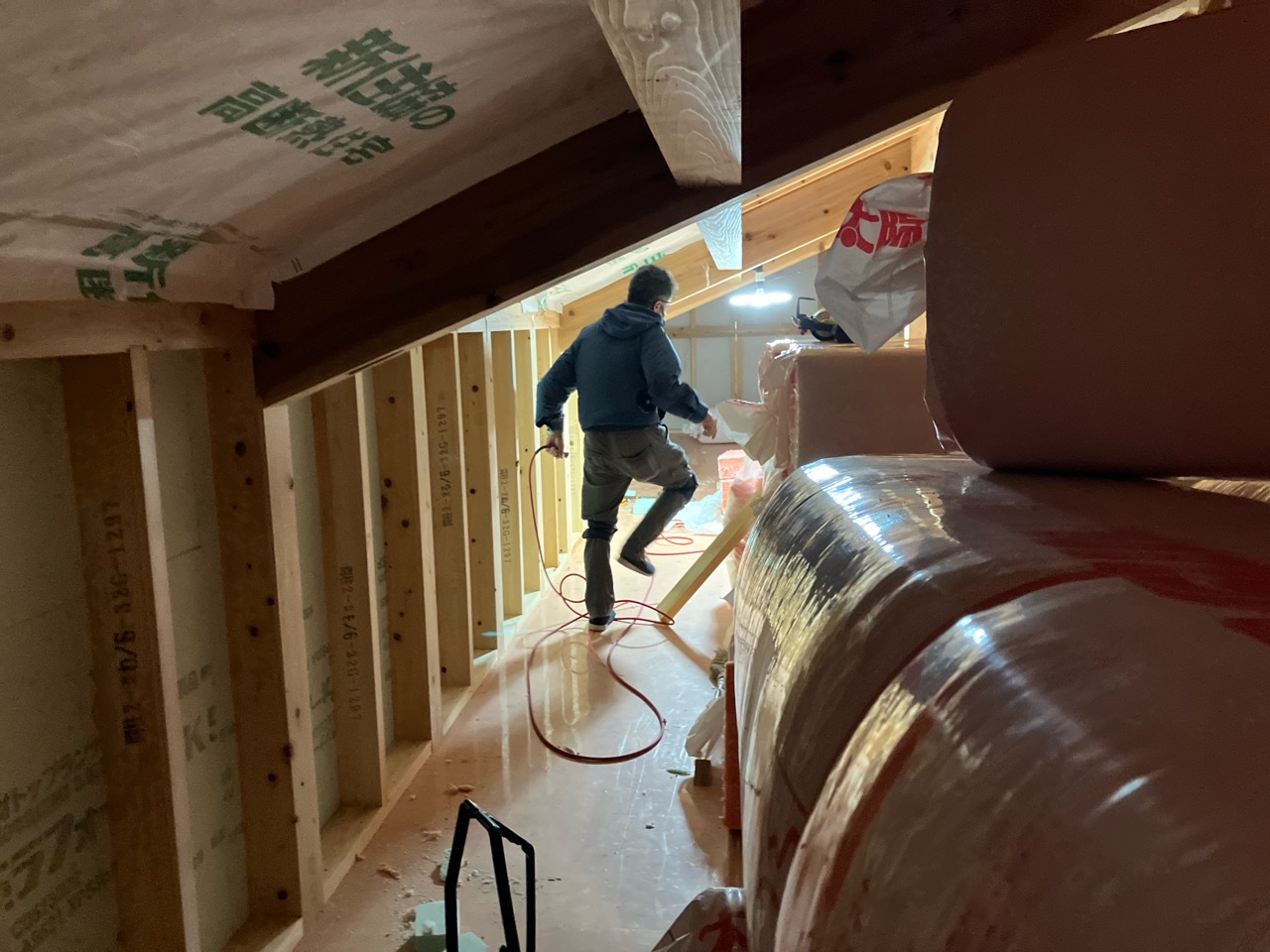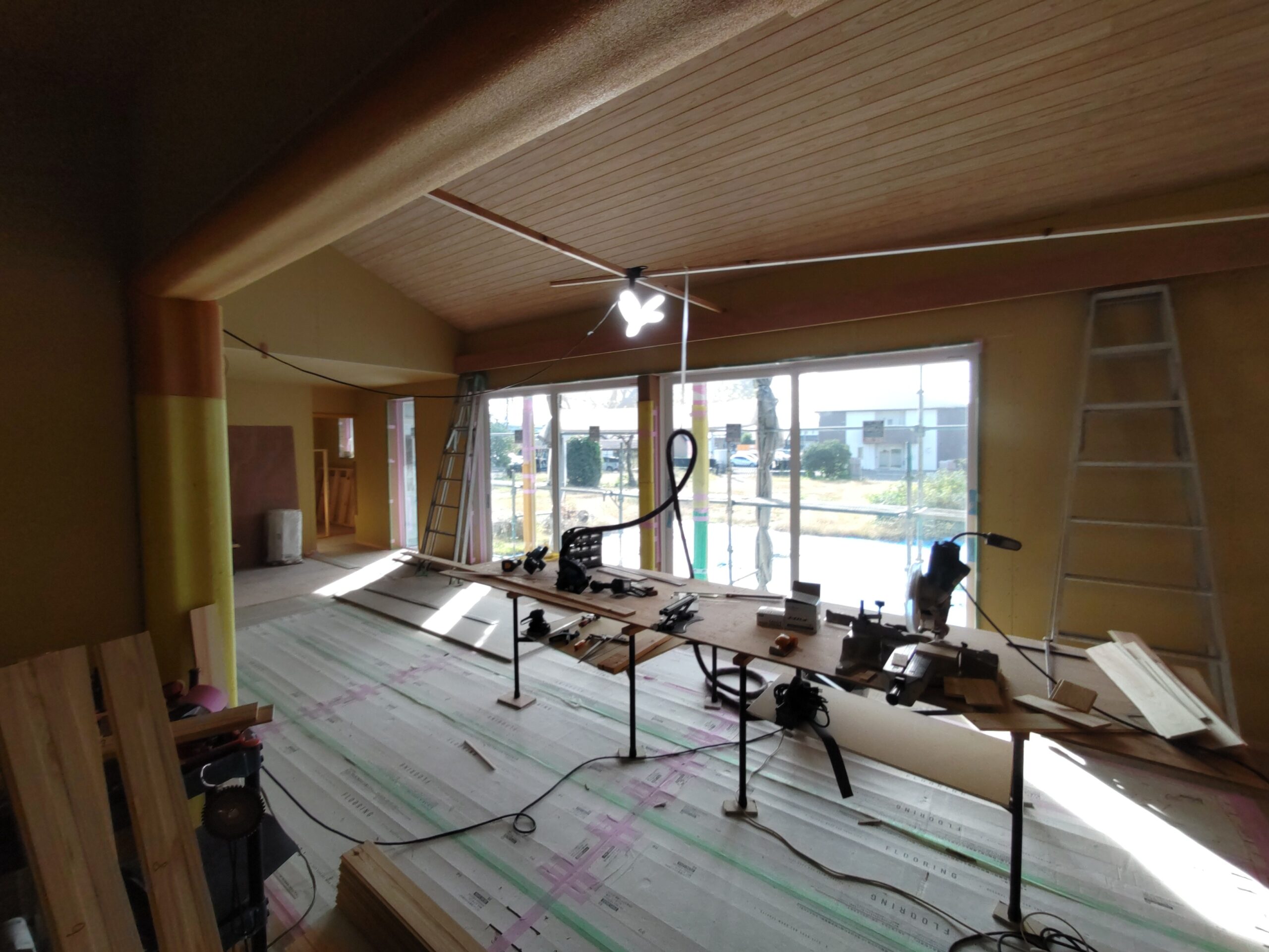 写真では快晴に見えますが、この日は夕方頃に数分だけ雪が降るような寒い日でした。そんな天候でも屋内で作業していると、上着を着ていては暑く、一枚脱いで作業をするという断熱工事の威力を感じられる空間になっています。