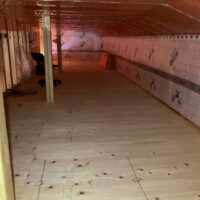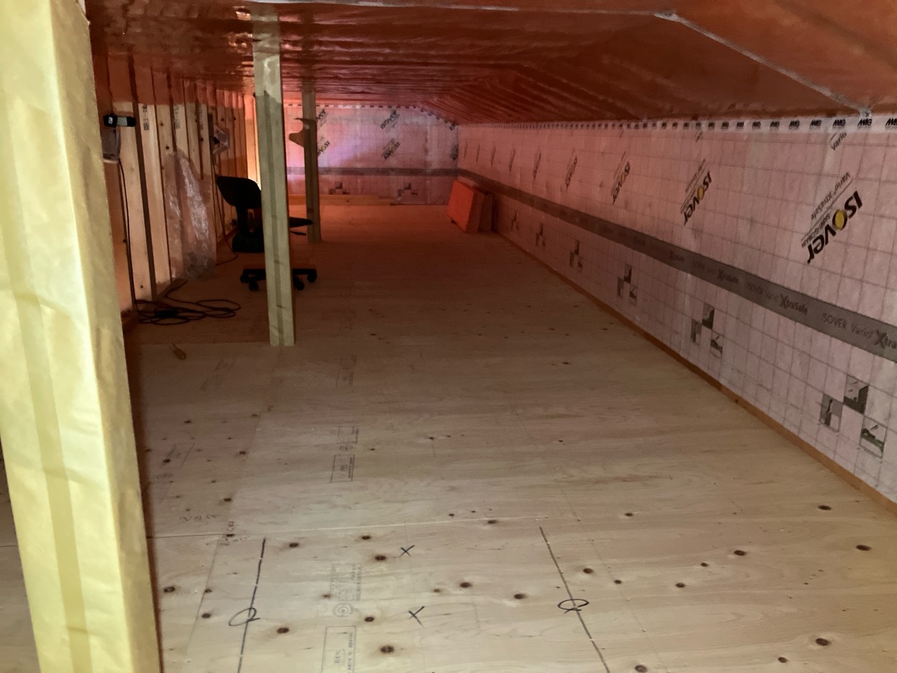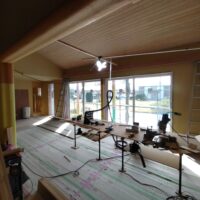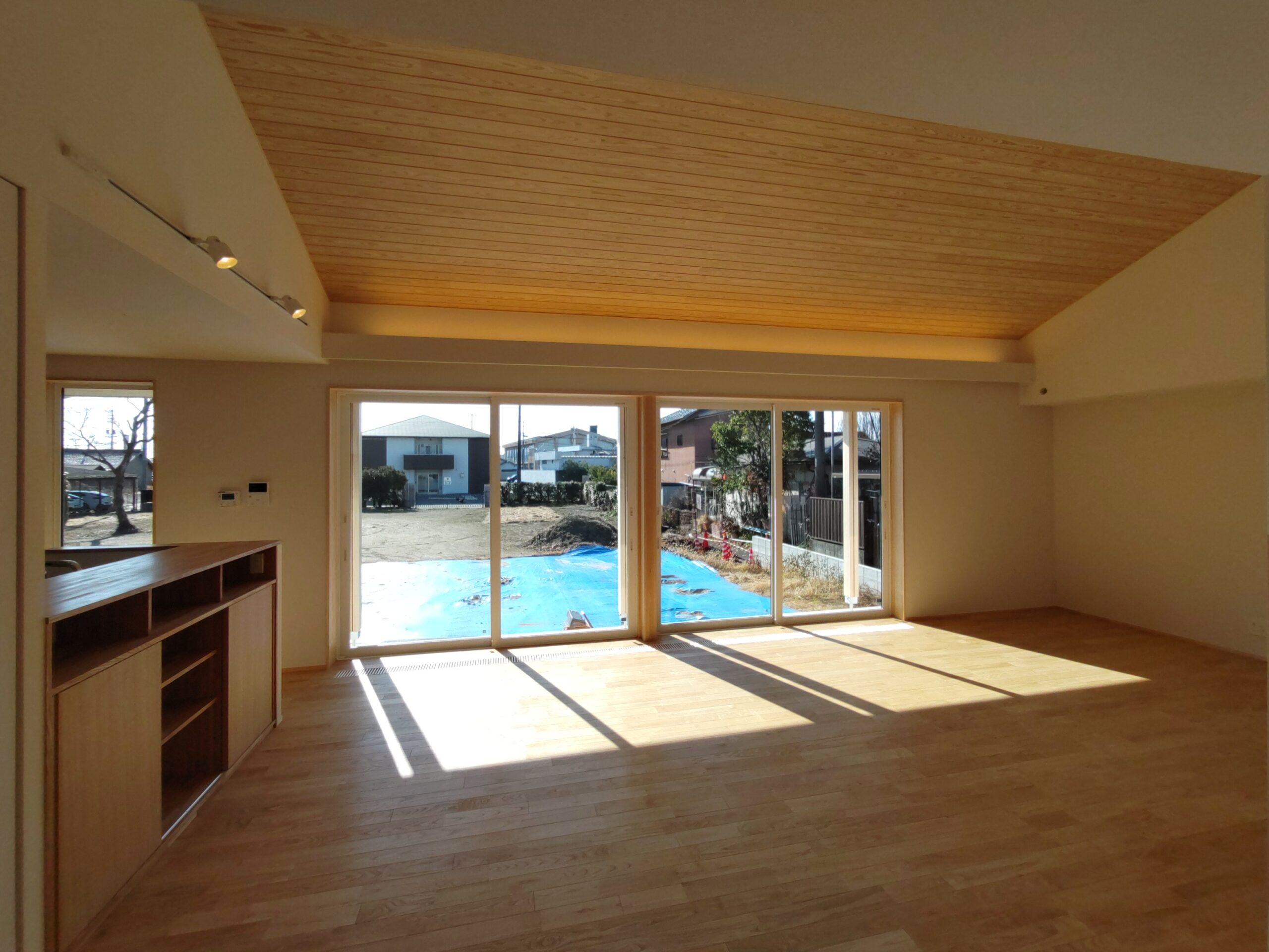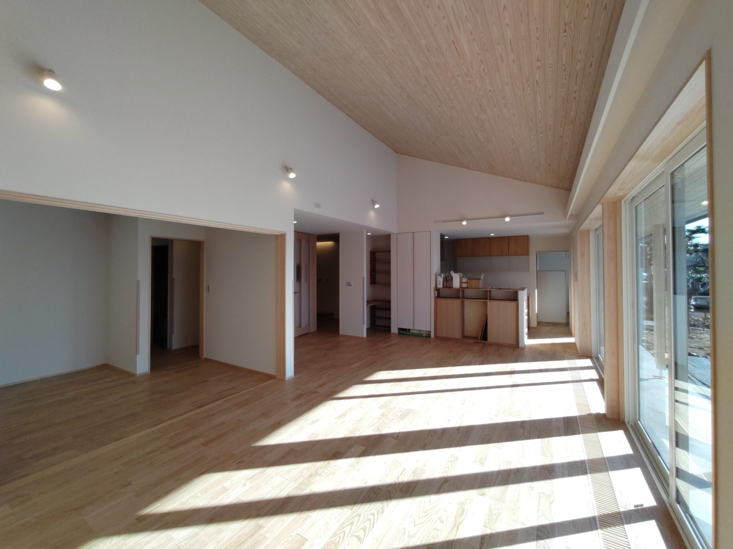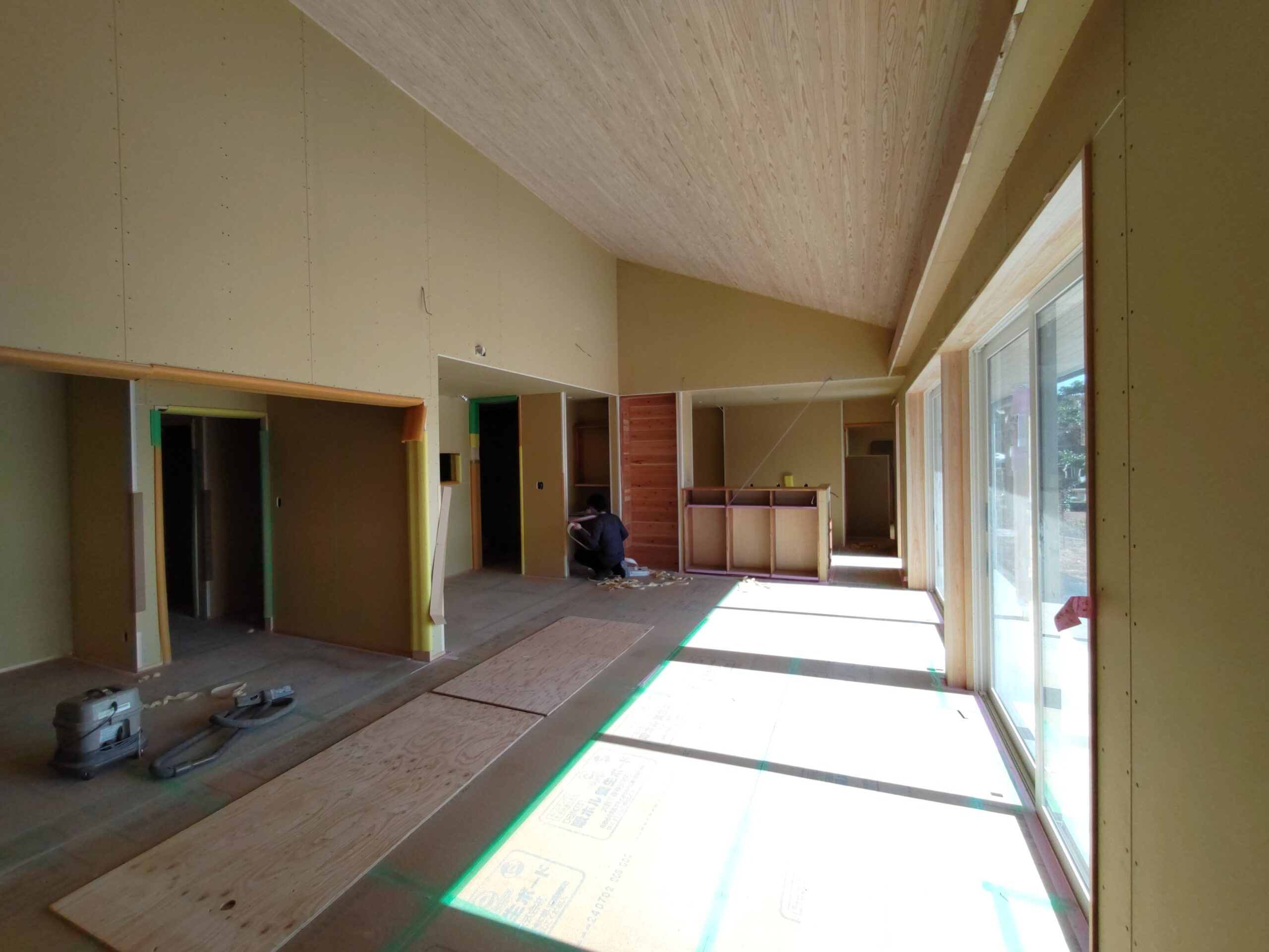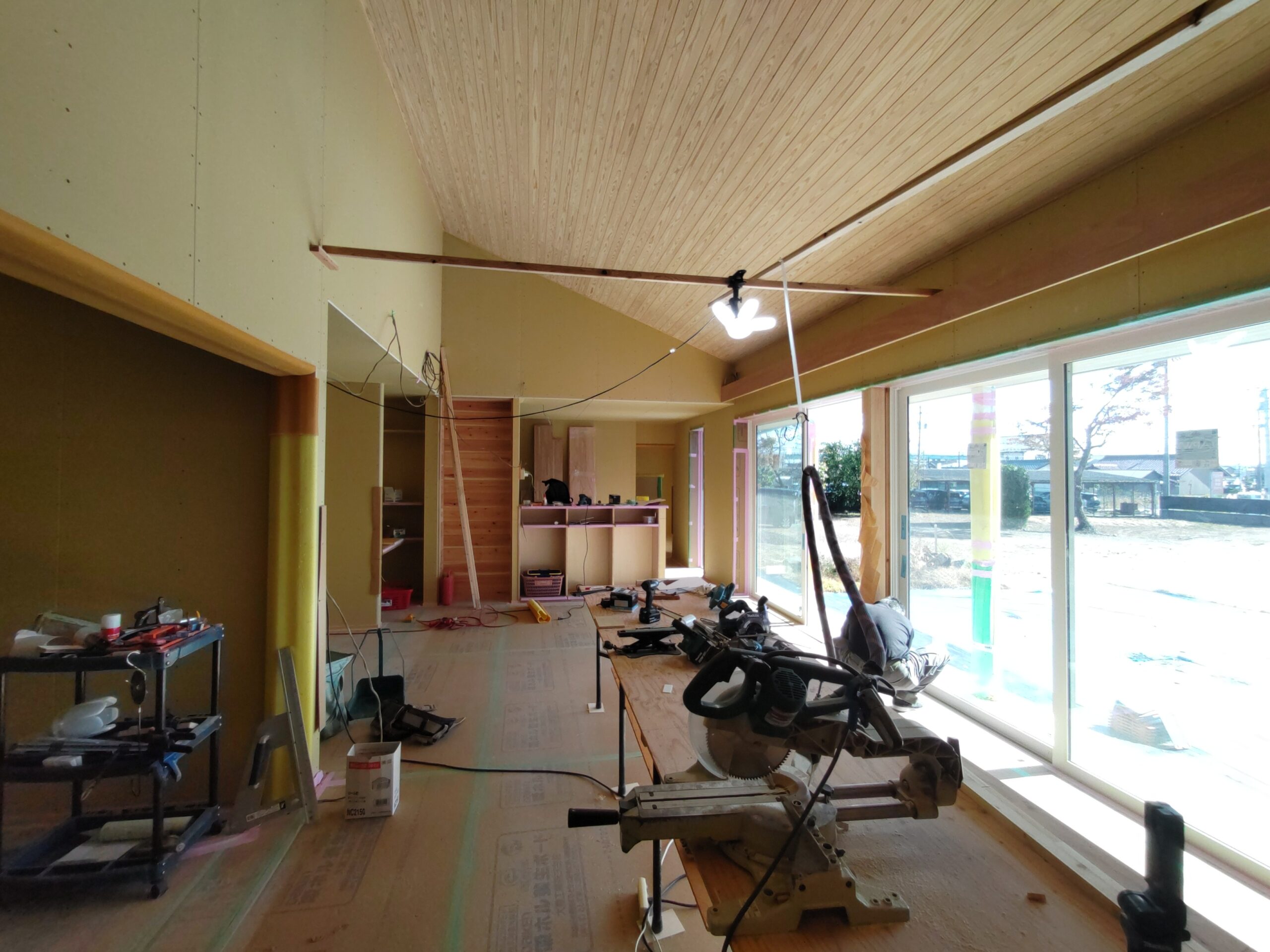 写真では快晴に見えますが、この日は夕方頃に数分だけ雪が降るような寒い日でした。そんな天候でも屋内で作業していると、上着を着ていては暑く、一枚脱いで作業をするという断熱工事の威力を感じられる空間になっています。