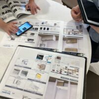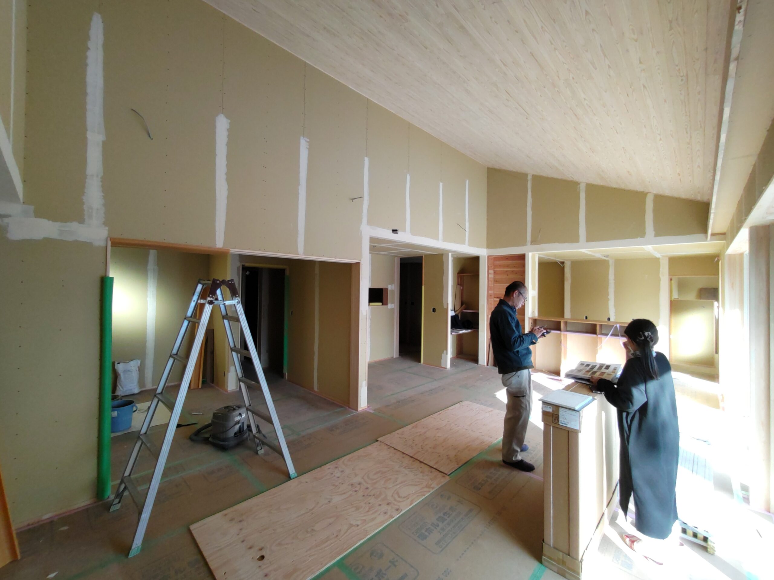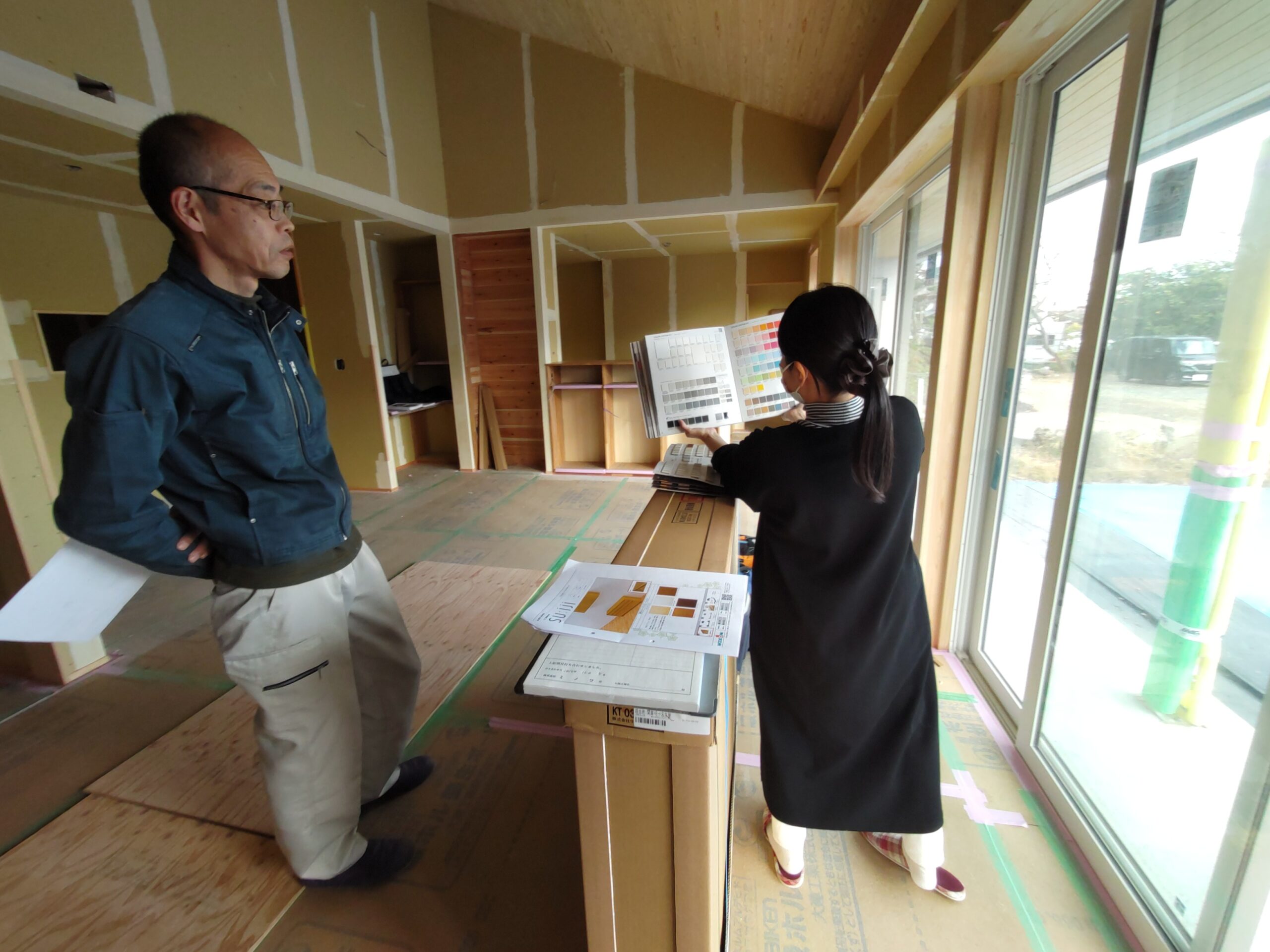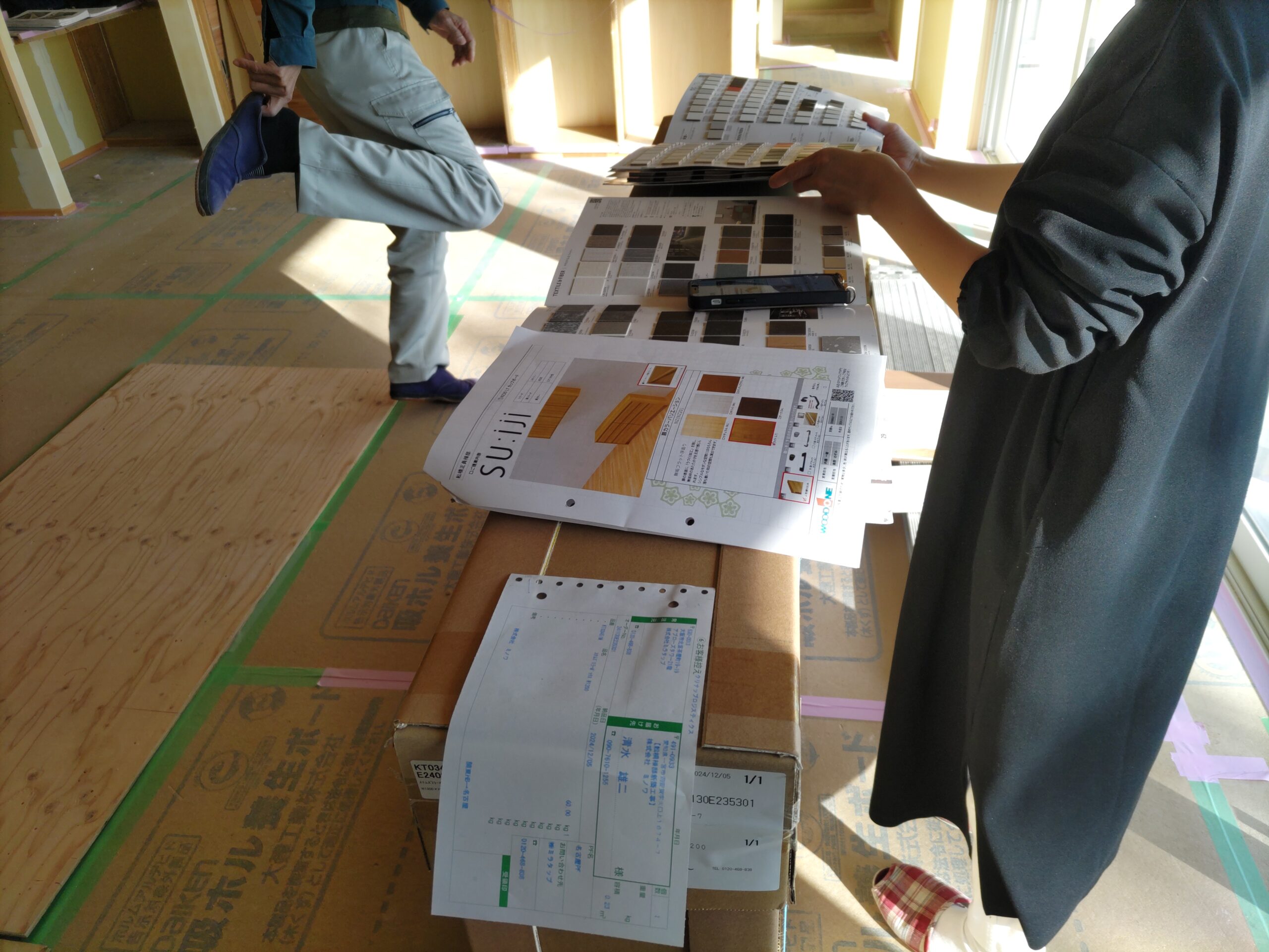 クロス下地処理工事の傍ら、現場内でf様とf二木工さんと家具のお打ち合せ。表面材のカラーサンプルを確認しながらどの色が良いかを検討していきます。