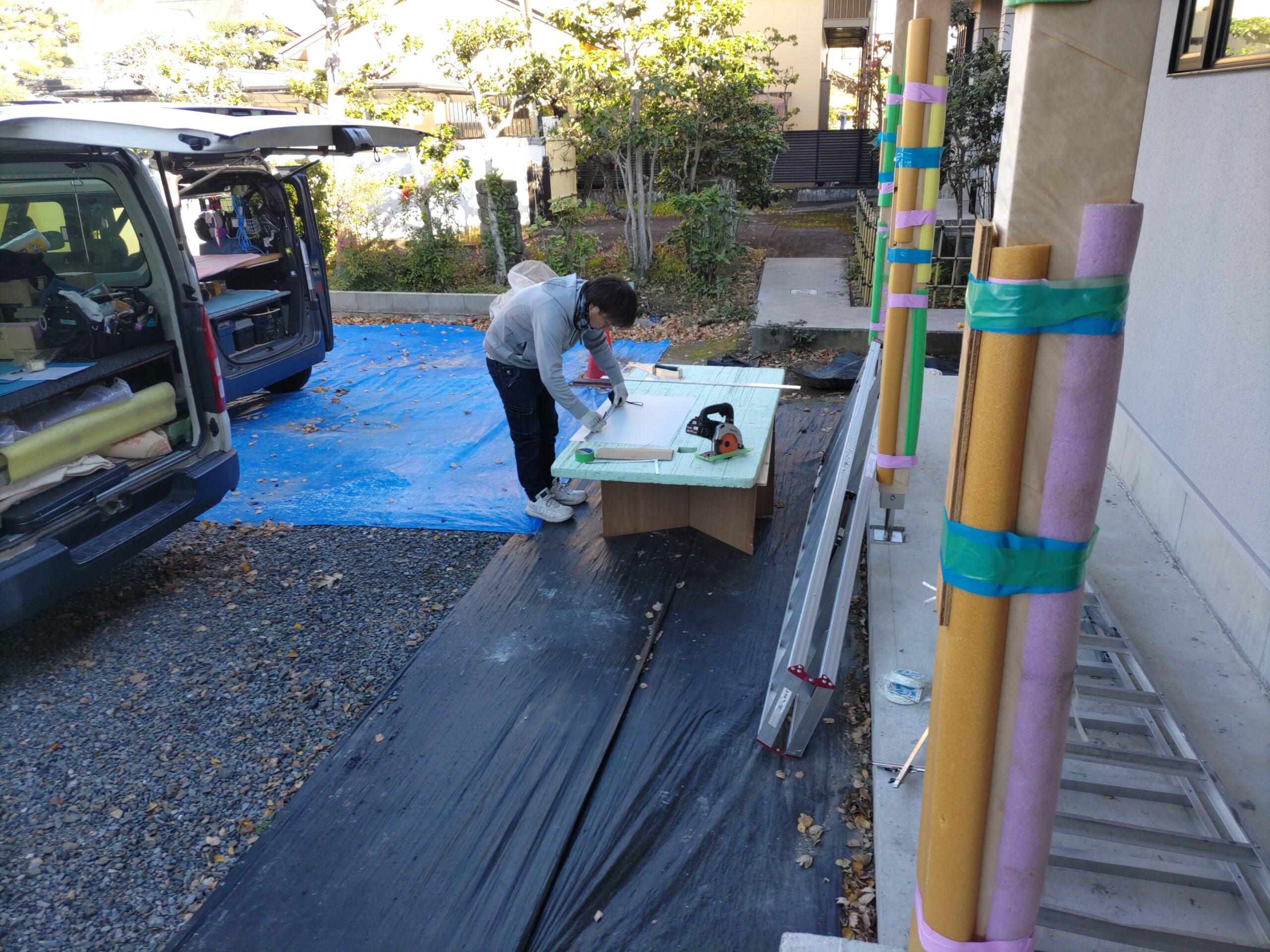 残暑がまだまだ厳しい屋外ではy江板金さんが雨樋の取付を行いました。こんな日に限って空調服を忘れたy江さん、北側の軒下とは言え熱中症警戒レベルの猛暑の中重装備で仕事をしています。